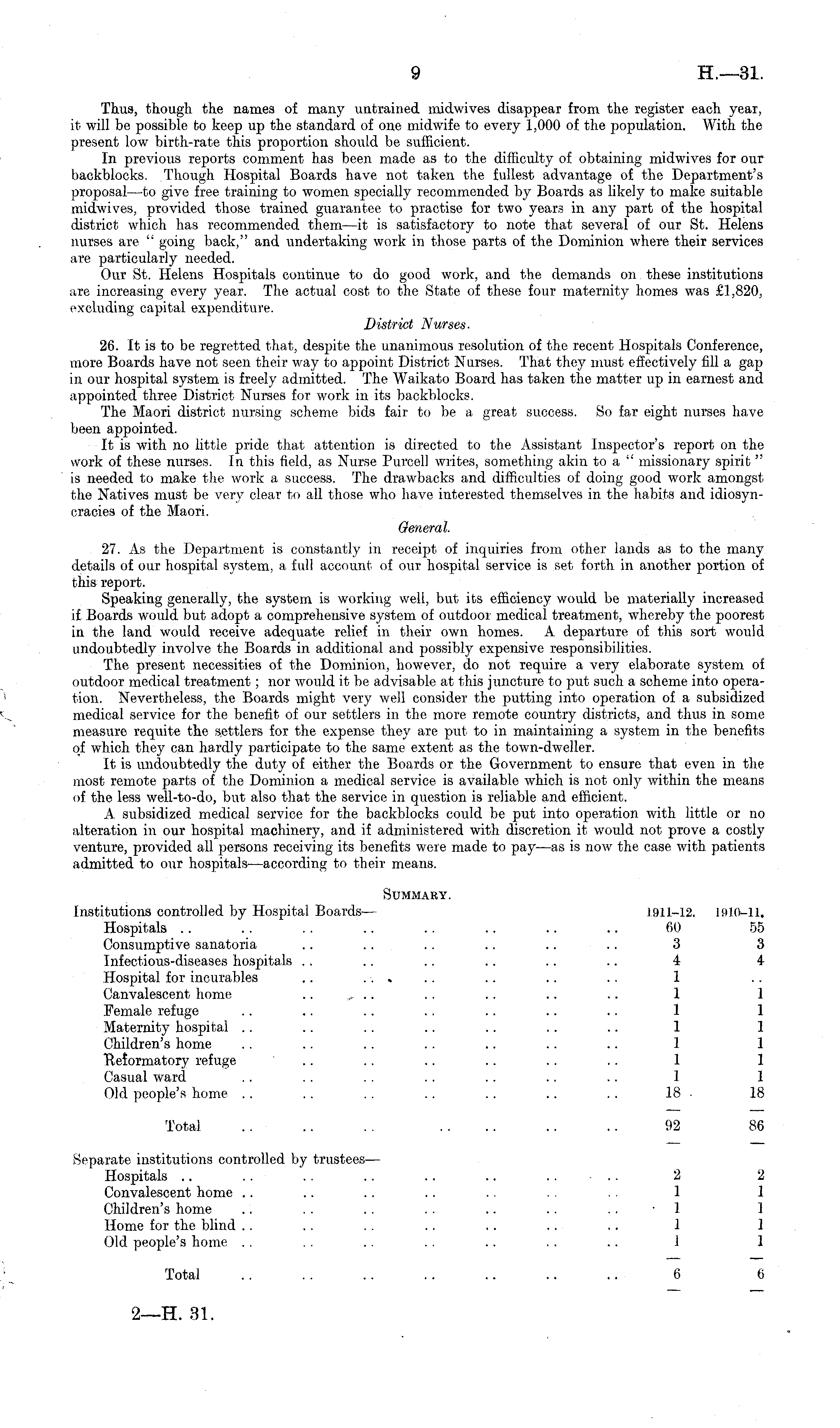Thus, though the names of many untrained midwives disappear from the register each year, it will be possible to keep up the standard of one midwife to every 1,000 of the population. With the present low birth-rate this proportion should be sufficient. In previous reports comment has been made as to the difficulty of obtaining midwives for our backblocks. Though Hospital Boards have not taken the fullest advantage of the Department's proposal —to give free training to women specially recommended by Boards as likely to make suitable midwives, provided those trained guarantee to practise for two years in any part of the hospital district which has recommended them —it is satisfactory to note that several of our St. Helens nurses are " going back," and undertaking work in those parts of the Dominion where their services are particularly needed. Our St. Helens Hospitals continue to do good work, and the demands on these institutions are increasing every year. The actual cost to the State of these four maternity homes was £1,820, excluding capital expenditure. District Nurses. 26. It is to be regretted that, despite the unanimous resolution of the recent Hospitals Conference, more Boards have not seen their way to appoint District Nurses. That they must effectively fill a gap in our hospital system is freely admitted. The Waikato Board has taken the matter up in earnest and appointed three District Nurses for work in its backblocks. The Maori district nursing scheme bids fair to be a great success. So far eight nurses have been appointed. It is with no little pride that attention is directed to the Assistant Inspector's report on the work of these nurses. In this field, as Nurse Purcell writes, something akin to a " missionary spirit " is needed to make the work a success. The drawbacks and difficulties of doing good work amongst the Natives must be very clear to all those who have interested themselves in the habits and idiosyncracies of the Maori. General. 27. As the Department is constantly in receipt of inquiries from other lands as to the many details of our hospital system, a full account of our hospital service is set forth in another portion of this report. Speaking generally, the system is working well, but its efficiency would be materially increased if Boards would but adopt a comprehensive system of outdoor medical treatment, whereby the poorest in the land would receive adequate relief in their own homes. A departure of this sort would undoubtedly involve the Boards in additional and possibly expensive responsibilities. The present necessities of the Dominion, however, do not require a very elaborate system of outdoor medical treatment; nor would it be advisable at this juncture to put such a scheme into operation. Nevertheless, the Boards might very well consider the putting into operation of a subsidized medical service for the benefit of our settlers in the more remote country districts, and thus in some measure requite the settlers for the expense they are put to in maintaining a system in the benefits of which they can hardly participate to the same extent as the town-dweller. It is undoubtedly the duty of either the Boards or the Government to ensure that even in the most remote parts of the Dominion a medical service is available which is not only within the means of the less well-to-do, but also that the service in question is reliable and efficient. A subsidized medical service for the backblocks could be put into operation with little or no alteration in our hospital machinery, and if administered with discretion it would not prove a costly venture, provided all persons receiving its benefits were made to pay —as is now the case with patients admitted to our hospitals' —according to their means. Summary. Institutions controlled by Hospital Boards' — 1911-12. 1910-11. Hospitals .. .. .. .. .. .. .. .. 60 55 Consumptive sanatoria .. . . .. .. .. .. 3 3 Infectious-diseases hospitals . . .. . . .. .. .. 4 4 Hospital for incurables .. ... .. . . .. .. 1 Canvalescent home .. , .. .. .. .. .. 1 1 Female refuge .. .. .. . . .. .. . . 1 1 Maternity hospital .. .. .. .. .. .. .. 1 1 Children's home .. .. .. .. .. .. .. 1 1 "Reformatory refuge .. .. .. .. .. .. 1 1 Casual ward .. .. .. .. .. .. .. 1 1 Old people's home . . . . . . . . .. .. .. 18 • 18 Total .. .. .. .... .. .. 92 86 Separate institutions controlled by trustees — Hospitals .. .. .. .. .. .. .. .. 2 2 Convalescent home .. .. .. .. .. .. .. 1 1 Children's home .. .. .. .. .. .. .. -1 1 Home for the blind .. .. .. .. .. .. .. 1 1 Old people's home . . . . .. .. .. . . .. 1 1 Total .. .. 6 6