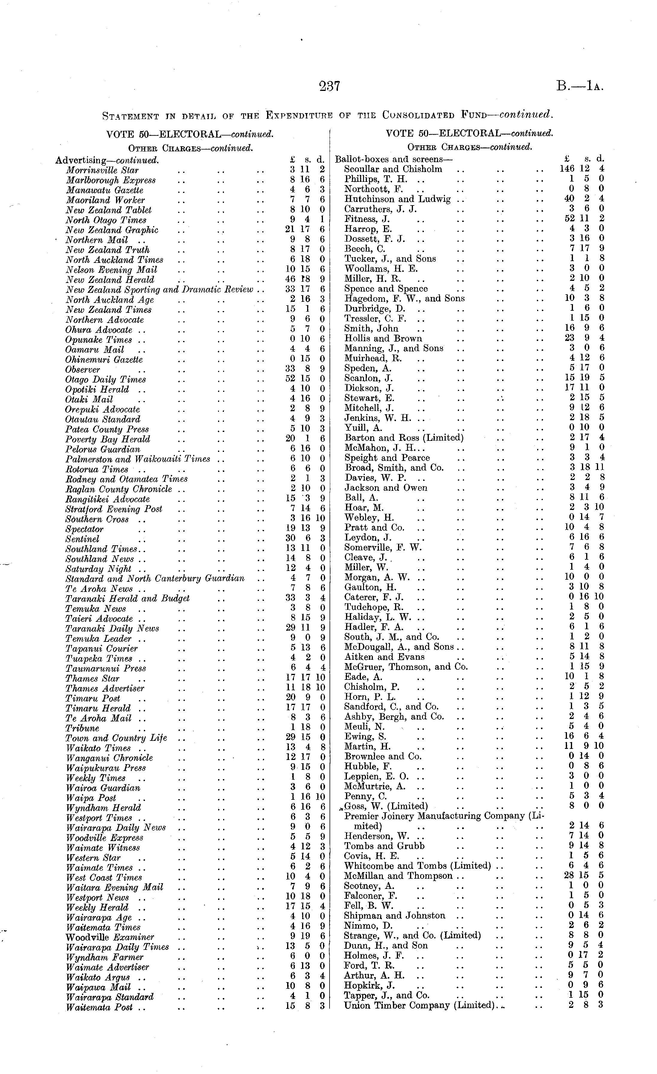 Statement in detail of the Expenditure of the Consolidated Fund — continued. VOTE 50—ELECTORAL— continued. VOTE 50—ELECTORAL— continued. Othek Charges— continued. Other Charges— continued. Advertising— continued. £ s. d. Ballot-boxes and screens— £ s. d. Morrinsville Star .. .. .. 311 2 Scoullar and Chisholm .. .. .. 146 12 4 Marlborough Express .. .. .. 816 6 Phillips, T. H. .. .. .. .. 15 0 Manawatu Gazette .. .. .. 4 6 3 Northoott, F. .. .. .. .. 0 8 0 Maoriland Worker .. .. .. 7 7 6 Hutchinson and Ludwig .. .. .. 40 2 4 New Zealand Tablet .. .. .. 810 0 j Carruthers, J. J. .. .. .. 3 6 0 North Otago Times .. .. .. 9 4 1 Fitness, J. .. .. .. .. 52 11 2 New Zealand Graphic .. .. .. 21 17 6 Harrop, E. .. .. .. .. 4 3 0 ■ Northern Mail .. .. .. ■■ 9 8 6 Dossett, F. J. .. .. .. .. 316 0 New Zealand Truth .. .. .. 817 0 Beech, C. .. .. .. .. 717 9 North Auckland Times .. .. ■ ■ 618 0 Tucker, J., and Sous .. .. .. 118 Nelson Evening Mail .. .. . . 10 15 6 Woollams, H. E. .. .. .. 3 0 0 New Zealand Herald .. .. .. 46 18 9 Miller, H. R. .. .. .. .. 210 0 New Zealand Sporting and Dramatic Review .. 33 17 6 Spence and Spence .. .. .. 4 5 2 North Auckland Age .. .. .. 216 3 Hagedom, F. W., and Sons .. .. 10 3 8 New Zealand Times .. .. .. 15 16 Durbridge, D. .. .. .. .. 16 0 Northern Advocate .. .. .. 9 6 0 Tressler, C. F. .. .. .. .. 115 0 Ohura Advocate .. .. .. .. 5 7 0 Smith, John .. .. .. .. 16 9 6 Opunake Times .. .. .. . . 010 6 Hollis and Brown .. .. .. 23 9 4 Oamaru Mail .. .. . ■ .. 4 4 6 Manning, J., and Sons .. .. .. 3 0 6 Ohinemuri Gazette .. .. .. 015 0 Muirhead, R. .. .. .. .. 412 6 Observer .. .. .. ■■ 33 8 9 Speden, A. .. .. .. .. 5 17 0 Otago Daily Times .. . . . . 52 15 0 Scanlon, J. .. .. .. .. 15 19 5 Opotiki Herald .. .. ■ ■ ■ ■ 410 0 Dickson, J. .. .. .. .. 17 11 0 Otaki Mail .. .. .. .. 416 0 Stewart, E. .. .. .-. .. 215 5 Orepuki Advocate .. .. ■■ 2 8 9 Mitchell, J. .. .. .. .. 9L2 6 Otautau Standard .. .. ■■ 4 9 3 Jenkins, W. H. .. .. .. .. 218 5 Patea County Press .. .. .. 510 3 Yuffl, A. .. .. .. .. 010 0 Poverty Bay Herald .. .. .. 20 1 6 Barton and Ross (Limited) .. .. 217 4 Pelorus Guardian .. .. .. 616 0 McMahon, J. H... .. .. .. 9 10 Palmerston and Waikouaiti Times .. .. 6 10 0 Speight and Pearce .. .. .. 3 3 4 Rotorua Times .. .. .. .. 6 6 0 Broad, Smith, and Co. .. .. .. 318 11 Rodney and Otamatea Times .. .. 2 13 Da vies, W. P. .. .. .. .. 2 2 8 Raglan County Chronicle .. .. .. 210 0 Jackson and Owen .. .. .. 3 4 9 Rangitikei Advocate .. .. .. 15 3 9 Ball, A. .. .. .. .. 811 6 Stratford Evening Post .. .. .. 714 6 Hoar, M. .. .. .. .. 2 310 Southern Cross .. .. .. ■■ 316 10 Webley, H. .. .. .. .. 014 7 Spectator .. .. .. .. 19 13 9 Pratt and Co. .. .. .. .. 10 4 8 Sentinel .. .. .. ■■ 30 6 3 Leydon, J. .. .. .. .. 6 16 6 Southland Times.. .. .. .. 13 11 0 Somerville, F. W. .. .. .. 7 6 8 Southland News .. .. .. .. 14 8 0 Cleave, J. . .. .. .. .. 6 16 Saturday Night .. .. .. .. 12 4 0 Miller, W. .. .. .. .. 14 0 Standard and North Canterbury Guardian .. 4 7 0 Morgan, A. W. .. .. .. .. 10 0 0 Te Aroha News .. ..' .. .. 786 Gaulton, H. .. .. .. .. 310 8 Taranaki Herald and Budget .. .. 33 3 4 Caterer, F. J. .. .. .. .. 016 10 Temuka News .. .. .. .. 3 8 0 Tud.ehope, R. .. .. .. .. 18 0 Taieri Advocate .. .. .. .. 8 15 9 Haliday, L. W. .. .. .. .. 2 5 0 Taranaki Daily News .. .. .. 29 11 9 Hadler, F. A. .. .. .. .. 6 16 Temulca Leader .. .. .. .. 9 0 9 South, J. M., and Co. .. .. .. 12 0 Tapanui Courier .. .. .. 513 6 McDongall, A., and Sons.. .. .. 811 8 Tuapeka Times .. .. .. .. 4 2 0 Aitken and Evans .. .. .. 514 8 Taumarunui Press .. .. .. 6 4 4 McGruer, Thomson, and Co. .. .. 115 9 Thames Star .. .. .. ■■ 17 17 10 Eade, A. .. .. .. .. 10 1 8 Thames Advertiser .. .. .. 1118 10 Chisholm, P. .. .. .. .. 2 5 2 Timaru Post .. .. .. .. 20 9 0 Horn, P. L. .. .. .. .. 1 12 9 Timaru Herald .. .. .. .. 17 17 0 Sandford, C, and Co. .. .. 13 5 Te Aroha Mail .. .. .. ■■ 8 3 6 Ashby, Bergh, and Co. .. .. .. 2 4 6 Tribune .. ... .. .. 1 18 0 Meuli, N. .. .. .. .. 540 Town and Country Life .. .. .. 29 15 0 Ewing, S. .. .. .. .. 16 6 4 Waikato Times .. .. .. .. 13 4 8 Martin, H. .. .. .. .. 11 910 Wanganui Chronicle .. ..- .. 12 17 0 Brownlee and Co. .. .. .. 014 0 Waipukurau Press .. .. .. 915 0 Hubble, F. .. .. .. .. 0 8 6 Weekly Times .. .. .. .. 18 0 Leppien, E. O. .. .. .. .. 30 0 Wairoa Guardian .. .. .. 3 6 0 McMurtrie, A. .. .. .. .. 10 0 Waipa Post .. .. .. .. 116 10 Penny, C. .. .. .. .. 53 4 Wyndham Herald .. .. .. 616 6 ~Goss, W. (Limited) .. .. .. 8 0 0 Westport Times .. .. .. .. 6 3 6 Premier Joinery Manufacturing Company (LiWairarapa Daily News .. .. .. 9 0 6 mited) .. .. .. .. 214 6 Woodville Express .. .. .. 5 5 9 Henderson, W. .. .. .. .. 714 0 Waimate Witness .. .. .. 412 3 Tombs and Grubb .. .. .. 914 8 Western Star .. .. .. .. 514 0 Covia, H. E. .. .. .. .. 15 6 Waimate Times .. .. .. .. 6 2 6 Whitcombe and Tombs (Limited) .. .. 6 4 6 West Coast Times .. .. ■■ 10 4 0 McMillan and Thompson .. .. .. 28 15 5 Waitara Evening Mail .. .. .. 7 9 6 Scotney, A. .. .. .. .. 10 0 Westport News .. .. .. .. 10 18 0 Falconer, F. .. .. .. .. 15 0 Weekly Herald .. .. ' .. .. 17 15 4 Fell, B. W 05 3 Wairarapa Age .. .. .. ■ ■ 410 0 Shipman and Johnston .. .. .. 014 6 Waitemata Times .. .. .. 416 9 Nimmo, D. .. .. .. .. 2 6 2 Woodville Examiner .. .. .. 919 6 Strange, W., and Co. (Limited) .. .. 8 8 0 Wairarapa Daily Times .. .. i. 13 5 0 Dunn, H., and Son .. .. .. 95 4 Wyndham Farmer .. .. ■■ 60 0 Holmes, J. F. .. .. .. .. 017 2 Waimate Advertiser .. .. .. 613 0 Ford, T. R. .. .. .. .. 5 5 0 Waikato Argus .. .. .. ■■ 63 4 Arthur, A. H. .. .. .. ... 97 0 Waipawa Mail .. .. .. ■■ 10 8 0 Hopkirk, J. .. .. .. .. 09 6 Wairarapa Standard .. .. .. 4 10 Tapper, J., and Co. .. .. .. 115 0 Waitemata Post .. .. ■■ ■. 15 8 3 Union Timber Company (Limited). _ .. 2 8 3