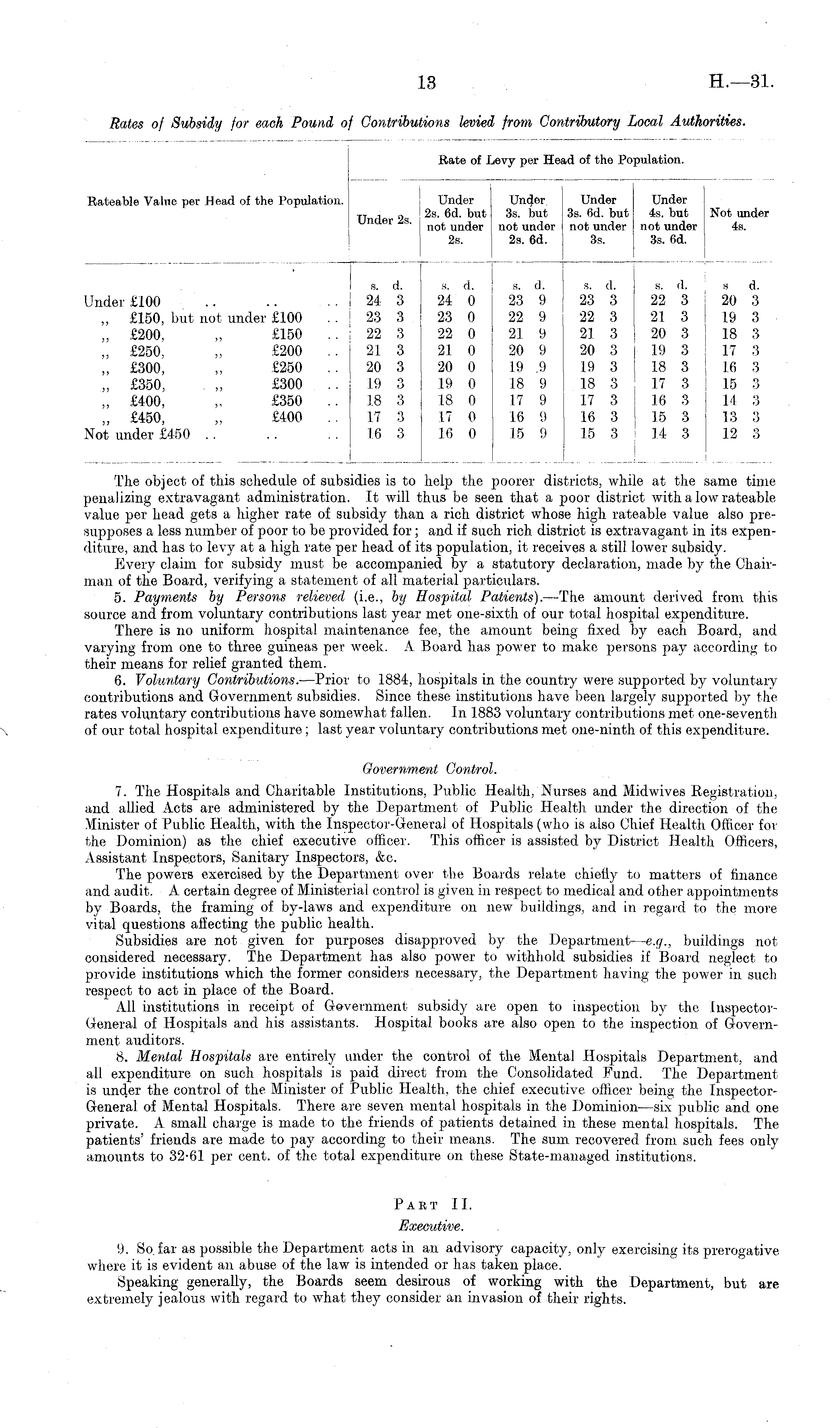 The object of this schedule of subsidies is to help the poorer districts, while at the same time penalizing extravagant administration. It will thus be seen that a poor district with a low rateable value per head gets a higher rate of subsidy than a rich district whose high rateable value also presupposes a less number of poor to be provided for; and if such rich district is extravagant in its expenditure, and has to levy at a high rate per head of its population, it receives a still lower subsidy. Every claim for subsidy must be accompanied by a statutory declaration, made by the Chairman of the Board, verifying a statement of all material particulars. 5. Payments by Persons relieved (i.e., by Hospital Patients). —The amount derived from this source and from voluntary contributions last year met one-sixth of our total hospital expenditure. There is no uniform hospital maintenance fee, the amount being fixed by each Board, and varying from one to three guineas per week. A Board has power to make persons pay according to their means for relief granted them. 6. Voluntary Contributions. —Prior to 1884, hospitals in the country were supported by voluntary contributions and Government subsidies. Since these institutions have been largely supported by the rates voluntary contributions have somewhat fallen. In 1883 voluntary contributions met one-seventh of our total hospital expenditure ; last year voluntary contributions met one-ninth of this expenditure. Government Control. 7. The Hospitals and Charitable Institutions, Public Health, Nurses and Midwives Registration, and allied Acts are administered by the Department of Public Health under the direction of the Minister of Public Health, with the Inspector-General of Hospitals (who is also Chief Health Officer for the Dominion) as the chief executive officer. This officer is assisted by District Health Officers, Assistant Inspectors, Sanitary Inspectors, &c. The powers exercised by the Department over the Boards relate chiefly to matters of finance and audit. A certain degree of Ministerial control is given in respect to medical and other appointments by Boards, the framing of by-laws and expenditure on new buildings, and in regard to the more vital questions affecting the public health. Subsidies are not given for purposes disapproved by the Department — e.g., buildings not considered necessary. The Department has also power to withhold subsidies if Board neglect to provide institutions which the former considers necessary, the Department having the power in such respect to act in place of the Board. All institutions in receipt of Government subsidy are open to inspection by the InspectorGeneral of Hospitals and his assistants. Hospital books are also open to the inspection of Government auditors. 8. Mental Hospitals are entirely under the control of the Mental Hospitals Department, and all expenditure on such hospitals is paid direct from the Consolidated Fund. The Department is under the control of the Minister of Public Health, the chief executive officer being the InspectorGeneral of Mental Hospitals. There are seven mental hospitals in the Dominion—six public and one private. A small charge is made to the friends of patients detained in these mental hospitals. The patients' friends are made to pay according to their means. The sum recovered from such fees only amounts to 32-61 per cent, of the total expenditure on these State-managed institutions. Part 11. Executive. 9. So far as possible the Department acts in an advisory capacity, only exercising its prerogative where it is evident an abuse of the law is intended or has taken place. Speaking generally, the Boards seem desirous of working with the Department, but are extremely jealous with regard to what they consider an invasion of their rights.