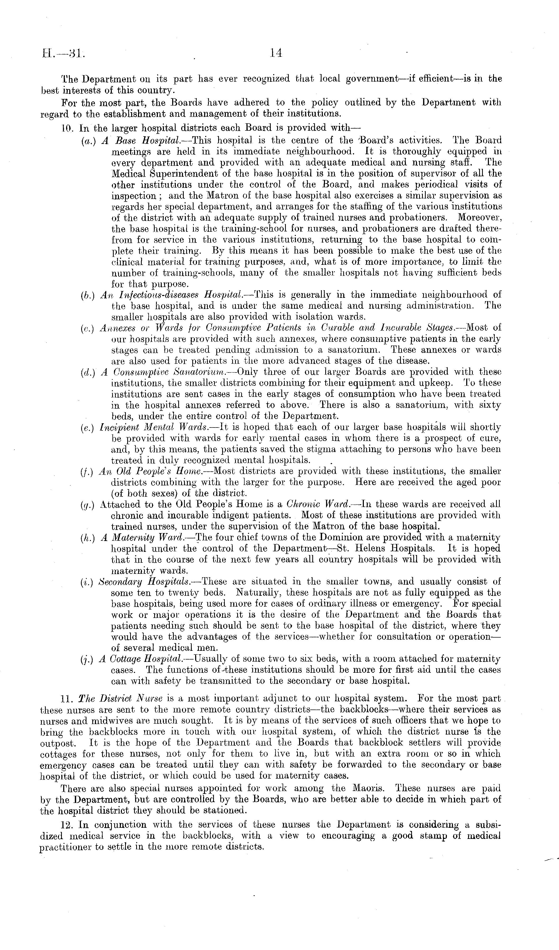 The Department on its part has over recognized that local government —if efficient —is in the best interests of this country. For the most part, the Boards have adhered to the policy outlined by the Department with regard to the establishment and management of their institutions. 10. In the larger hospital districts each Board is provided with — (a.) A Base Hospital. —This hospital is the centre of the 'Board's activities. The Board meetings are held in its immediate neighbourhood. It is thoroughly equipped in every department and provided with an adequate medical and nursing staff. The Medical Superintendent of the base hospital is in the position of supervisor of all the other institutions under the control of the Board, and makes periodical visits of inspection ; and the Matron of the base hospital also exercises a similar supervision as regards her special department, and arranges for the staffing of the various institutions of the district with ail adequate supply of trained nurses and probationers. Moreover, the base hospital is the training-school for nurses, and probationers are drafted therefrom for service in the various institutions, returning to the base hospital, to complete their training. By this means it has been possible to make the best use of the clinical material for training purposes, and, what is of more importance, to limit tin , number of training-schools, many of the smaller hospitals not having sufficient beds for that purpose. (b.) An Infectious-diseases Hospital. —This is generally in the immediate neighbourhood, of the base hospital, and is under the same medical and nursing administration. The smaller hospitals are also provided with, isolation wards. (c.) Annexes or Wards for Consumptive Patients in Curable and Incurable Stages. —Most of our hospitals are provided with such annexes, where consumptive patients in the early stages can be treated pending admission to a sanatorium. These annexes or wards are also used for patients in the more advanced stages of the disease. (f/,.) A Consumptive Sanatorium. —Only three of our larger Boards are provided with these institutions, the smaller districts combining for their equipment and upkeep. To these institutions are sent cases in the early stages of consumption who have been treated in the hospital annexes referred to above. There is also a sanatorium, with sixty beds, under the entire control of the Department. (c.) Incipient Mental Wards. —It is hoped that each of our larger base hospitals will shortly be provided with wards for early mental cases in whom there is a prospect of cure, and, by this means, the patients saved the stigma attaching to persons who have been treated in duly recognized mental hospitals. (/.) An Old People's Home. —Most districts are provided with these institutions, the smaller districts combining with the larger for the purpose. Here are received the aged pool' (of both sexes) of the district. ((/.) Attached to the Old People's Home is a Chronic Ward. —In these wards are received all chronic and incurable indigent patients. Most of these institutions are provided with trained nurses, under the supervision of the Matron of the base hospital. (//.) A Maternity Ward. —The four chief towns of the Dominion are provided with a maternity hospital under the control of the Department —St. Helens Hospitals. It is hoped that in the course of the next few years all country hospitals will be provided with maternity wards. (i.) Secondary Hospitals. —These are situated in the smaller towns, and usually consist of some ten to twenty beds. Naturally, these hospitals are not as fully equipped as the base hospitals, being used more for cases of ordinary illness or emergency. For special work or major operations it is the desire of the Department and the Boards that patients needing such should be sent to the base hospital of the district, where they would have the advantages of the services—whether for consultation or operation— of several medical men. (j.) A Cottage Hospital. —Usually of some two to six beds, with a room attached for maternity cases. The functions of these institutions should be more for first aid until the cases can with safety be transmitted to the secondary or base hospital. 11. The District Nurse is a most important adjunct to our hospital system. For the most part these nurses are sent to the more remote country districts —the backblooks—where their services as nurses and midwives are much sought. It is by means of the services of such officers that we hope to bring the backblocks more in touch with our hospital system, of which the district nurse is the outpost. It is the hope of the Department and the Boards that backblock settlers will provide. cottages for these nurses, not only for them to live in, but with an extra room or so in which emergency oases can be treated until they can with safety be forwarded to the secondary or base hospital of the district, or which could be used for maternity cases. There arc also special nursus appointed for work among the Maoris. These nurses are paid by the Department, but are controlled by the Boards, who are better able to decide in which part of the hospital district they should be stationed. 12. In conjunction with the services of these nurses the Department is considering a subsidized medical service in the backblocks, with a view to encouraging a good stamp of medical practitioner to settle in the more remote districts.