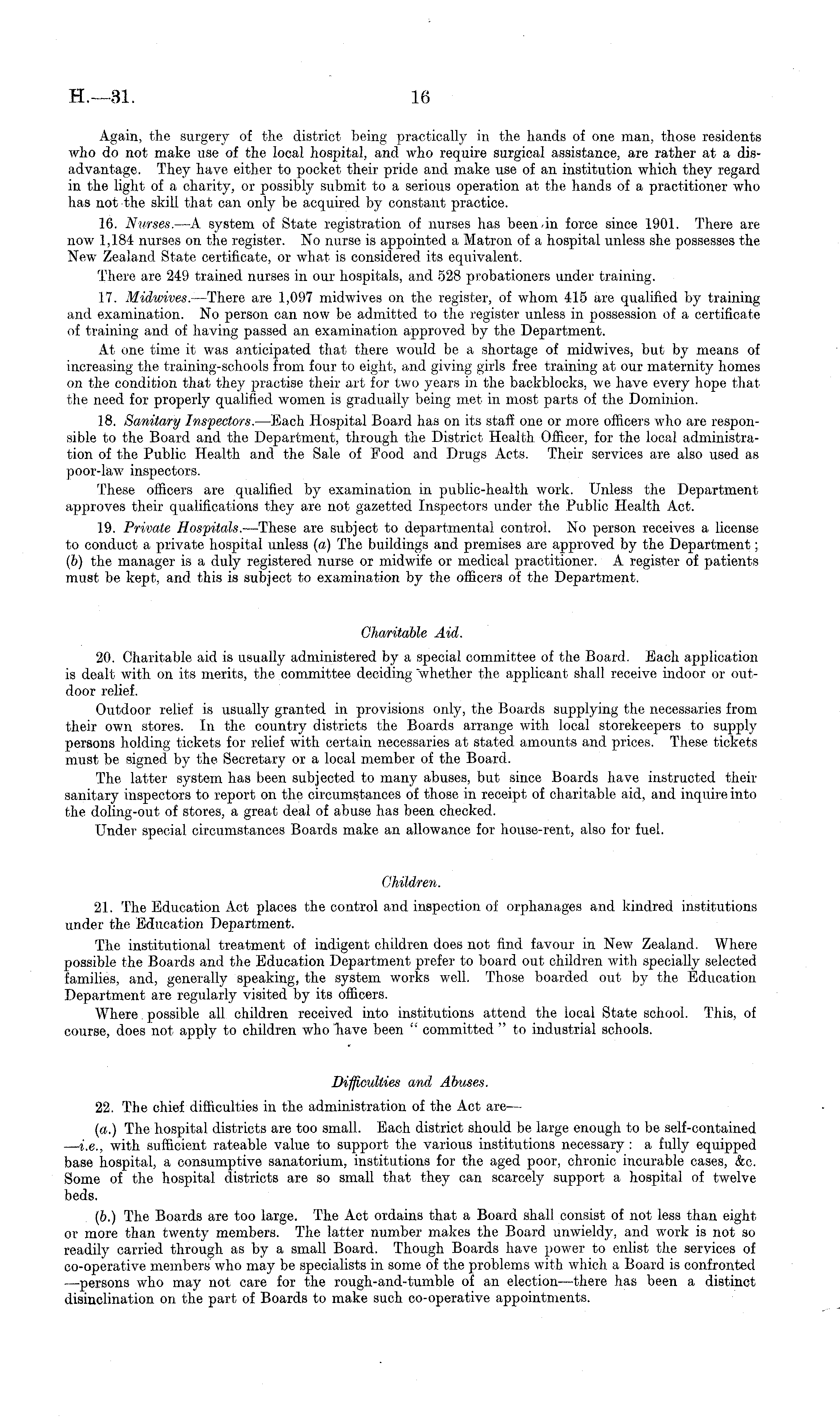 Again, the surgery of the district being practically in the hands of one. man, those residents who do not make use of the local hospital, and who require surgical assistance, are rather at a disadvantage. They have either to pocket their pride and make use of an institution which they regard in the light of a charity, or possibly submit to a serious operation at the hands of a practitioner who has not the skill that can only be acquired by constant practice. 16. Nurses. —A system of State registration of nurses has been-in force since 1901. There are now 1,184 nurses on the register. No nurse is appointed a Matron of a hospital unless she possesses the New Zealand State certificate, or what is considered its equivalent. There are 249 trained nurses in our hospitals, and 528 probationers under training. 17. Midwives. —There are 1,097 midwives on the register, of whom 415 are qualified by training and examination. No person can now be admitted to the register unless in possession of a certificate of training and of having passed an examination approved by the Department. At one time it was anticipated that there would be a shortage of midwives, but by means of increasing the training-schools from four to eight, and giving girls free training at our maternity homes on the condition that they practise their art for two years in the backblocks, we have every hope that the need for properly qualified women is gradually being met in most parts of the Dominion. 18. Sanitary Inspectors. —Each Hospital Board has on its staff one or more officers who are responsible to the Board and the Department, through the District Health Officer, for the local administration of the Public Health and the Sale of Food and Drugs Acts. Their services are also used as poor-law inspectors. These officers are qualified by examination in public-health work. Unless the Department approves their qualifications they are not gazetted Inspectors under the Public Health Act. 19. Private Hospitals. —These are subject to departmental control. No person receives a license to conduct a private hospital unless («) The buildings and premises are approved by the Department; (b) the manager is a duly registered nurse or midwife or medical practitioner. A register of patients must be kept, and this is subject to examination by the officers of the Department. Charitable Aid. 20. Charitable aid is usually administered by a special committee of the Board. Each application is dealt with on its merits, the committee deciding "whether the applicant shall receive indoor or outdoor relief. Outdoor relief is usually granted in provisions only, the Boards supplying the necessaries from their own stores. In the country districts the Boards arrange with local storekeepers to supply persons holding tickets for relief with certain necessaries at stated amounts and prices. These tickets must be signed by the Secretary or a local member of the Board. The latter system has been subjected to many abuses, but since Boards have instructed their sanitary inspectors to report on the circumstances of those in receipt of charitable aid, and inquire into the doling-out of stores, a great deal of abuse has been checked. Under special circumstances Boards make an allowance for house-rent, also for fuel. Children. 21. The Education Act places the control and inspection of orphanages and kindred institutions under the Education Department. The institutional treatment of indigent children does not find favour in New Zealand. Where possible the Boards and the Education Department prefer to board out children with specially selected families, and, generally speaking, the system works well. Those boarded out by the Education Department are regularly visited by its officers. Where possible all children received into institutions attend the local State school. This, of course, does not apply to children who have been " committed " to industrial schools. Difficulties and Abuses. 22. The chief difficulties in the administration of the Act are— (a.) The hospital districts are too small. Each district should be large enough to be self-contained — i.e., with sufficient rateable value to support the various institutions necessary : a fully equipped base hospital, a consumptive sanatorium, institutions for the aged poor, chronic incurable cases, &c. Some of the hospital districts are so small that they can scarcely support a hospital of twelve beds. (6.) The Boards are too large. The Act ordains that a Board shall consist of not less than eight or more than twenty members. The latter number makes the Board unwieldy, and work is not so readily carried through as by a small Board. Though Boards have power to enlist the services of co-operative members who may be specialists in some of the problems with which a Board is confronted —persons who may not care for the rough-and-tumble of an election—there has been a distinct disinclination on the part of Boards to make such co-operative appointments.