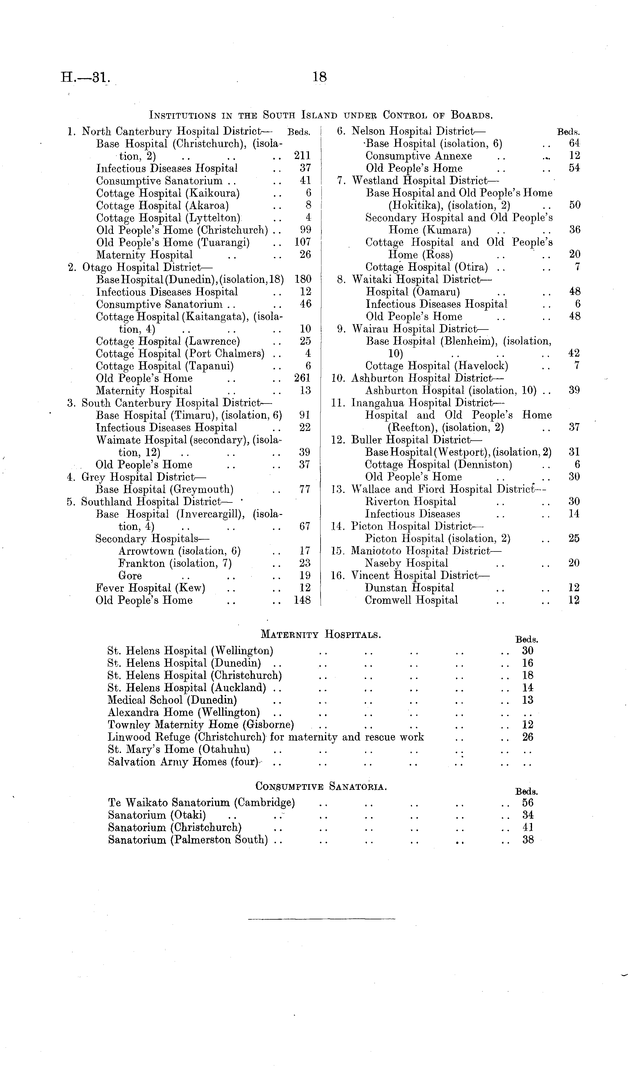 Institutions in the South Island under Control of Boabds. 1. North Canterbury Hospital District — Beds. I 6. Nelson Hospital District— Beds. Base Hospital (Christcliurch), (isola- -Base Hospital (isolation, 6) .. 64 tion, 2) .. .. .. 211 Consumptive Annexe .. ... 12 Infectious Diseases Hospital .. 37 Old People's Home .. .. 54 Consumptive Sanatorium . . .. 41 7. Westland Hospital District — Cottage Hospital (Kaikoura) .. 6 Base Hospital and Old People's Home Cottage Hospital (Akaroa) .. 8 (Hokitika), (isolation, 2) 50 Cottage Hospital (Lyttelton) .. 4 Secondary Hospital and Old People's Old People's Home (Christchurch) .. 99 | Home (Kumara) .. . . 36 Old People's Home (Tuarangi) . . 107 Cottage Hospital and Old People's Maternity Hospital .. .. 26 Home (Ross) .. ' .. 20 2. Otago Hospital District— Cottage Hospital (Otira) . . . . 7 Base Hospital (Dunedin), (isolation, 18) 180 8. Waitaki Hospital District— Infectious Diseases Hospital .. 12 Hospital (Oamaru) . . .. 48 Consumptive Sanatorium .. .. 46 Infectious Diseases Hospital . . 6 Cottage Hospital (Kaitangata), (isola- Old People's Home .. .. 48 tion, 4) .. . . 10 9. Wairau Hospital District — Cottage Hospital (Lawrence) .. 25 Base Hospital (Blenheim), (isolation, Cottage Hospital (Port Chalmers) .. 4 10) . . . . 42 Cottage Hospital (Tapanui) .. 6 Cottage Hospital (Havelock) . . 7 Old People's Home .. .. 261 I 10. Ashburton Hospital District — Maternity Hospital . . .. 13 Ashburton Hospital (isolation, 10) .. 39 3. South Canterbury Hospital District — 11. Inangahua Hospital District— Base Hospital (Timaru), (isolation, 6) 91 i Hospital and Old People's Home Infectious Diseases Hospital .. 22 (Reefton), (isolation, 2) .. 37 Waimate Hospital (secondary), (isola- 12. Buller Hospital District — tion, 12) .. .. .. 39 ; Base Hospital (Westport), (isolation, 2) 31 Old People's Home .. .. 37 Cottage Hospital (Denniston) . . 6 4. Grey Hospital District — Old People's Home .. .. 30 Base Hospital (Greymouth) . . 77 13. Wallace and Fiord Hospital District — 5. Southland Hospital District — ' Riverton Hospital .. . . 30 Base Hospital (Invercargill), (isola- Infectious Diseases .. .. 14 tion, 4) .. .. 67 14. Picton Hospital District — Secondary Hospitals — Picton Hospital (isolation, 2) 25 Arrowtown (isolation, 6) 17 15. Maniototo Hospital District — Frankton (isolation, 7) 23 Naseby Hospital . . . . 20 Gore .. .. 19 16. Vincent Hospital District — Fever Hospital (Kew) .. .. 12 Dunstan Hospital .. . . 12 Old People's Home .. .. 148 Cromwell Hospital . . .. 12 Maternity Hospitals. Bedg St. Helens Hospital (Wellington) .. .. .. .. .. 30 St. Helens Hospital (Dunedin) .. .. .. . . .. 16 St. Helens Hospital (Christchurch) .. .. .. .. 18 St. Helens Hospital (Auckland) .. .. .. .. .. 14 Medical School (Dunedin) .. .. .. .. .. .. 13 Alexandra Home (Wellington) .. .. .. .. .. .... Townley Maternity Home (Gisborne) .. .. .. .. 12 Linwood Refuge (Christchurch) for maternity and rescue work . . 26 St. Mary's Home (Otahuhu) .. . . ' .. .. .. .... Salvation Army Homes (four) .. .. .. .. ..' .... Consumptive Sanatoria. Beda Te Waikato Sanatorium (Cambridge) .. .. .. .. .. 56 Sanatorium (Otaki) .. .. .. .. .. .. 34 Sanatorium (Christchurch) .. .. .. .. .. 41 Sanatorium (Palmerston South) .. .. .. .. .. .. 38