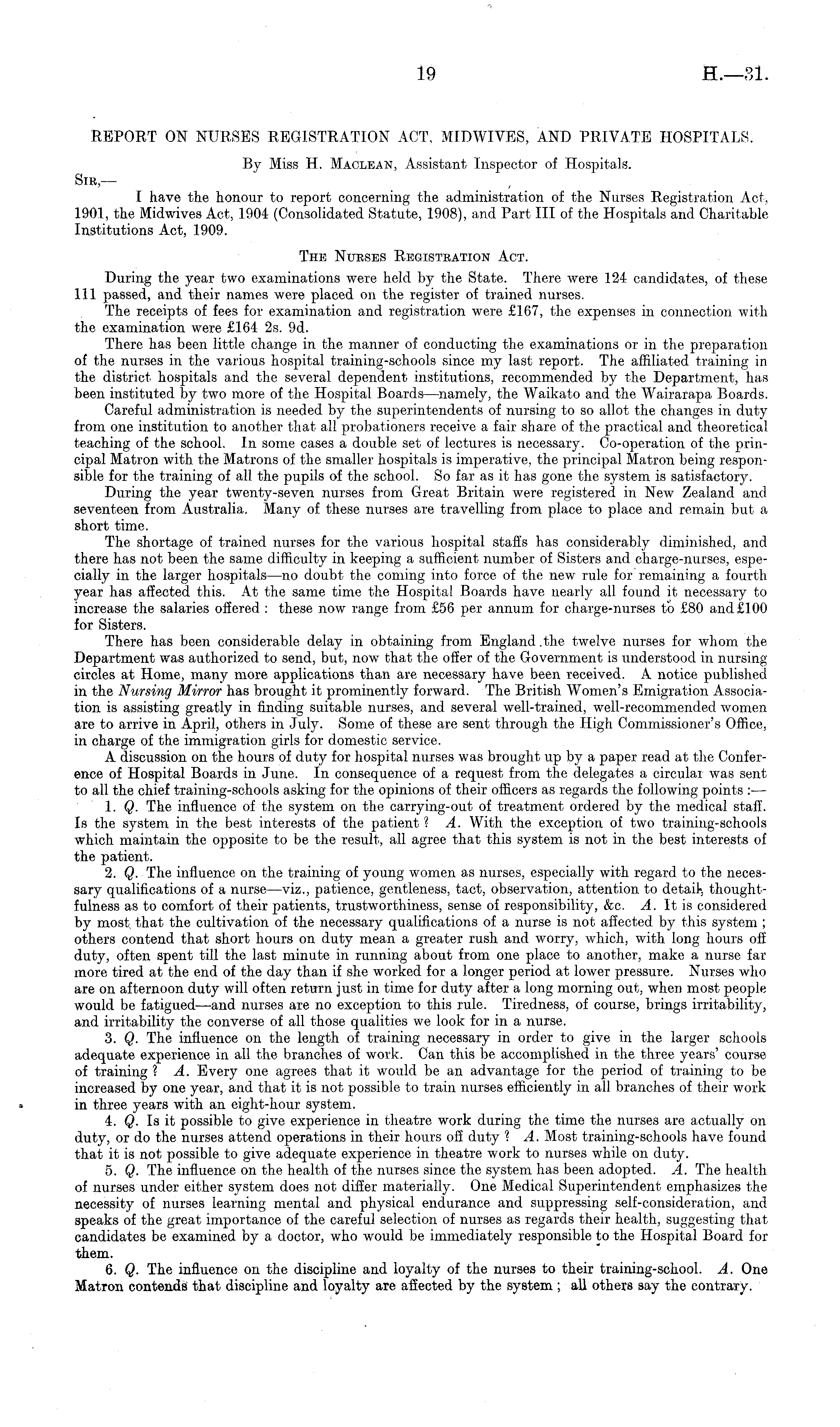 REPORT ON NURSES REGISTRATION ACT, MIDWIVES, AND PRIVATE HOSPITALS. By Miss H. Maclean, Assistant Inspector of Hospitals. Sir,— I have the honour to report concerning the administration of the Nurses Registration Act, 1901, the Midwives Act, 1904 (Consolidated Statute, 1908), and Part 111 of the Hospitals and Charitable Institutions Act, 1909. The Nurses Registration Act. During the year two examinations were held by the State. There were 124 candidates, of these 111 passed, and their names were placed on the register of trained nurses. The receipts of fees for examination and registration were £167, the expenses in connection with the examination were £164 2s. 9d. There has been little change in the manner of conducting the examinations or in the preparation of the nurses in the various hospital training-schools since my last report. The affiliated training in the district hospitals and the several dependent institutions, recommended by the Department, has been instituted by two more of the Hospital Boards —namely, the Waikato and the Wairarapa Boards. Careful administration is needed by the superintendents of nursing to so allot the changes in duty from one institution to another that all probationers receive a fair share of the practical and theoretical teaching of the school. In some cases a double set of lectures is necessary. Co-operation of the principal Matron with the Matrons of the smaller hospitals is imperative, the principal Matron being responsible for the training of all the pupils of the school. So far as it has gone the system is satisfactory. During the year twenty-seven nurses from Great Britain were registered in New Zealand and seventeen from Australia. Many of these nurses are travelling from place to place and remain but a short time. The shortage of trained nurses for the various hospital staffs has considerably diminished, and there has not been the same difficulty in keeping a sufficient number of Sisters and charge-nurses, especially in the larger hospitals —no doubt the coming into force of the new rule for remaining a fourth year has affected this. At the same time the Hospital Boards have nearly all found it necessary to increase the salaries offered : these now range from £56 per annum for charge-nurses to £80 and £100 for Sisters. There has been considerable delay in obtaining from England.the twelve nurses for whom the Department was authorized to send, but, now that the offer of the Government is understood in nursing circles at Home, many more applications than are necessary have been received. A notice published in the Nursing Mirror has brought it prominently forward. The British Women's Emigration Association is assisting greatly in finding suitable nurses, and several well-trained, well-recommended women are to arrive in April, others in July. Some of these are sent through the High Commissioner's Office, in charge of the immigration girls for domestic service. A discussion on the hours of duty for hospital nurses was brought up by a paper read at the Conference of Hospital Boards in June. In consequence of a request from the delegates a circular was sent to all the chief training-schools asking for the opinions of their officers as regards the following points : — 1. Q. The influence of the system on the carrying-out of treatment ordered by the medical staff. Is the system in the best interests of the patient ? A. With the exception of two training-schools which maintain the opposite to be the result, all agree that this system is not in the best interests of the patient. 2. Q. The influence on the training of young women as nurses, especially with regard to the necessary qualifications of a nurse —viz., patience, gentleness, tact, observation, attention to detail-, thoughtfulness as to comfort of their patients, trustworthiness, sense of responsibility, &c. A. It is considered by most that the cultivation of the necessary qualifications of a nurse is not affected by this system ; others contend that short hours on duty mean a greater rush and worry, which, with long hours off duty, often spent till the last minute in running about from one place to another, make a nurse far more tired at the end of the day than if she worked for a longer period at lower pressure. Nurses who are on afternoon duty will often return just in time for duty after a long morning out, when most people would be fatigued —and nurses are no exception to this rule. Tiredness, of course, brings irritability, and irritability the converse of all those qualities we look for in a nurse. 3. Q. The influence on the length of training necessary in order to give in the larger schools adequate experience in all the branches of work. Can this be accomplished in the three years' course of training ? A. Every one agrees that it would be an advantage for the period of training to be increased by one year, and that it is not possible to train nurses efficiently in all branches of their work in three years with an eight-hour system. 4. Q. Is it possible to give experience in theatre work during the time the nurses are actually on duty, or do the nurses attend operations in their hours off duty ? A. Most training-schools have found that it is not possible to give adequate experience in theatre work to nurses while on duty. 5. Q. The influence on the health of the nurses since the system has been adopted. A. The health of nurses under either system does not differ materially. One Medical Superintendent emphasizes the necessity of nurses learning mental and physical endurance and suppressing self-consideration, and speaks of the great importance of the careful selection of nurses as regards their health, suggesting that candidates be examined by a doctor, who would be immediately responsible to the Hospital Board for them. 6. Q. The influence on the discipline and loyalty of the nurses to their training-school. A. One Matron contends that discipline and loyalty are affected by