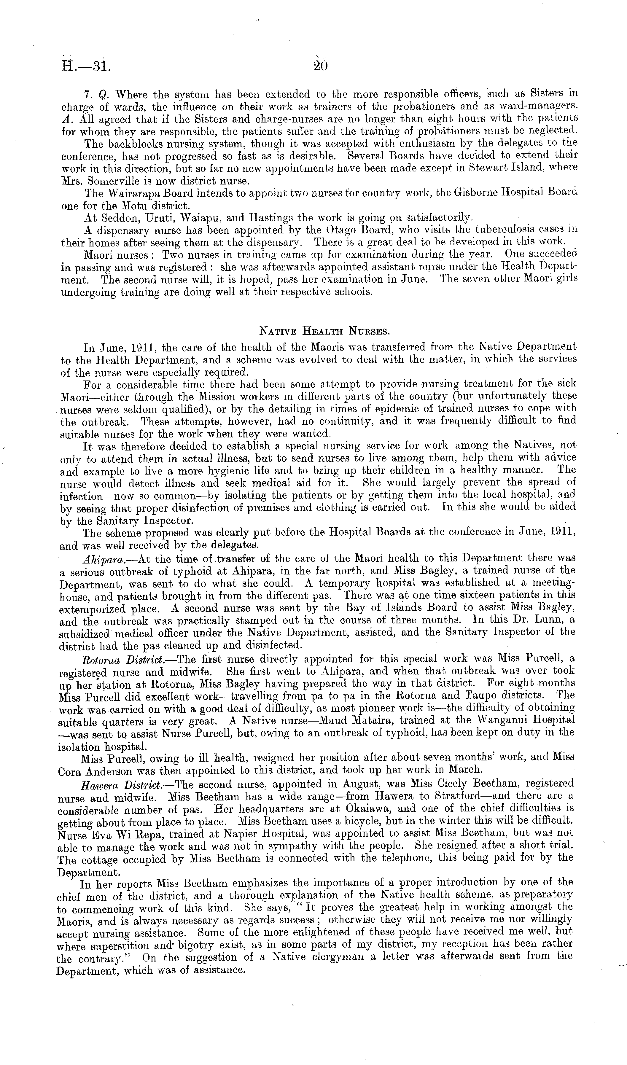 7. Q. Where the system has been extended to the more responsible officers, such as Sisters in charge of wards, the influence on their work as trainers of the probationers and as ward-managers. A. All agreed that if the Sisters and charge-nurses arc no longer than eight hours with the patients for whom they are responsible, the patients suffer and the training of probationers must be neglected. The backblocks nursing system, though it was accepted with enthusiasm by the delegates to the conference, has not progressed so fast as is desirable. Several Boards have decided to extend their work in this direction, but so far no new appointments have been made except in Stewart Island, where Mrs. Somerville is now district nurse. The Wairarapa Board intends to appoint two nurses for country work, the Gisborne Hospital Board one for the Motu district. At Seddon, Uruti, Waiapu, and Hastings the work is going on satisfactorily. A dispensary nurse has been appointed by the Otago Board, who visits the tuberculosis cases in their homes after seeing them at the dispensary. There is a great deal to be developed in this work. Maori nurses : Two nurses in training came up for examination during the year. One succeeded in passing and was registered ; she was afterwards appointed assistant nurse under the Health Department. The second nurse will, it is hoped, pass her examination in June. The seven other Maori girls undergoing training are doing well at their respective schools. Native Health Nurses. In June, 1911, the care of the health of the Maoris was transferred from the Native Department to the Health Department, and a scheme was evolved to deal with the matter, in which the services of the nurse were especially required. For a considerable time there had been some attempt to provide nursing treatment for the sick Maori —either through the Mission workers in different parts of the country (but unfortunately these nurses were seldom qualified), or by the detailing in times of epidemic of trained nurses to cope with the outbreak. These attempts, however, had no continuity, and it was frequently difficult to find suitable nurses for the work when they were wanted. It was therefore decided to establish a special nursing service for work among the Natives, not only to attend them in actual illness, but to send nurses to live among them, help them with advice and example to live a more hygienic life and to bring up their children in a healthy manner. The nurse would detect illness and seek medical aid for it. She would largely prevent the spread of infection —now so common —by isolating the patients or by getting them into the local hospital, and by seeing that proper disinfection of premises and clothing is carried out. In this she would be aided by the Sanitary Inspector. The scheme proposed was clearly put before the Hospital Boards at the conference in June, 1911, and was well received by the delegates. Ahipara. —At the time of transfer of the care of the Maori health to this Department there was a serious outbreak of typhoid at Ahipara, in the far north, and Miss Bagley, a trained nurse of the Department, was sent to do what she could. A temporary hospital was established at a meetinghouse, and patients brought in from the different pas. There was at one time sixteen patients in this extemporized place. A second nurse was sent by the Bay of Islands Board to assist Miss Bagley, and the outbreak was practically stamped out in the course of three months. In this Dr. Lunn, a subsidized medical officer under the Native Department, assisted, and the Sanitary Inspector of the district had the pas cleaned up and disinfected. Rolorua District. —The first nurse directly appointed for this special work was Miss Purcell, a registered nurse and midwife. She first went to Ahipara, and when that outbreak was over took up her station at Rotorua, Miss Bagley having prepared the way in that district. For eight months Miss Purcell did excellent work —travelling from pa to pa in the Rotorua and Taupo districts. The work was carried on with a good deal of difficulty, as most pioneer work is—the difficulty of obtaining suitable quarters is very great. A Native nurse —Maud Mataira, trained at the Wanganui Hospital was sent to assist Nurse Purcell, but, owing to an outbreak of typhoid, has been kept on duty in the isolation hospital. Miss Purcell, owing to ill health, resigned her position after about seven months' work, and Miss Cora Anderson was then appointed to this district, and took up her work in March. Hawera District. —The second nurse, appointed in August, was Miss Cicely Beetham, registered nurse and midwife. Miss Beetham has a wide range —from Hawera to Stratford- —and there are a considerable number of pas. Her headquarters are at Okaiawa, and one of the chief difficulties is getting about from place to place. Miss Beetham uses a bicycle, but in the winter this will be difficult. Nurse Eva Wi Repa, trained at Napier Hospital, was appointed to assist Miss Beetham, but was not able to manage the work and was not in sympathy with the people. She resigned after a short trial. The cottage occupied by Miss Beetham is connected with the telephone, this being paid for by the Department. In her reports Miss Beetham emphasizes the importance of a proper introduction by one of the chief men of the district, and a thorough explanation of the Native health scheme, as preparatory to commencing work of this kind. She says, "It proves the greatest help in working amongst the Maoris, and is always necessary as regards success; otherwise they will not receive me nor willingly accept'nursing assistance. Some of the more enlightened of these people have received me well, but where superstition and bigotry exist, as in some parts of my district, my reception has been rather the contrary." On the suggestion of a Native clergyman a letter was afterwards sent from the Department, which was of assistance.