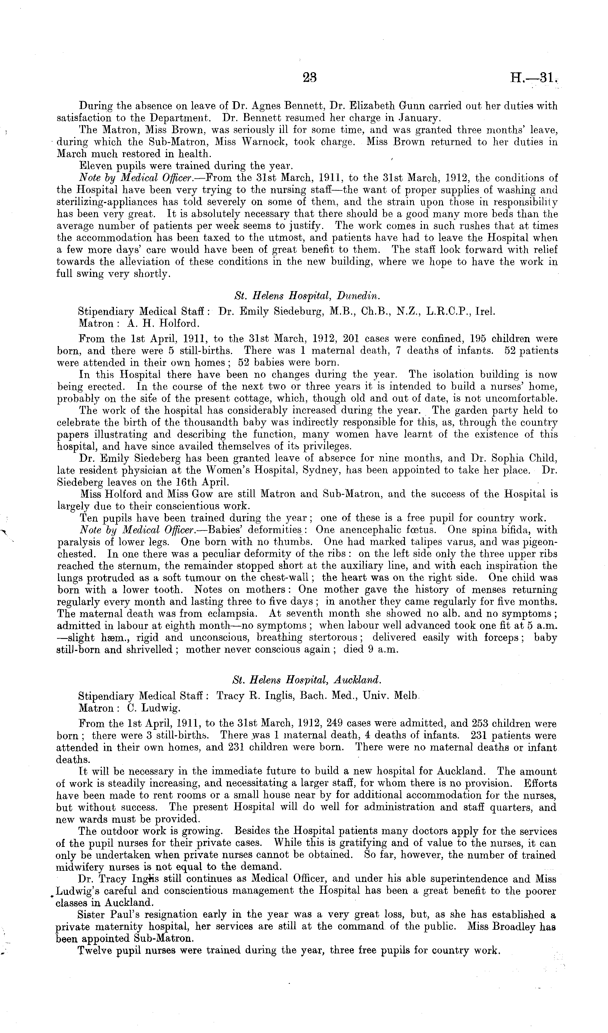 During the absence on leave of Dr. Agnes Bennett, Dr. Elizabeth Gunn carried out her duties with satisfaction to the Department. Dr. Bennett resumed her charge in January. The Matron, Miss Brown, was seriously ill for some time, and was granted three months' leave, during which the Sub-Matron, Miss Warnock, took charge. Miss Brown returned to her duties in March much restored in health. Eleven pupils were trained during the year. Note by Medical Officer.—From the 31st March, 1911, to the 31st March, 1912, the conditions of the Hospital have been very trying to the nursing staff—the want of proper supplies of washing and sterilizing-appliances has told severely on some of them, and the strain upon those in responsibility has been very great. It is absolutely necessary that there should be a good many more beds than the average number of patients per week seems to justify. The work comes in such rushes that at times the accommodation has been taxed to the utmost, and patients have had to leave the Hospital when a few more days' care would have been of great benefit to them. The staff look forward with relief towards the alleviation of these conditions in the new building, where we hope to have the work in full swing very shortly. St. Helens Hosfital, Dvnedin. Stipendiary Medical Staff : Dr. Emily Siedeburg, M.8., Ch.B., N.Z., L.R.C.P., Irel. Matron : A. H. Holford. From the Ist April, 1911, to the 31st March, 1912, 201 cases were confined, 195 children were born, and there were 5 still-births. There was 1 maternal death, 7 deaths of infants. 52 patients were attended in their own homes ; 52 babies were born. In this Hospital there have been no changes during the year. The isolation building is now being erected. In the course of the next two or three years it is intended to build a nurses' home, probably on the site of the present cottage, which, though old and out of date, is not uncomfortable. The work of the hospital has considerably increased during the year. The garden party held to celebrate the birth of the thousandth baby was indirectly responsible for this, as, through the country papers illustrating and describing the function, many women have learnt of the existence of this hospital, and have since availed themselves of its privileges. Dr. Emily Siedeberg has been granted leave of abserce for nine months, and Dr. Sophia Child, late resident physician at the Women's Hospital, Sydney, has been appointed to take her place. Dr. Siedeberg leaves on the 16th April. Miss Holford and Miss Gow are still Matron and Sub-Matron, and the success of the Hospital is largely due to their conscientious work. Ten pupils have been trained during the year; one of these is a free pupil for country work. Note by Medical Officer. —Babies' deformities: One anencephalic foetus. One spina bifida, with paralysis of lower legs. One born with no thumbs. One had marked talipes varus, and was pigeonchested. In one there was a peculiar deformity of the ribs :on the left side only the three upper ribs reached the sternum, the remainder stopped short at the auxiliary line, and with each inspiration the lungs protruded as a soft tumour on the chest-wall; the heart was on the right side. One child was born with a lower tooth. Notes on mothers : One mother gave the history of menses returning regularly every month and lasting three to five days ; in another they came regularly for five months. The maternal death was from eclampsia. At seventh month she showed no alb. and no symptoms ; admitted in labour at eighth month —no symptoms ; when labour well advanced took one fit at 5 a.m. —slight hsem., rigid and unconscious, breathing stertorous ; delivered easily with forceps; baby stilJ-born and shrivelled ; mother never conscious again ; died 9 a.m. St. Helens Hospital, Auckland. Stipendiary Medical Staff : Tracy R. Inglis, Bach. Med., Univ. Melb. Matron : C. Ludwig. From the Ist April, 1911, to the 31st March, 1912, 249 cases were admitted, and 253 children were born ; there were 3 still-births. There was 1 maternal death, 4 deaths of infants. 231 patients were attended in their own homes, and 231 children were born. There were no maternal deaths or infant deaths. It will be necessary in the immediate future to build a new hospital for Auckland. The amount of work is steadily increasing, and necessitating a larger staff, for whom there is no provision. Efforts have been made to rent rooms or a small house near by for additional accommodation for the nurses, but without success. The present Hospital will do well for administration and staff quarters, and new wards must be provided. The outdoor work is growing. Besides the Hospital patients many doctors apply for the services of the pupil nurses for their private cases. While this is gratifying and of value to the nurses, it can only be undertaken when private nurses cannot be obtained. So far, however, the number of trained midwifery nurses is not equal to the demand. Dr. Tracy Ingiis still continues as Medical Officer, and under his able superintendence and Miss Ludwig's careful and conscientious management the Hospital has been a great benefit to the poorer classes in Auckland. Sister Paul's resignation early in the year was a very great loss, but, as she has established a private maternity hospital, her services are still at the command of the public. Miss Broadley has been appointed Sub-Matron. Twelve pupil nurses were trained during the year, three free pupils for country work,
