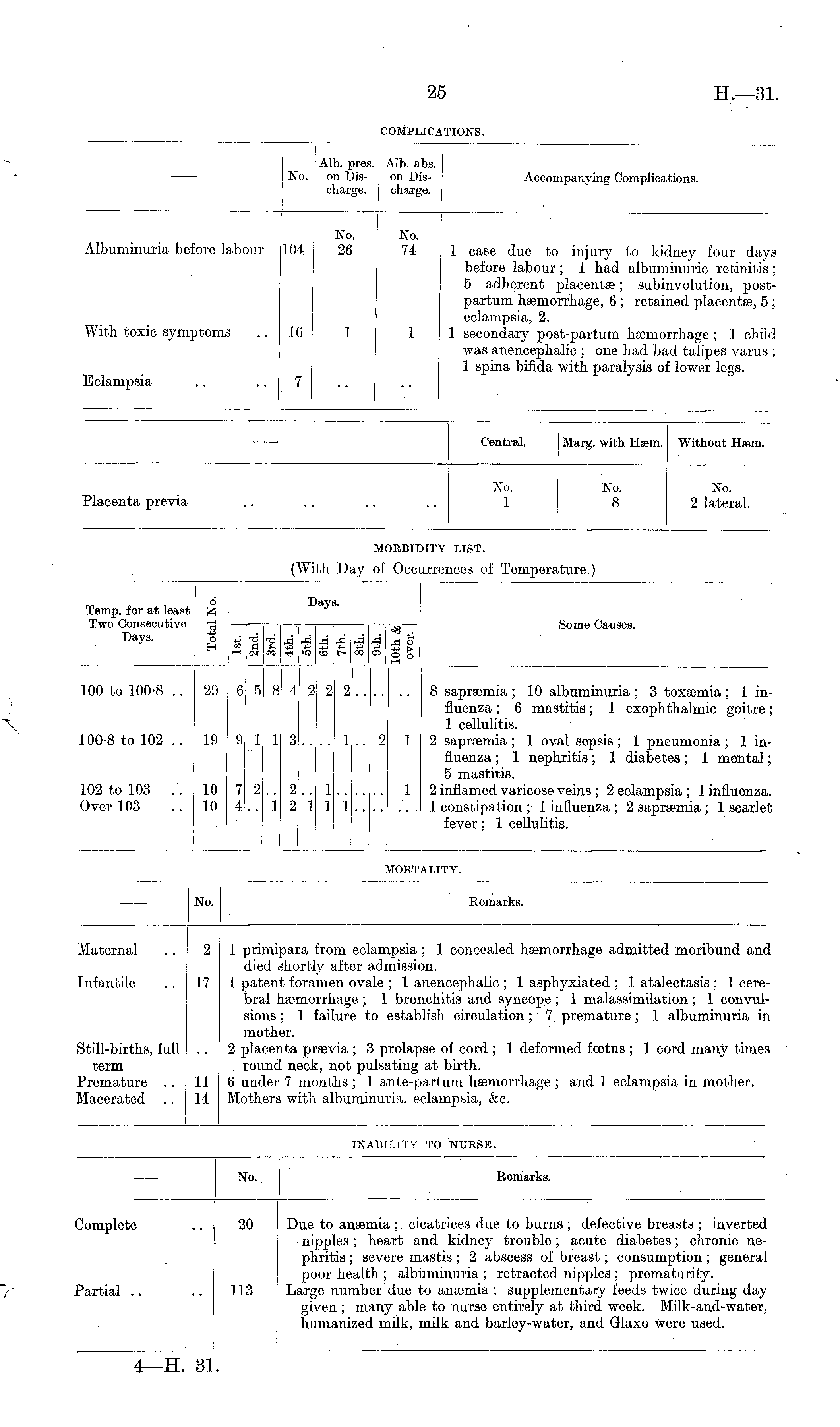 Alb. pres. Alb. abs. No. on Dis- on Discharge, charge. Accompanying Complications. No. 26 No. 74 Albuminuria before labour With toxic symptoms 104 1 case due to injury to kidney four days before labour ; 1 had albuminuric retinitis ; 5 adherent placentae; subinvolution, postpartum haemorrhage, 6 ; retained placentae, 5 ; eclampsia, 2. 1 secondary post-partum haemorrhage ; 1 child was anencephalic ; one had bad talipes varus ; 1 spina bifida with paralysis of lower legs. 16 1 1 Eclampsia Central. i Marg. with Hsem. Without Hsem. Placenta previa No. 1 No. 8 No. 2 lateral. MORBIDITY LIST. (With Day of Occurrences of Temperature.) Temp, for at least Two Consecutive Days. d J 3 Days. 4%t4444 44 ■$$ Days. Some Causes. 100 to 100-8 .. 29 6j 5 8 sapraemia ; 10 albuminuria ; 3 toxaemia ; 1 influenza ; 6 mastitis; 1 exophthalmic goitre; 1 cellulitis. 2 sapraemia ; 1 oval sepsis ; 1 pneumonia ; 1 influenza ; 1 nephritis; 1 diabetes; 1 mental; 5 mastitis. 2 inflamed varicose veins ; 2 eclampsia ; 1 influenza. 1 constipation ; 1 influenza ; 2 sapraemia ; 1 scarlet fever; 1 cellulitis. 100-8 to 102 .. 102 to 103 .. Over 103 19 9 1 7 2 4.. 10 10 1 2 2 1 1 1 1 1 iORTALITY. No. Remarks. Maternal 2 1 primipara from eclampsia ; 1 concealed haemorrhage admitted moribund and died shortly after admission. 1 patent foramen ovale ; 1 anencephalic ; 1 asphyxiated ; 1 atalectasis ; 1 cerebral haemorrhage ; 1 bronchitis and syncope ; 1 malassimilation ; 1 convulsions ; 1 failure to establish circulation; 7 premature; 1 albuminuria in mother. 2 placenta praevia ; 3 prolapse of cord ; 1 deformed foetus ; 1 cord many times round neck, not pulsating at birth. 6 under 7 months; 1 ante-partum haemorrhage ; and 1 eclampsia in mother. Mothers with albuminuria, eclampsia, &c. Infantile 17 Still-births, full term Premature Macerated 11 11 INABILITY TO NUKSB. No. Remarks. iomplete 20 Due to anaemia ; cicatrices due to burns ; defective breasts ; inverted nipples; heart and kidney trouble; acute diabetes; chronic nephritis ; severe mastis ; 2 abscess of breast; consumption ; general poor health ; albuminuria ; retracted nipples ; prematurity. Large number due to anaemia ; supplementary feeds twice during day given ; many able to nurse entirely at third week. Milk-and-water, humanized milk, milk and barley-water, and Glaxo were used. 'artial .. 113