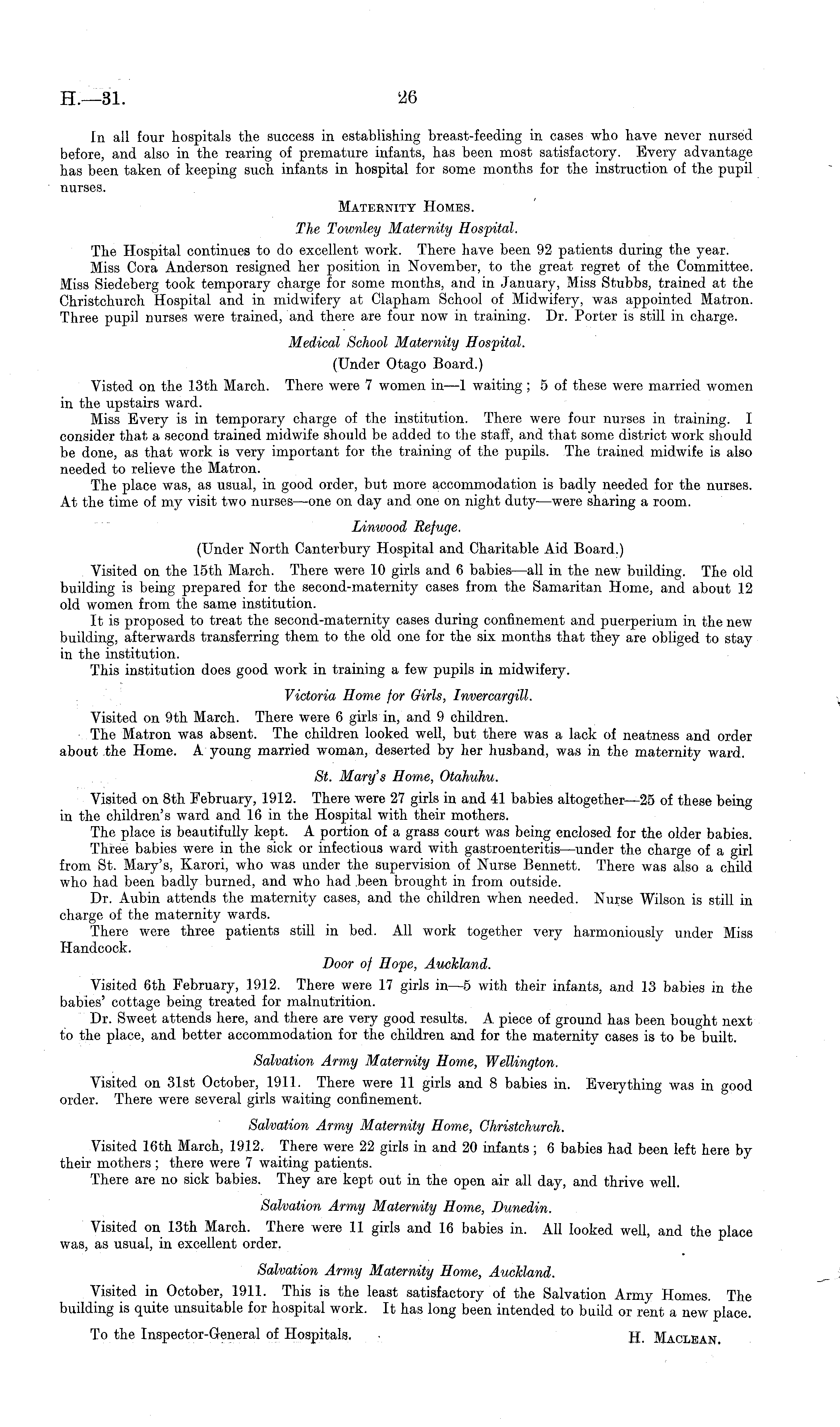 In all four hospitals the success in establishing breast-feeding in cases who have never nursed before, and also in the rearing of premature infants, has been most satisfactory. Every advantage has been taken of keeping such infants in hospital for some months for the instruction of the pupil nurses. Maternity Homes. The Totvnley Maternity Hospital. The Hospital continues to do excellent work. There have been 92 patients during the year. Miss Cora Anderson resigned her position in November, to the great regret of the Committee. Miss Siedeberg took temporary charge for some months, and in January, Miss Stubbs, trained at the Christchurch Hospital and in midwifery at Clapham School of Midwifery, was appointed Matron. Three pupil nurses were trained, and there are four now in training. Dr. Porter is still in charge. Medical School Maternity Hospital. (Under Otago Board.) Visted on the 13th March. There were 7 women in—l waiting ;5 of these were married women in the upstairs ward. Miss Every is in temporary charge of the institution. There were four nurses in training. I consider that a second trained midwife should be added to the staff, and that some district work should be done, as that work is very important for the training of the pupils. The trained midwife is also needed to relieve the Matron. The place was, as usual, in good order, but more accommodation is badly needed for the nurses. At the time of my visit two nurses —one on day and one on night duty —were sharing a room. Linwood Refuge. (Under North Canterbury Hospital and Charitable Aid Board.) Visited on the 15th March. There were 10 girls and 6 babies—all in the new building. The old building is being prepared for the second-maternity cases from the Samaritan Home, and about 12 old women from the same institution. It is proposed to treat the second-maternity cases during confinement and puerperium in the new building, afterwards transferring them to the old one for the six months that they are obliged to stay in the institution. This institution does good work in training a few pupils in midwifery. Victoria Home for Girls, Invercargill. Visited on 9th March. There were 6 girls in, and 9 children. The Matron was absent. The children looked well, but there was a lack of neatness and order about the Home. A young married woman, deserted by her husband, was in the maternity ward. St. Mary's Home, Otahuhu. Visited on Bth February, 1912. There were 27 girls in and 41 babies altogether—2s of these being in the children's ward and 16 in the Hospital with their mothers. The place is beautifully kept. A portion of a grass court was being enclosed for the older babies. Three babies were in the sick or infectious ward with gastroenteritis—under the charge of a girl from St. Mary's, Karori, who was under the supervision of Nurse Bennett. There was also a child who had been badly burned, and who had been brought in from outside. Dr. Aubin attends the maternity cases, and the children when needed. Nurse Wilson is still in charge of the maternity wards. There were three patients still in bed. All work together very harmoniously under Miss Handcock. Boor of Hope, Auckland. Visited 6th February, 1912. There were 17 girls in—s with their infants, and 13 babies in the babies' cottage being treated for malnutrition. Dr. Sweet attends here, and there are very good results. A piece of ground has been bought next to the place, and better accommodation for the children and for the maternity cases is to be built. Salvation Army Maternity Home, Wellington. Visited on 31st October, 1911. There were 11 girls and 8 babies in. Everything was in good order. There were several girls waiting confinement. Salvation Army Maternity Home, Christchurch. Visited 16th March, 1912. There were 22 girls in and 20 infants; 6 babies had been left here by their mothers ; there were 7 waiting patients. There are no sick babies. They are kept out in the open air all day, and thrive well. Salvation Army Maternity Home, Dunedin. Visited on 13th March. There were 11 girls and 16 babies in. All looked well, and the place was, as usual, in excellent order. Salvation Army Maternity Home, Auckland. Visited in October, 1911. This is the least satisfactory of the Salvation Army Homes. The building is quite unsuitable for hospital work. It has long been intended to build or rent a new place. To the Inspector-General of Hospitals. • H. Maclean,