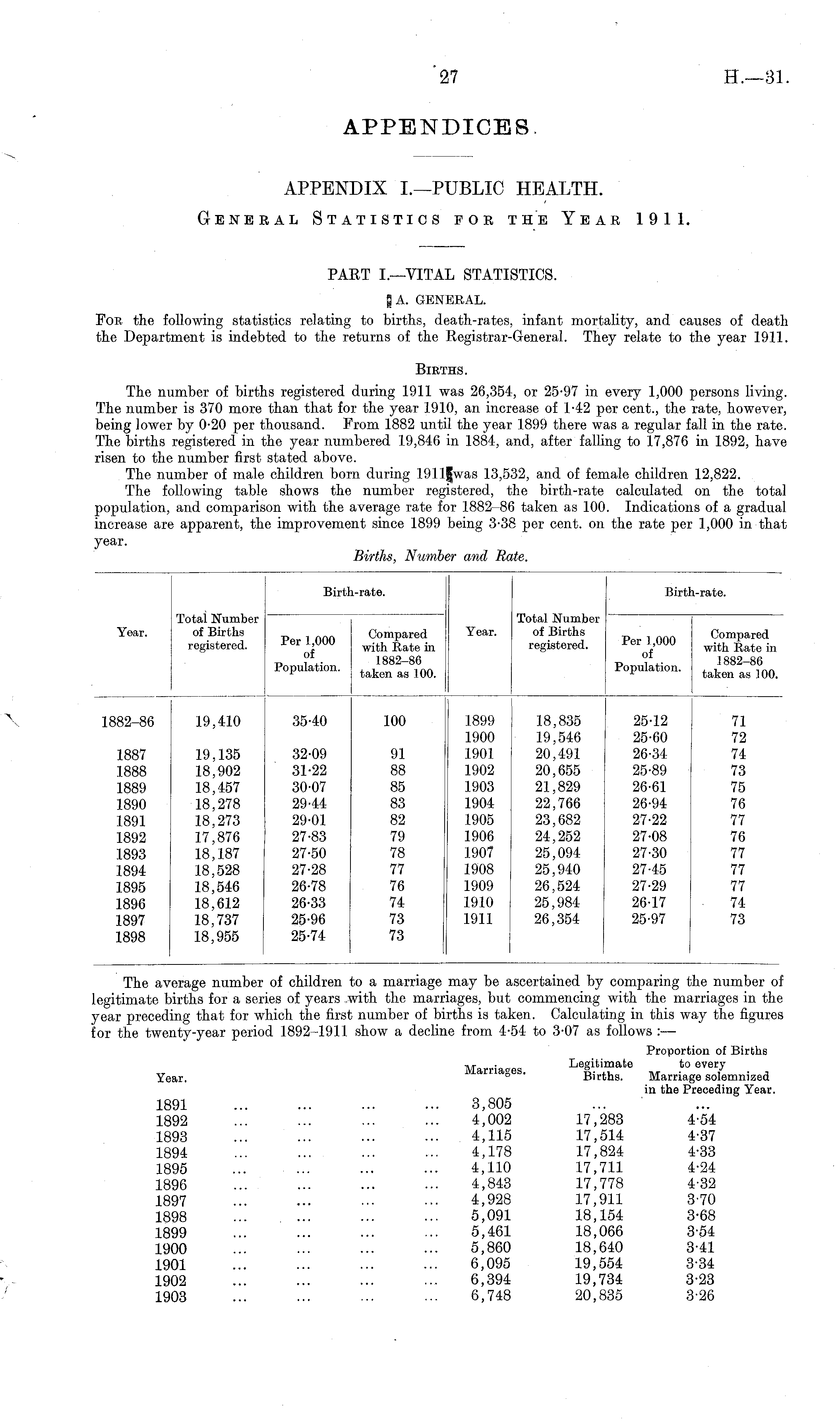 APPENDICES. APPENDIX I.—PUBLIC HEALTH. General Statistics for the Year 19 11. PART I.—VITAL STATISTICS. I A. GENERAL. For the following statistics relating to births, death-rates, infant mortality, and causes of death the Department is indebted to the returns of the Registrar-General. They relate to the year 1911. BIBTHS. The number of births registered during 1911 was 26,354, or 25-97 in every 1,000 persons living. The number is 370 more than that for the year 1910, an increase of 1-42 per cent., the rate, however, being lower by 0-20 per thousand. From 1882 until the year 1899 there was a regular fall in the rate. The births registered in the year numbered 19,846 in 1884, and, after falling to 17,876 in 1892, have risen to the number first stated above. The number of male children born during 1911|was 13,532, and of female children 12,822. The following table shows the number registered, the birth-rate calculated on the total population, and comparison with the average rate for 1882-86 taken as 100. Indications of a gradual increase are apparent, the improvement since 1899 being 3-38 per cent, on the rate per 1,000 in that