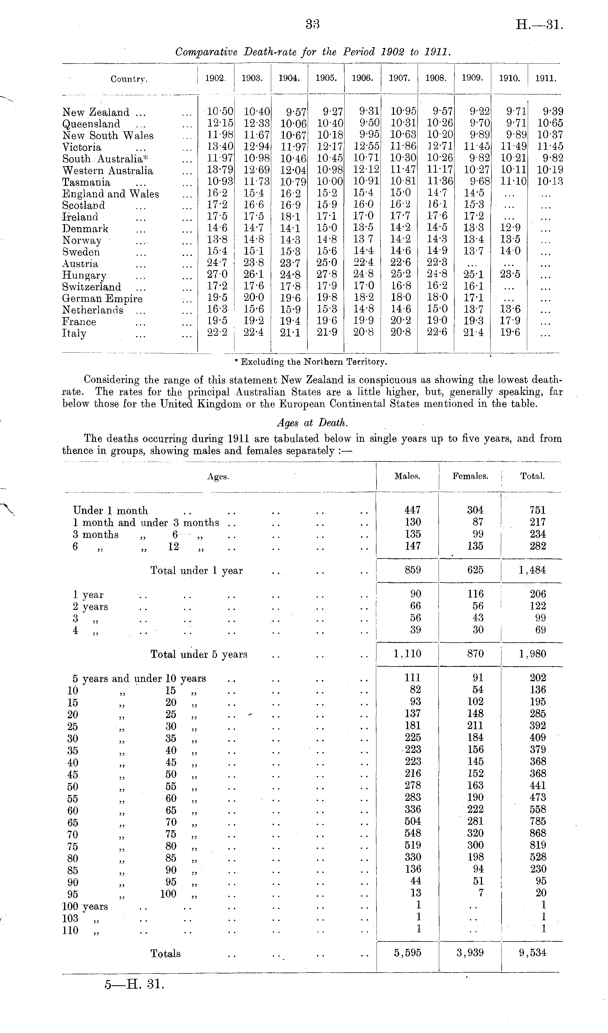 Considering the range of this statement New Zealand is conspicuous as showing the lowest deathrate. The rates for the principal Australian States are a little higher, but, generally speaking, far below those for the United Kingdom or the European Continental States mentioned in the table. Ages at Death. The deaths occurring during 1911 are tabulated below in single years up to five years, and from thence in groups, showing males and females separately : —