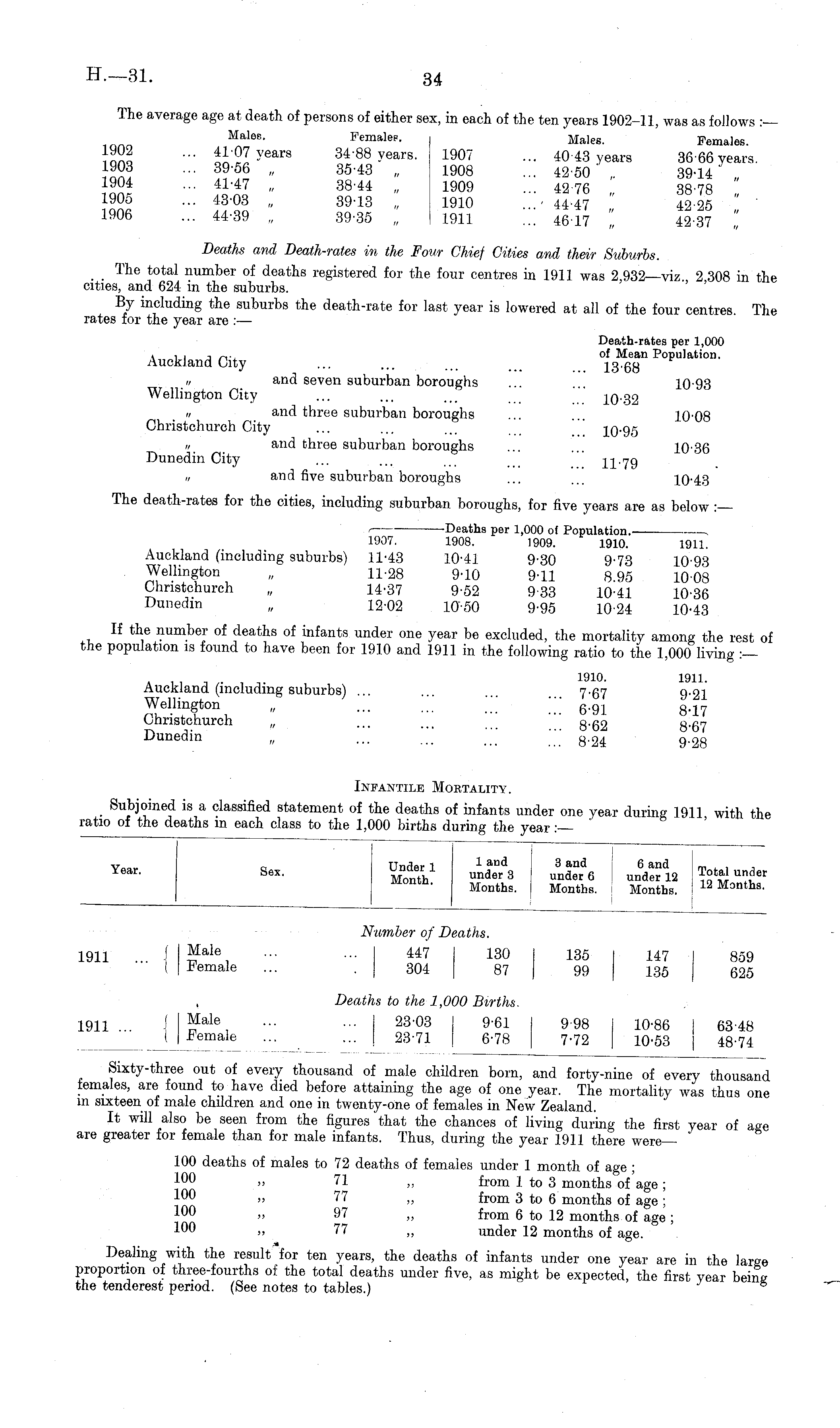 The average age at death of persons of either sex, in each of the ten years 1902-11, was as follows :— iono .I^' 6 *' Females. , Males. Females. ° n ■•■ 41-07 years 34-88 years. 1907 ... 4043 years 36-66 years. 1903 ... 39-56 „ 35-43 „ 1908 ... 42-50 , 39-14" 1904 ... 41-47 „ 38-44 „ 1909 ... 4276 „ 38-78 "„ 1900 ... 43-03 „ 39-13 „ 1910 - 44-47 4225 1906 ... 44-39 I 39-35 „ 1911 "! 4617 "„ 42-37 "„ Deaths and Death-rates in the Four Chief Cities and, their Suburbs. _ _ The total number of deaths registered for the four centres in 1911 was 2 932—viz 2 308 in the cities, and 624 in the suburbs. By including the suburbs the death-rate for last year is lowered at all of the four centres The rates for the year are :— Death-rates per 1,000 ~.-,„. of Mean Population. Auckland City ... ... 13-68 " and seven suburban boroughs ... ... 10-93 Wellington City ... ... ... 10-32 n and three suburban boroughs ... ... 10-08 Christehurch City ... ... 10-95 a and three suburban boroughs 10-'^fi Dunedm City ... ... 11-79 a and five suburban boroughs ... ... 10-43 The death-rates for the cities, including suburban boroughs, for five years are as below :— , Deaths per 1,000 of Population. . 1907. 1908. 1909. 1910. 1911. Auckland (including suburbs) 11-43 10-41 9-30 9-73 10-93 Wellington „ 11-28 9-10 9-11 8.95 1008 Christehurch „ 14-37 9-52 933 10-41 10-36 Dunedm ,i 12-02 10-50 9-95 1024 10-43 If the number of deaths of infants under one year be excluded, the mortality among the rest of the population is found to have been for 1910 and 1911 in the following ratio to the 1,000 living :— Auckland (including suburbs) ... 7.57 9-21 Wellington „ "[ "; 6 . gl 8 . 1? Christchurch „ 8 . 62 8 . 67 Dunedin v 8-24 9-28 Infantile Mortality. Subjoined is a classified statement of the deaths of infants under one year during 1911 with the ratio of the deaths m each class to the 1,000 births during the year :— '