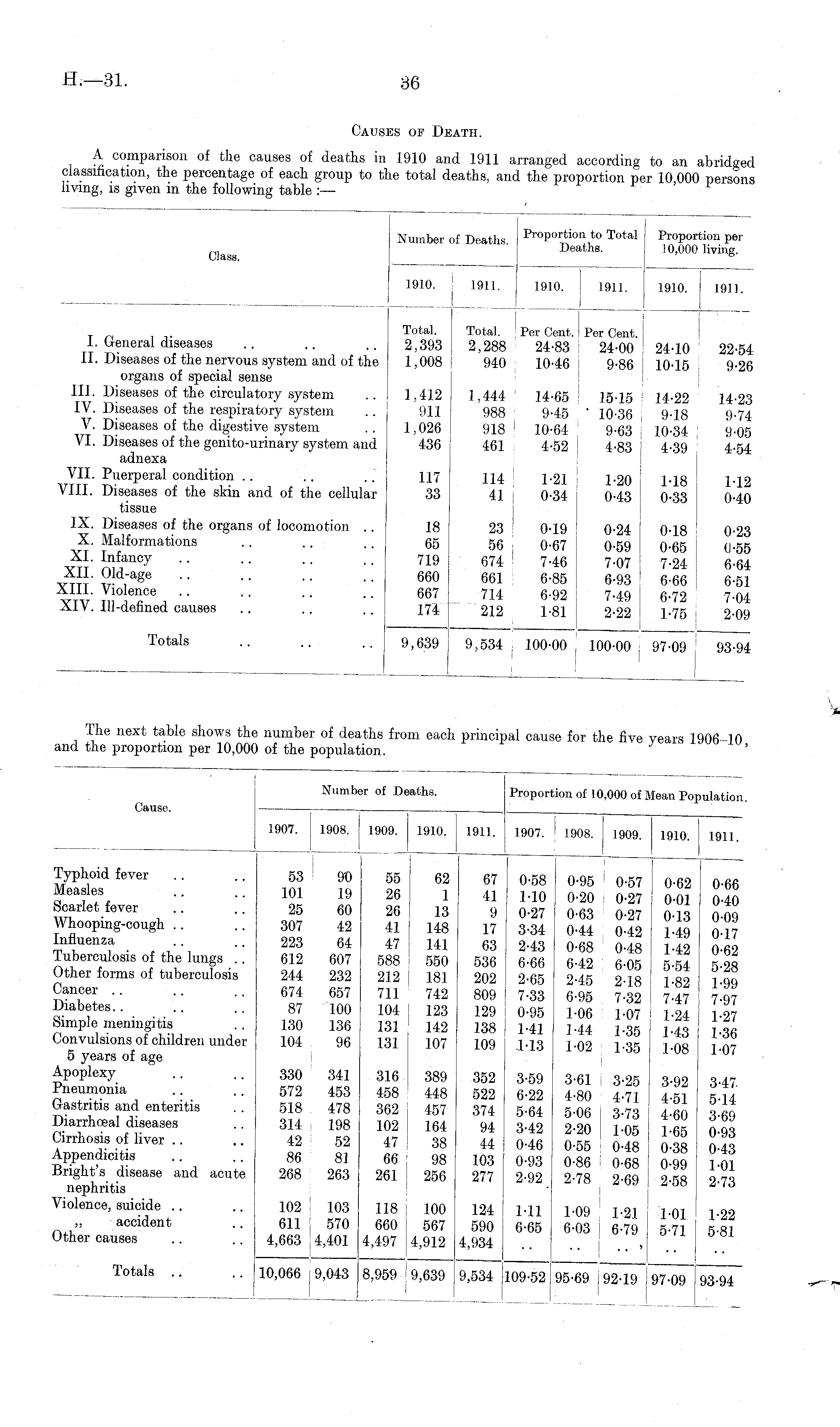 The next table shows the number of deaths from each principal cause for the five years 1906-10, and the proportion per 10,000 of the population.