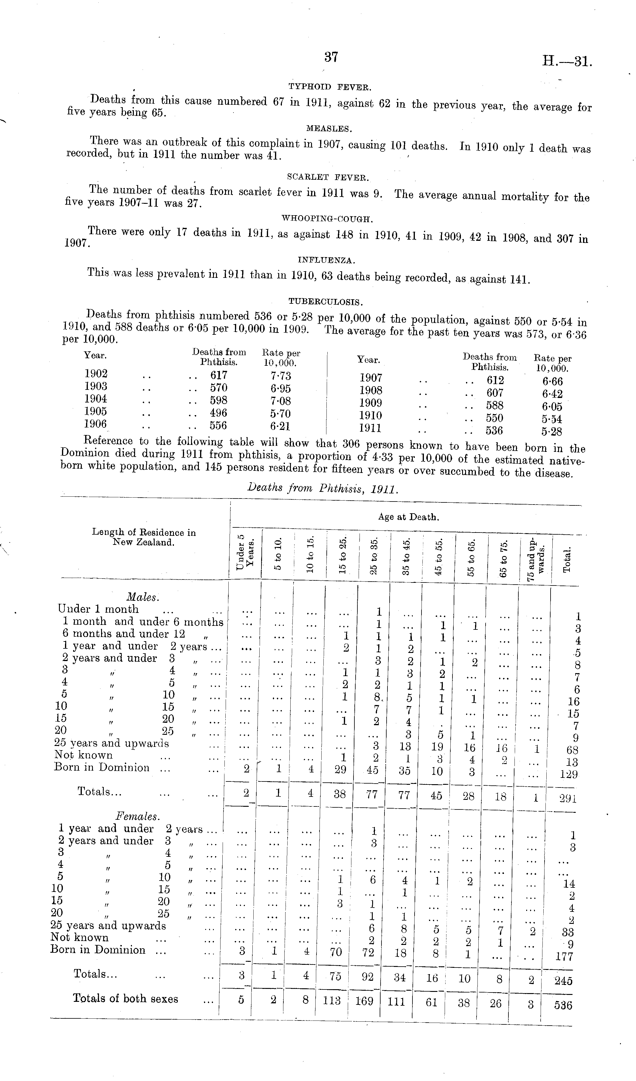 TYPHOID FEVER. five ° aU8e nUmbei ' ed 6? m 19U> agalnSt 62 the PreVi ° US Jear ' th6 aVera S e f0r MEASLES. ° f ° 0m P Iaint in 1907 > causin 8 101 In 1910 only 1 death was recorded, but in 1911 the number was 41. < SCARLET FEVER. five ylLlm-nitt S imm scarlet fever in 19H was 9 ' The average annual mortalit y for the WHOOPING-COUGH. 1907 1W W6re ° nly 1? death8 1911, againSt M8 in 191 °' 41 in 1909 ' 42 in 1908 > and 307 in INFLUENZA. This was less prevalent in 1911 than in 1910, 63 deaths being recorded, as against 141. TUBERCULOSIS. 1 .in Dea^«T?,hthi8^ n ™ lbe^ d i 36 ° r 5 ' 28 per 10 ' 000 of the Population, against 550 or 5-54 in VfifiT- Deaths from Kate per „ n„„+i, * _> __ Zi ™ S - 10 ,' 00a ™& 1902 •• •■ 617 7 ' 73 1907 .. 612 fi.fifi 1903 •• •• 570 6-95 1908 .. 607 6-42 1904 •• ••598 7-08 1909 .. '' 588 6-05 1905 .. ..496 5-70 1910 .. ' 55O 5-S 1906 .. 556 6-21 1911 .. ]] gjj °£ Reference to the following table will show that 306 persons known to have been born in the Dominion d le d during 1911 from phthisis a proportion of 4-33 per 10,000 of the estimated nativeborn white population, and 145 persons resident for fifteen years or over succumbed to the disease. Deaths from Phthisis, 1911. Agi at Death. Length of Residence in New Zealand. 10 . f5tH © rH O o 10 o © rH *6 o rH ! » 1 co l ° 1 10 cq >6 O +^ 'O CO IO o in IO CO o in 10 10 o CO Ph . I Pa rt ! ■d? c« ! 9 eg o , * B ! Eh \ to " 1 Males. Under 1 month ... ... ! ... 1 month and under 6 months 6 months and under 12 „ 1 year and under 2 years 2 years and under 3 „ ... 3 „ 4 „ 4 „ 5 „ 5 „ 10 „ 10 „ 15 „ ... ' ... 15 „ 20 ! ... 20 „ 25 „ ... ; ... 25 years and upwards .... Not known ... Born in Dominion ... ... 2 ■ . 1 2 1 2 1 1 1 1 ! 1 3 1 2 8 7 2 1 2 l 2 3 1 5 7 4 3 13 1 35 "l" "l 1 i i "i "2 2 1 1 1 1 , 1 3 4 5 8 7 6 16 | ... - 15 | ... 7 ... ! 9 1 ! 68 ... i 13 ... : 129 i "■ "' 1 29 3 2 45 5 1 19 16 3 4 10 I 3 16 o "l 4 Totals... ... ... 2 1 4 38 77 77 I 45 ! 28 18 1 291 Females. 1 year and under 2 years j 2 years and under 3 „ ... 3 „ 4 4 „ 5 5 „ 10 „ ... ... 10 „ 15 „ 15 „ 20 „ 20 „ 25 „ 25 years and upwards Not known ... Born in Dominion ... ... 3 1 1 ... ; ... ... 1 ; [ ! ■•■ I ... ... ' '■• 1 1 3 1 3 "is 4 1 1 i "2 1 ... j 3 ... ! ... ! 14 ... I 2 I ■■■ I 4 ... , 2 2 : 33 ... i 9 - . . J 177 2 : 245 3 j 536 1 1 6 2 72 1 8 2 18 5 5 2 ' 2 8 ; 1 7 1 "i j I " 4 70 I -. Totals... ... ... ! 3 L 1 4 I 75 92 34 16 10 8 Totals of both sexes ... I 5 2 8 113 61 : 38 169 111 26