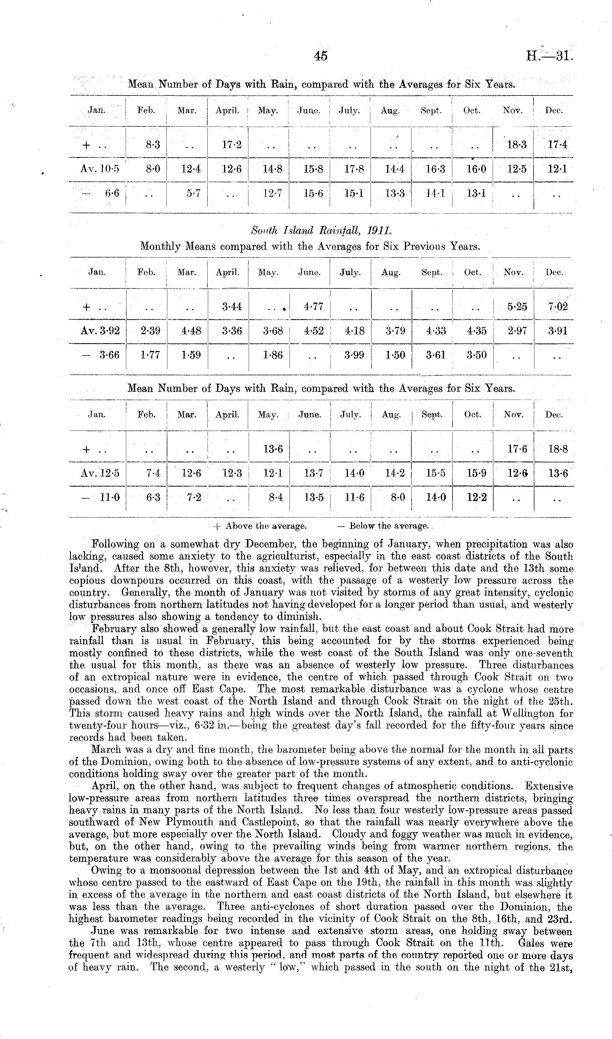 Following on a somewhat dry December, the beginning of January, when precipitation was also lacking, caused some anxiety to the agriculturist, especially in the east coast districts of the South Is'and. After the Bth, however, this anxiety was relieved, for between this date and the 13th some copious downpours occurred on this coast, with the passage of a westerly low pressure across the country. Generally, the month of January was not visited by storms of any great intensity, cyclonic disturbances from northern latitudes not having developed for a longer period than usual, and westerly low pressures also showing a tendency to diminish. February also showed a generally low rainfall, but the east coast and about Cook Strait had more rainfall than is usual in February, this being accounted for by the Storms experienced being mostly confined to these districts, while the west coast of the South Island was only one-seventh the usual for this month, as there was an absence of westerly low pressure. Three disturbances of an extropical nature were in evidence, the centre of which passed through Cook Strait on two occasions, and once off East Cape. The most remarkable disturbance was a cyclone whose centre passed down the west coast of the North Island and through Cook Strait on the night of the 25th. This storm caused heavy rains and high winds over the North Island, the rainfall at Wellington for twenty-four hours —viz., 6-32 in.—being the greatest day's fall recorded for the fifty-four years since records had been taken. March was a dry and fine month, the barometer being above the normal for the month in all parts of the Dominion, owing both to the absence of low-pressure systems of any extent, and to anti-cyclonic conditions holding sway over the greater part of the month. April, on the other hand, was subject to frequent changes of atmospheric conditions. Extensive low-pressure areas from northern latitudes three times overspread the northern districts, bringing heavy rains in many parts of the North Island. No less than four westerly low-pressure areas passed southward of New Plymouth and Castlepoint, so that the rainfall was nearly everywhere above the average, but more especially over the North Island. Cloudy and foggy weather was much in evidence, but, on the other hand, owing to the prevailing winds being from warmer northern regions, the temperature was considerably above the average for this season of the year. Owing to a monsoonal depression between the Ist and 4th of May, and an extropical disturbance whose centre passed to the eastward of East Cape on the 19th, the rainfall in this month was slightly in excess of the average in the northern and east coast districts of the North Island, but elsewhere it was less than the average. Three anti-cyclones of short duration passed over the Dominion, the highest barometer readings being recorded in the vicinity of Cook Strait on the Bth, 16th, and 23rd. June was remarkable for two intense and extensive storm areas, one holding sway between the 7th and 13th, whose centre appeared to pass through Cook Strait on the 11th. Gales were frequent and widespread during this period, and most parts of the country reported one or more days of heavy rain. The second, a westerly " kfw," which passed in the south on the night of the 21st,