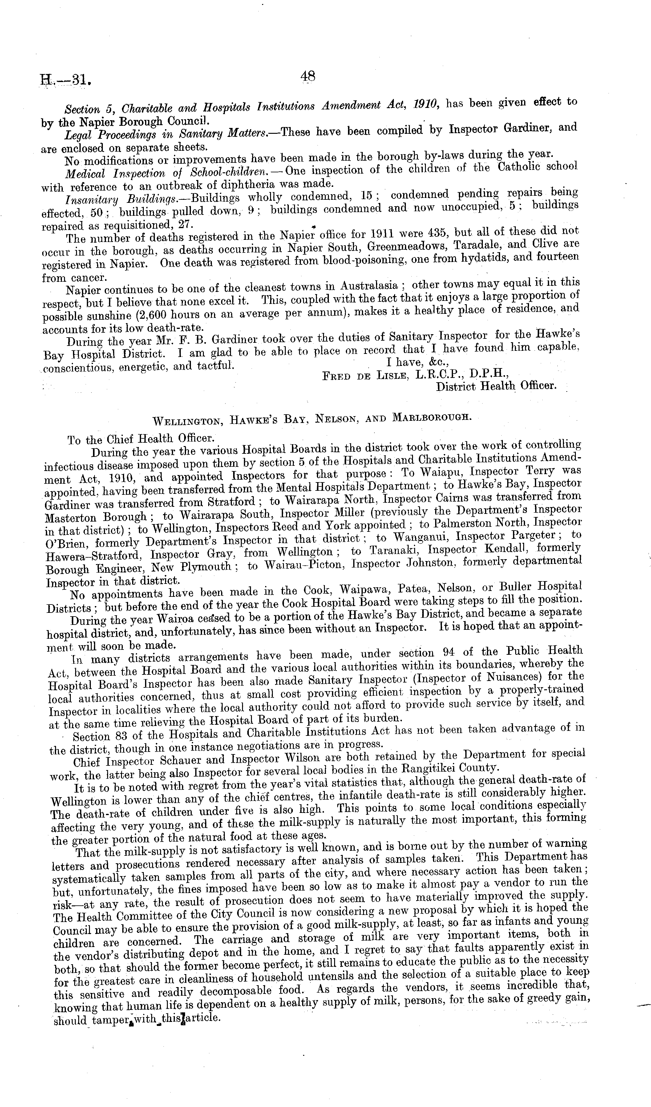 Section 5, Charitable and Hospitals Institutions Amendment Act, 1910, has been given efiect to by the Napier Borough Council. • . n a^ Legal Proceedings in Sanitary Matters.—These have been compiled by Inspector Gardiner, and are enclosed on separate sheets. . , No modifications or improvements have been made m the boro u ghby-lawsdurmg the year Medical Inspection of Sehool-chOdren.- One inspection of the children of the Catholic school with reference to an outbreak of diphtheria was made. . ZnMmfairy B«*Wt«? e .-BuildingB wholly condemned, 15; condemned pending repairs bemg effected 50 ; buildings pulled down, 9; buildings condemned and now unoccupied, 5 ; buildings reP thl in the Napier office for 1911 were 435, but all of these did not occur in the borough, as deaths occurring in Napier South, Greenmeadows, Tarad ale <&veare registered in Napier! One death was registered from blood-poisoning, one from hydatids, and fourteen fr ° m Nap2- r continues to be one of the cleanest towns in Australasia ; other towns may equal it in this respect but I believe that none excel it. This, coupled with the fact that it enjoys a large Portion of possible sunshine (2,600 hours on an average per annum), makes it a healthy place of residence, and &CC^inX Gardiner took over the duties of Sanitary Inspector for the Hawke's Bay Hospital District. I am glad to be able to place on record that I have found him capable. conscientious, energetic, and tactful. I nav e, &o. Fred de Lisle, L.X.C.P., JJ.r.n., District Health Officer. Wellington, Hawke's Bay, Nelson, and Marlborough. T ° Hospital Boards in the district took over the work of controlling infectious disease imposed upon them by section 5 of the Hospitals and Charitable Institutions Amendment Act 1910 and appointed Inspectors for that purpose: To Waiapu Inspector Terry w-as appointed having been transferred from the Mental Hospitals Department to Hawke's Bay Inspector GaXei was transferred from Stratford ; to Wairarapa North, Inspector Cairns was transferred from Masterton Borough- to Wairarapa South, Inspector Miller (previously the Departments Inspector k thatdTstrS)? to Wellington, Inspectors Eeed and York appointed ; to Palmerston North, Inspector O'Biden formerly Department's Inspector in that district; to Wanganui, Inspector Pargeter ;to Haw rtsSol Injector Gray, from Wellington; to Taranaki Inspector Kendall, formerly BorTgh Engineer, New Plymouth; to Wairau-Picton, Inspector Johnston, formerly departmental been made in the Cook, Waipawa, Patea Nelson, or Buller Hospital Districts butbefore the end of the year the Cook Hospital Board were taking steps to fill the position. Dx ring he year Wairoa ceased to be a portion of the Hawke's Bay District and became a separate hoßpiSfcrict, and, unfortunately, has since been without an Inspector. It is hoped that an appomtmmil \: arrangements have been made, under section 94 of the. Public Health Act between the Hospital Board and the various local authorities witMn its boundaries, whereby the Hospital Boat's Inspector has been also made Sanitary Inspector (Inspector of Nuisances) or the concerned, thus at small cost providing efficient mspection by a properly-tramed Inspector i n localities where the local authority could not afford to provide such service by itself, and at the same time relieving the Hospital Board of part of its burden. Section 83 of the Hospitals and Charitable Institutions Act has not been taken advantage of in the district though in one instance negotiations are in progress. CMe"inspector Schauer and Inspector Wilson are both retained by the Department for special work the latter beino- also Inspector for several local bodies in the Rangitikei County. It is to be noted wfth regret from the year's vital statistics that, although the general death-rate oi Well ngton Slower than m j of the chief centres, the infantile death-rate is sti 1 considerably higher The death-rate of children under five is also high. This points to some local conditions especially a&ctino the ve ry young , an d of these the milk-supply is naturally the most important, this forming the SStX-supply known, and is borne out by the number of warning letter7aid necessary after analysis of samples taken. This Department has taken samples from all parts of the city, and where necessary action has been taken the fines imposed have been so low as to make it almost pay a vendor to run the S ™ any rate the result of prosecution does not seem to have materially improved the supply. ThellealtrCommittee of the City Council is now considering a new proposal by which it is hoped the Sadfirb^Sto ensure the provision of a good milk-supply, at least, so far as infants and young ™S, a£ concerned The carriage and storage of milk are very important items both m he vendor' dlsfaZt ng depot and & the home, and I regret to say that faults apparently exist m should tampei: ft with - this2article.