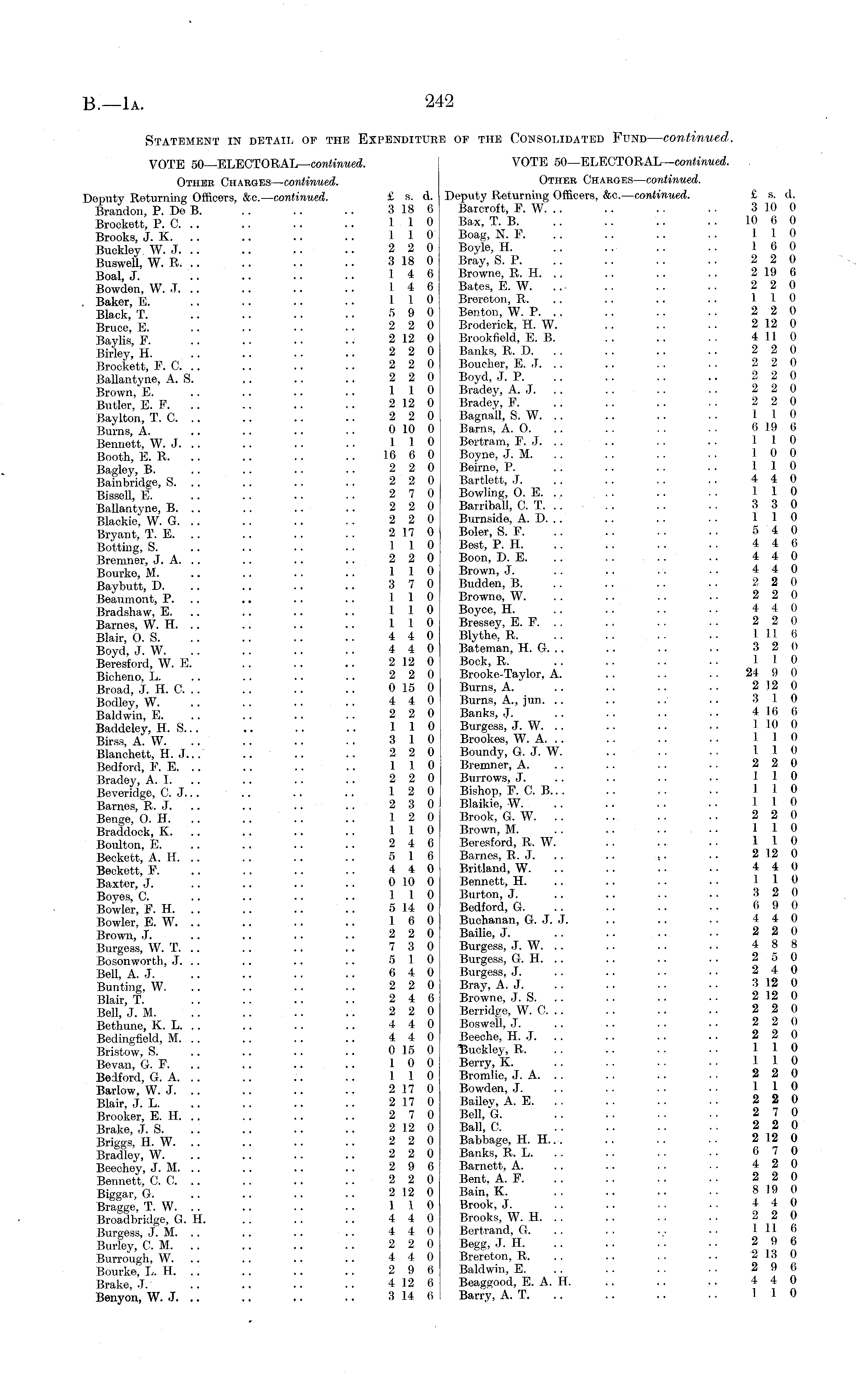 Statement in detail of the Expenditure of the Consolidated Fund — continued. VOTE 50—ELECTORAL— continued. VOTE 50—ELECTORAL— continued. Other Charges— continued. Other Charges— continued. Deputy Returning Officers, &o.—continued. £ s. d. Deputy Returning Officers, &c— continued. £ s. d. Brandon, P. De B 318 6 Barcroft, F. W 3!0 0 Brockett, P. C 110 Bax, T. B 10 6 0 Brooks, J. X 110 Boag, N. F 110 Buckley W. J. .. .. .. ■ • 2 2 0 Boyle, H. .. .. .. .. 16 0 Buswell, W. B 318 0 Bray, S. P 2 2 0 Boal J ..146 Browne, R. H. .. .. .. .. 219 6 Bowden, W. .T. '. 14 6 Bates, E. W. 2 2 0 Baker E . .. .. .. 110 Brereton, R. .. .. .. 110 Black T. .. .. .. .. 5 9 0 Benton, W. P. .. .. .. .. 2 2 0 Bruce E .. .. .. 2 2 0 Broderick, H. W. .. .. .. 212 0 Baylis F . .. 212 0 Brookfield, E. B. .. .. .. 411 0 Birley H . .. ..220 Banks, R. D. .. . . .. .. 220 Brockett, F. C 2 2 0 Boucher, E. J 2 2 0 Ballantyne, A. S. 2 2 0 Boyd, J. P 2 2 0 Brown, E. .. .. .. .. 110 Bradey, A. J. .. .. . . .. 2 2 0 Butler, E. F. .. .. .. .. 212 0 Bradey, F. .. .. .. .. 2 2 0 Baylton, T. C 2 2 0 Bagnall, S. W 110 Bums, A. .. .. .. .. 010 0 Barns, A. O. .. .. .. .. 619 6 Bennett W. J. .. .. .. • • 110 Bertram, F. J. .. .. .. .. 110 Booth, E. R. .. .. .. .. 16 6 0 Boyne, J. M. .. .. .. .. 10 0 Barley, B. .. .. .. .. 2 2 0 Beirne, P. .. .. .. .. 110 Bainbridge, S 2 2 0 Bartlett, J 4 4 0 Bissell, E 2 7 0 Bowling, O. E. . . ... .. . . 110 Ballantyne, B 2 2 0 Barriball, C. T .. 3 3 0 Blackie. W. G. .. .. .. .. 2 2 0 Burnside, A. D. .. .. .. .. 110 Bryant' T. E. .. .. .. .. 217 0 Boler, S. F. .. .. .. .. 5 4 0 Botting, S 110 Best, P. H .. .. 4 4 6 Bremner, J. A 2 2 0 Boon, D. E .. .. 4 4 0 Bourke, M. .. .. .. .. 110 Brown, J. .. .. .. .. 4 4 0 Baybutt, D. .. .. .. .. 3 7 0 Budden, B. .. .. .. .. 2 2 0 Beaumont, P 110 Browne, W .. .. 2 2 0 Bradshaw, E. .. .. .. .. 110 Boyce, H. .. .. .. .. 4 4 0 Barnes, W. H 110 Bressey, E. F 2 2 0 Blair, O. S. .. .. .. .. 4 4 0 Blythe, R. .. .. .. .. 111 6 Boyd J W .. .. 44 0 Bateman, H. G. .. .. .. .. 32 0 Beresfor'd, W. E. 212 0 Bock, R. .. .. .. .. 110 Bicheno, L 2 2 0 Brooke-Taylor, A. .. . . 24 9 0 Broad, J. H. C 015 0 Burns, A .. 212 0 Bodley, W. .. .. .. .. 44 0 Burns, A., jun. .. .. . . .. 310 Baldwin E. .. .. .. .. 2 2 0 Banks, J. .. .. .. .. 416 6 Baddeley, H. 5... 110 Burgess, J. W 110 0 Birss AW. . .. .. .. 3 10 Brookes, W. A. . . .. .. .. 110 Blanchett, H. J 2 2 0 Boundy, G. J. W. 110 Bedford, F. E. .. .. .. .. 110 Bremner, A. .. .. .. .. 2 2 0 Bradoy A. I. .. .. .. .. 22 0 Burrows, J. . . .. . • • • 110 Beveridge, C. J. .. .. .. .. 12 0 Bishop, F. C. 8... .. . . .. 110 Barnes, R. J 2 3 0 Blaikie, W 110 Benge, O. H. .. .. .. .. 12 0 Brook, G. W. .. . . .. . • 22 0 Braddock, K. .. .. .. .. 110 Brown, M. .. .. . . • • 110 Boulton, E. .. .. .. .. 2 4 6 Beresford, R. W. .. .. . . 110 Beckett, A. H. .. .. .. .. 5 16 Barnes, R. J. .. .. .. .. 212 0 Beckett, F. .. .. .. .. 4 4 0 Britland, W. .. .. .. .. 4 4 0 Baxter, J. .. .. .. .. 010 0 Bennett, H. .. .. .. .. 110 Boyes, C. .. .. .. .. 110 Burton, J. .. .. .. .. 3 2 0 Bowler, F. H. .. .. .. .. 514 0 Bedford, G. .. .. .. .. 6 9 0 Bowler EW. .. .. .. 16 0 Buchanan, G. J. J. .. .. . . 4 4 0 Brown, J. .. .. .. .. 2 2 0 Bailie, J. . . .. .. . • 2 2 0 Burgess, W. T. .. .. .. .. 73 0 Burgess, J. W. .. .. . . .. 48 8 Bosonworth, J. .. .. .. .. 5 10 Burgess, G. H. .. .. .. .. 2 o 0 Bell A. J. .. .. .. .. 6 4 0 Burgess, J. .. .. . . . • 2 4 0 Bunting, W 2 2 0 Bray, A. J 312 0 Blair T. 2 4 6 Browne, J. S 212 0 Bell JM. .. .. .. .. 2 2 0 Berridge, W. C. .. .. .. .. 2 2 0 Bethune, K. L. .. .. .. .. 44 0 Boswell, J. .. .. ..•• 2 2 0 Bedingfield, M. .. .. .. .. 44 0 Bceche, H. J. .. .. .. • • 22 0 Bristow, S. .. .. .. .. 015 0 Buckley, R, .. .. .. .. 0 Bevan, G. F 10 0 Berry, X . . 110 Bedford, G. A. .. .. .. .. 110 Bromlie, J. A. .. . . . . .. 2 2 0 Barlow, W. J. .. .. .. .. 217 0 Bowdon, J. .. .. .. .. 1 1 0 Blair J. L. .. .. .. .. 217 0 Bailey, A. E. .. .. .. .. 2 2 0 Brooker, E. H 2 7 0 Bell, G. 2 7 0 Brake, J. S 212 0 Ball, C. 2 2 0 Brigga H W .. .. .. 22 0 Babbage, H. H... . . . . .. 212 0 Bradley W 2 2 0 Banks, R. L . . 6 7 0 Beechey, J. M. .. .. .. .. 2 9 6 Barnett, A. .. .. .. .. 4 2 0 Bennett, C. C 2 2 0 Bent, A. F 2 2 0 Biggar, G 212 0 Bain, K. 819 0 Braege TW. .. .. .. 110 Brook, J. . . .. . . • • 44 0 Broadbridge, G. H 44 0 Brooks, W. H 2 2 0 Burgess, J. M. .. .. .. .. 44 0 Bertram!, G. .. .. ... •• 111 d Burley, CM 2 2 0 Begg, J. H 2 9 6 Burrough W. .. .. .. .. 4 4 0 Brereton, R. .. .. .. .. '* H 0 Bourke, L. H. .. .. .. .. 2 9 6 Baldwin, E. .. .. .. .. 2 9 6 Brake, J. .. .. .. . . 412 6 Beaggood, E. A. H. .. .. .. 4 4 0 Benyon, W. J. .. .. .. .. 314 6 Barry, A. T. .. -. .. 110