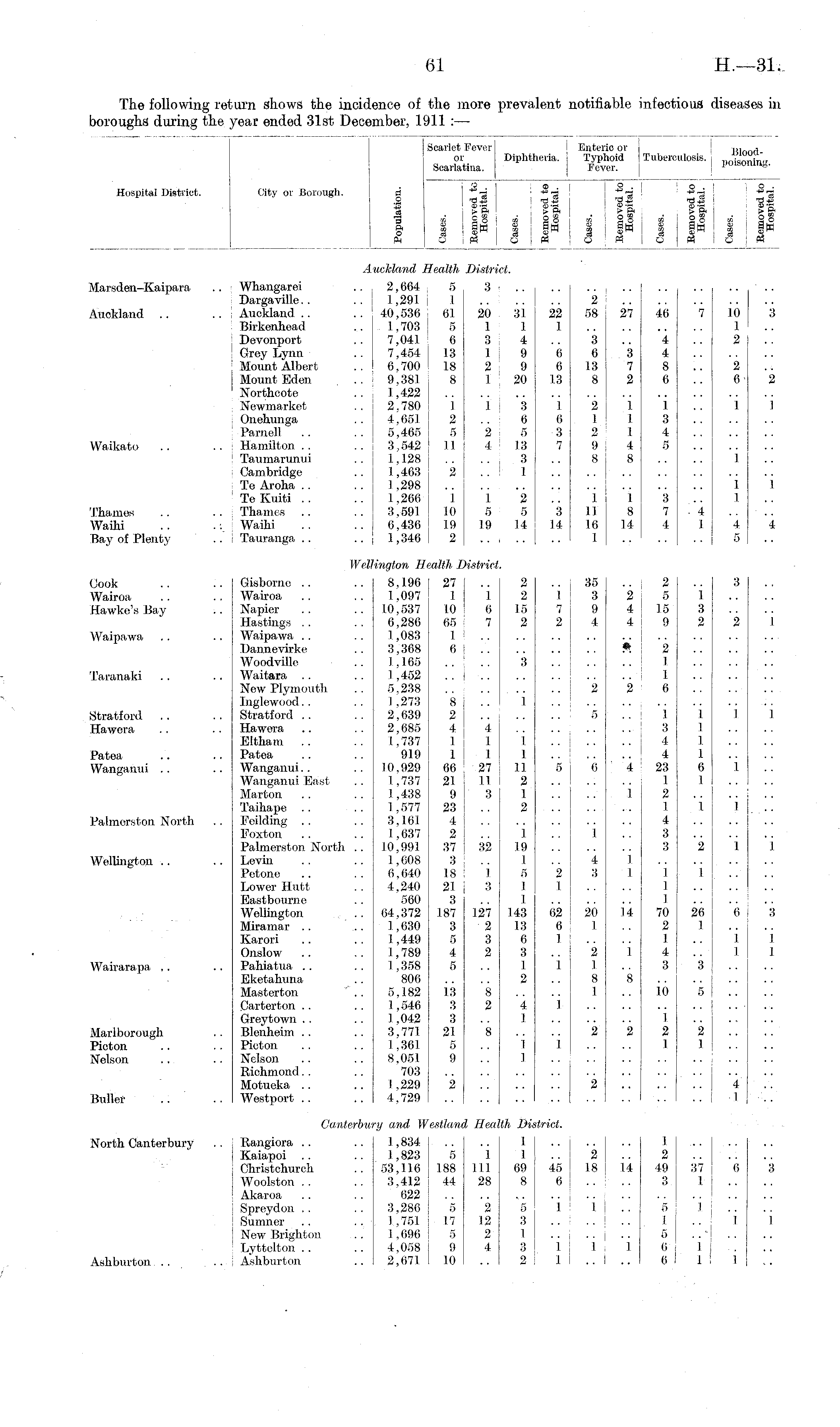 The following return shows the incidence of the more prevalent notifiable infectious diseases in boroughs during the year ended 31st December, 1911 : —