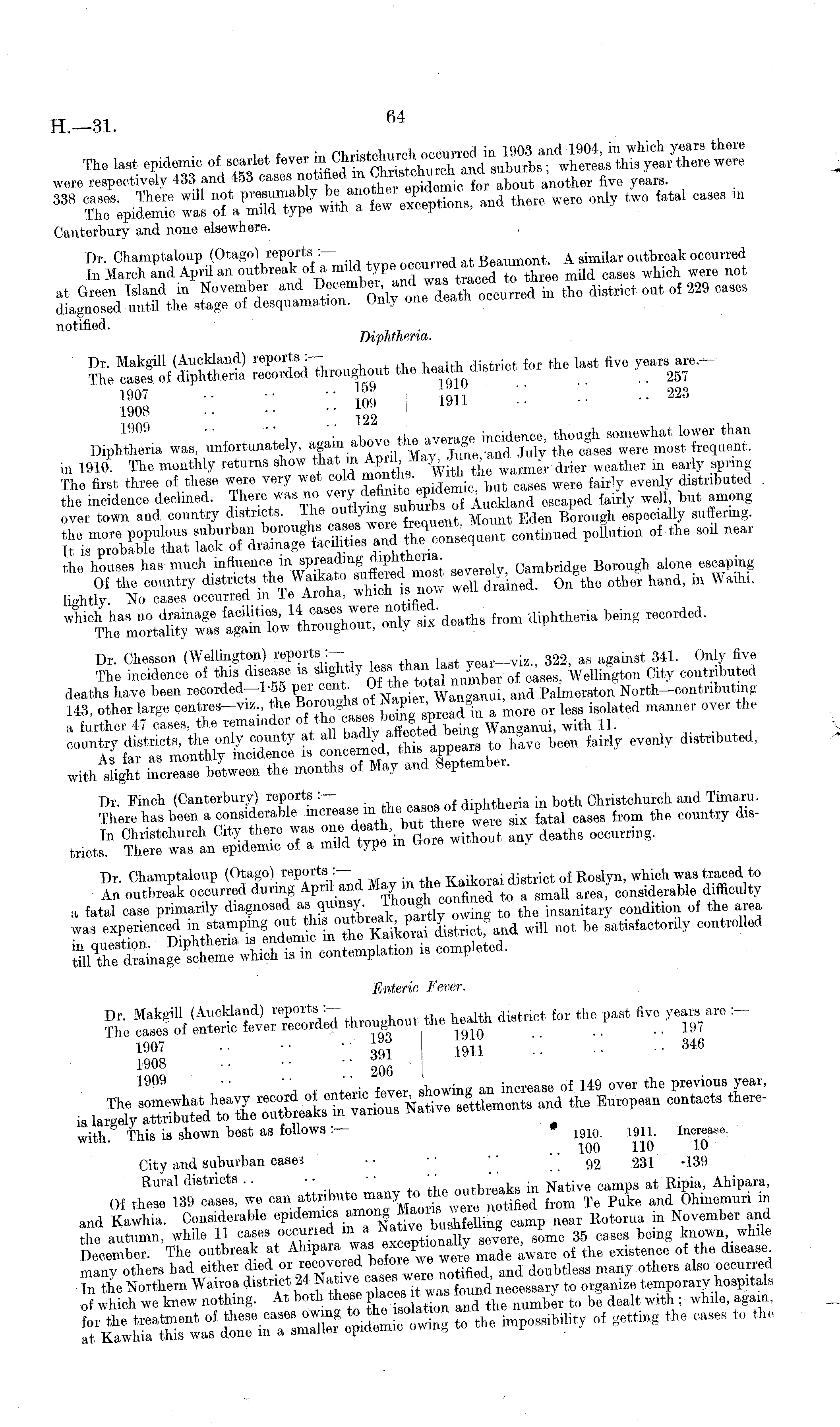 were respectively 433 and 454 cases no™~ *»■ idemic fot a bout another five years. 338 - *•» — «* - - w —™ Canterbury and none elsewhere. notified. ■ . Difhtherw. 3£ :: :: •■ g lttl : ;: " 22 " DiphZa was, fortunately, again a.jv. in 1910. The monthly return, show drier weather in early spring The first three of these were very wet cold months Wrt^ wie eyenl digtrlbuted the incidence declined. There was no tjjt escaped fairly well but among over town and country districts. ra £Zat, Mount Eden Borough especially suffering. continued pollution of the .oil near the houses has much influence in spreading Cambri dge Borough alone escaping Dr. Chesson (AVellington) reports :— year—viz., 322, as against 341. Only five The incidence of "ease 1S s l lg htly les \ Vellington City contributed deaths have been recorded-! -55 per cen Of the . d Palmerston North-contributing 143, other large centres-™., the ore mamer ove ,, the with inoZ. 1..*... fl.« month, of May .id S.pt.mb.r. Dr. Champtaloup (Otago) reports :- Kaikorai district of Roslyn, which was traced to An outbreak occurred durmg Apn and May in con^ derab l e difficulty a fatal case primarily diagnosed as owin to the insanitary condition of the area Enteric Fever. K;!Kf "throughout the district for the past five yea, are :- inn- • • 1-93 lylu • ' 04c l9or •• •• 3<n 1911 .. .. •■ 1908 •• •■ '■ 206 with. This is shown best as follows:— • 1910 . i 9U . Increase. City and suburban cases • • • • " 92 231 -139 Of we can attribute many to the m ijj-gg and KawhL Considerable epidenucs anu>ng Ma«™ n"r Eotorua in November and the autumn, while 11 se vere, some 35 cases being known while December. The outbreak at Ahipara was y , existence of the disease. other, had either die A SS and doubtless many others also occurred In the Northern Wairoa district 24 Native cases^ weIβ n , temporary hospitals of which we knew nothing. At both these fae wlth . whil6; agam . s*« ™^ ssibility of - ttins the Cilses t0 the