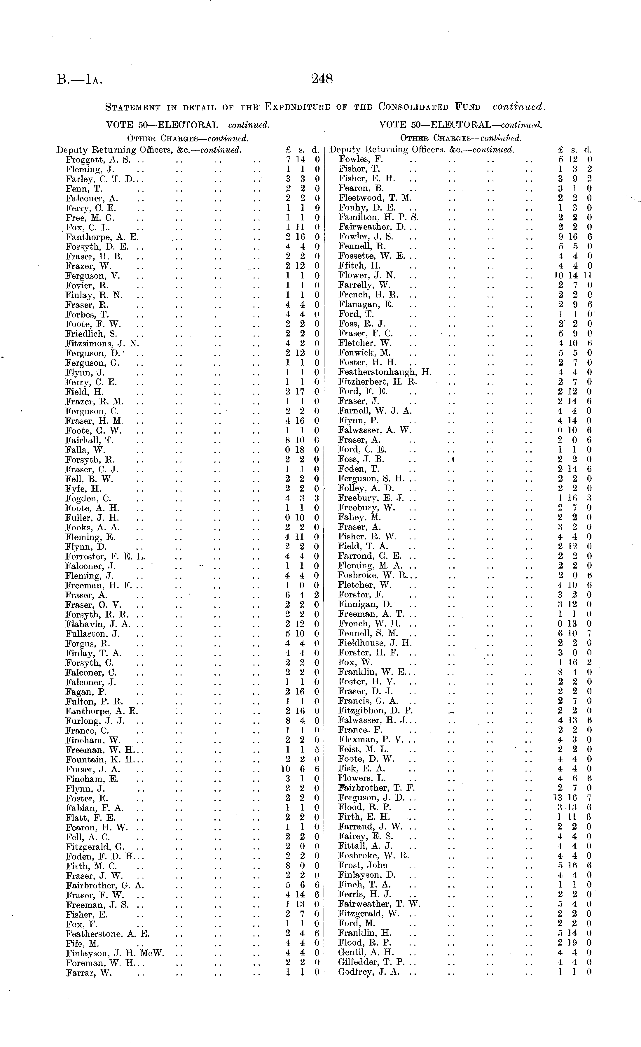 Statement in detail of the Expenditure op the Consolidated Fund — continued. VOTE 50—ELECTORAL— continued. VOTE 50—ELECTORAL— continued. Other Charges— continued. Other Charges— continued. Deputy Returning Officers, &c.— continued. £ s. d. Deputy Returning Officers, &c.— continued. £ s. d. Froggatt, A. S. .. .. .. .. 714 0 Fowles, F. .. .. .. .. 512 0 Fleming, J. .. .. .. . . 1.10 Fisher, T. .. . . . . .. 13 2 Farley, C. T. D... .. .. .. 3 3 0 Fisher, E. H. .. .. . . . . 3 9 2 Fenn, T. .. .. .. .. 2 2 0 Fearon, B. .. .. .. .. 3 10 Falconer, A. .. .. .. 2 2 0 Fleetwood, T. M. .. .. .. 2 2 0 Ferry, C. E. .. .. .. .. 110 Fouhy, D. E. .. .. . . .. 1 3 0 Free, M. G. .. .. . . .. 110 Familton, H. P. S. .. .. .. 2 2 0 Fox, C. L. .. .. . . .. 1110 Fairweather, D. .. .. . . . . 2 2 0 'Fanthorpe, A. E. ~. .. .. 216 0 Fowler, J. S. .. .. .. .. 916 6 Forsyth, D. E. . . . . .. . . 4 4 0 Fennell, R, .. .. .. . . 5 5 0 Fraser, H. B. .. .. .. . . 2 2 0 Fossette, W. E. .. .. .. . . 4 4 0 Frazer, W. .. .. .. .. 212 0 Ffitch, H. .. .. .. .. 4 4 0 Ferguson, V. .. .. . . . . 110 Flower, J. N. .. .. .. .. 10 14 11 Fevier, R. .. .. .. .. 110 Farrelly, W. .. .. .. .. 2 7 0 Finlay, R. N. .. .. . . .. 110 French, H. R. .. . . . . .. 2 2 0 Fraser, R. .. .. .. .. 4 4 0 Flanagan, E. .. .. .. .. 2 9 6 Forbes, T. .. .. .. .. 4 4 0 Ford, T. .. . . .. .. 110 Foote, F. W. .. .. .. .. 2 2 0 Foss, R. J. .. .. .. .. 2' 2 0 Friedlich, S. .. .. 2 2 0 Fraser, F. C. .. .. .. .. 5 9 0 Fitzsimons, J. N. .. .. .. 4 2 0 Fletcher, W. .. .. .. .. 410 6 Ferguson, D. ■.. .. .. .. 212 0 Fenwick. M. .. .. .. .. 5 5 0 Ferguson, G. .. .. .. .. 110 Foster, H. H. .. .. .. .. 2 7 0 Flynn, J. .. .. .. .. 1 1 0 Featherstonhaugh, H. .. .. .. 4 4 0 Ferry, C. E. . . .. .. .. 110 Fitzherbert, H. R. .. . . .. 2 7 0 Field, H. . . . . . . . . 217 0: Ford, F. E. :. . . .. .. 212 0 Frazer, R. M .. . . 110 Fraser, J. .. .. .. .. 214 6 Ferguson, C. .. .. .. ..220 Farnell, W. J. A. .. .. .. 440 Fraser, H. M. .. .. . . .. 4 16 0 Flynn, P. . . .. 4 14 0 Foote, G. W. .. . . .. .. 110 Falwasser, A. W. .. . . .. 010 6 Fairhall, T. .. .. . . .. 810 0 Fraser, A. .. .. .. .. 2 0 6 Falla, W. .. .. .. .. 018 0 Ford, C. E. . . .. .. .. 110 Forsyth, R. .. .. .. . . 2 2 0 Foss, J. B. .. .« .. .. 2 2 0 Fraser. C. J. .. .. . . .. 110 Foden, T. . . .. .. .. 214 6 Fell, B. W. .. .. .. .. 2 2 0 Ferguson, S. H. . . .. .. .. 2 2 0 Fyfe, H. .. . . .. .. 2 2 0 Folley, A. D. . . .. . . .. 2 2 0 Fogden, C. . . . . . . .. 4 3 3 Freebury, E. J. .. . . . . .. 1 16 3 Foote, A. H. .. .. .. . . 110 Freebury. W. .. .. .. .. 2 7 0 Fuller, J. H. .. .. .. .. 010 0 Fahey, M. .. . . .. . . 2 2 0 Fooks, A. A. .. .. .. 2 2 0 Fraser, A. . . . . . . .. 3 2 0 Fleming, E. . . .. .. .. 4 110 Fisher, R. W. .. .. .. .. 4 4 0 Flynn, D. . . . . .. .. 2 2 0 Field, T. A. .. .. .. .. 212 0 Forrester, F. E. L. .. . . .. 4 4 0 Farrond, G. E. .. .. .. .. 2 2 0 Falconer, J. .. .. .. .. 110 Fleming, M. A. .. .. .. .. 2 2 0 Fleming. J. . . .. .. .. 4 4 0 Fosbroke, W. R... .. .. .. 2 0 6 Freeman, H. F. . . .. .. .. 10 0 Fletcher, W. .. .. .. .. 410 0 Fraser, A. .. . . . . .. 6 4 2 Forster, F. .. .. .. .. 3 2 0 Fraser, O. V. . . .. .. .. 2 2 0 Finnigan, D. .. .. .. .. 3 12 0 Forsyth, R. R. . . . . .. .. 2 2 0 Freeman, A. T. .. . . .. .. 110 Flahavin, J. A. .. .. .. .. 2 12 0 French, W. H. .. .. .. .. 0 13 0 Fullarton, J. . . . . .. 510 0 Fennell, S. M. .. .. .. .. 610 7 Fergus, R. .. .. .. .. 4 4 0 Fieldhouse, J. H. .. .. .. 2 2 0 Finlay, T. A. .. .. .. . . 4 4 0 Forster, H. F. .. .. .. .. 3 0 0 Forsyth, C. .. .. .. .. 2 2 0 Fox, W. .. .. .. .. 116 2 Falconer, C. . . .. .. .. 2 2 0 Franklin, W. E... .. . . .. 8 4 0 Falconer, J. .. .. . . .. 110 Foster, H. V. .. .. .. .. 2 2 0 Fagan, P. . . . . .. .. 2 16 0 Fraser, D. J. .. . . .. .. 2 2 0 Fulton, P. R. .. .. .. . . 110 Francis, G. A. .. .. .. . . 2 7 0 Fanthorpe, A. E. .. .. .. 216 0 Fitzgibbon, D. P. „ .. . . 2 2 0 Furlong, J. J. . . .. .. .. 8 4 0 Falwasser, H. J. .. . . .. .. 413 6 France, C. .. . . . . .. 110 France. F. .. .. .. . . 2 2 0 Fincham, W. . . .. . . . . 2 2 0 Flexman, P. V. . . .. .. .. 4 3 0 Freeman, W. H... .. .. .. 115 Feist, M. L. .. . . .. .. 2 2 0 Fountain, K. H.. . .. . . .. 2 2 0 Foote, D. W. .. .. . . . . 4 4 0 Fraser, J. A. .. .. . . 10 6 6 Fisk, E. A. . . .. . . . . 4 4 0 Fincham. E. .. .. . . .. 3 10 Flowers, L. .. .. .. .. 4 6 6 Flynn, J. .. .. .. .. 2 2 0 Fairbrother, T. F. .. .. .. 2 7 0 Foster, E. . . .. .. . . 2 2 0 Ferguson. J. D. . . .. .. .. 13 16 7 Fabian, F. A. .. .. .. .. 110 Flood, R. P. .. .. .. .. 313 6 Flatt, F. E. .. .. .. .. 2 2 0 Firth, E. H. .. .. .. .. 1-11 6 Fearon, H. W. .. .. .. .. 110 Farrand, J. W. .. .. .. .. 2 2 0 Fell, A. C. .. .. .. .. 2 2 0 Fairey, E. 8. .. .. .. .. 4 4 0 Fitzgerald, G. .. .. .. .. 2 0 0 Fittall, A. J. . . .. . . 4 4 0 Foden, F. D. H... .. .. .. 2 2 0 Fosbroke, W. R. .. .. .. 4 4 0 Firth, M. C. .. .. . . .. 8 0 0 Frost, John . . .. .. .. 516 6 Fraser. J. W. .. .. .. .. 2 2 0 Finlayson, D. . . . . .. .. 4 4 0 Fairbrother, G. A. .. .. .. 5 6 6 Finch, T. A. .. .. .. .. 110 Fraser, F. W. .. .. . . .. 414 6 Ferris, H. J. .. .. .. .. 2 2 0 Freeman, J. S. .. .. .. .. 1 13 0 Fairweather, T. W. .. . . .. 5 4 0 Fisher, E. .. .. . . .. 2 7 0 Fitzgerald, W. . . .. .. .. 2 2 0 Fox, F. .. .. .. .. 110 Ford, M. .. .. .. .. 2 2 0 Featherstone, A. E. . . .. .. 2 4 6 Franklin, H. .. .. . . .. 5 14 0 Fife, M. .. . . .. .. 4 4 0 Flood, R. P. .. . . .. .. 219 0 Finlayson, J. H. McW. .. . . .. 4 4 0 Gentil, A. H. .. .. .. . . 4 4 0 Foreman, W. H... .. .. .. 2 2 0 Gilfedder, T. P. . . .. .. . . 4 4 0 Farrar, W. .. .. .. .. 110 Godfrey, J. A. ~ ~ .. . . 110