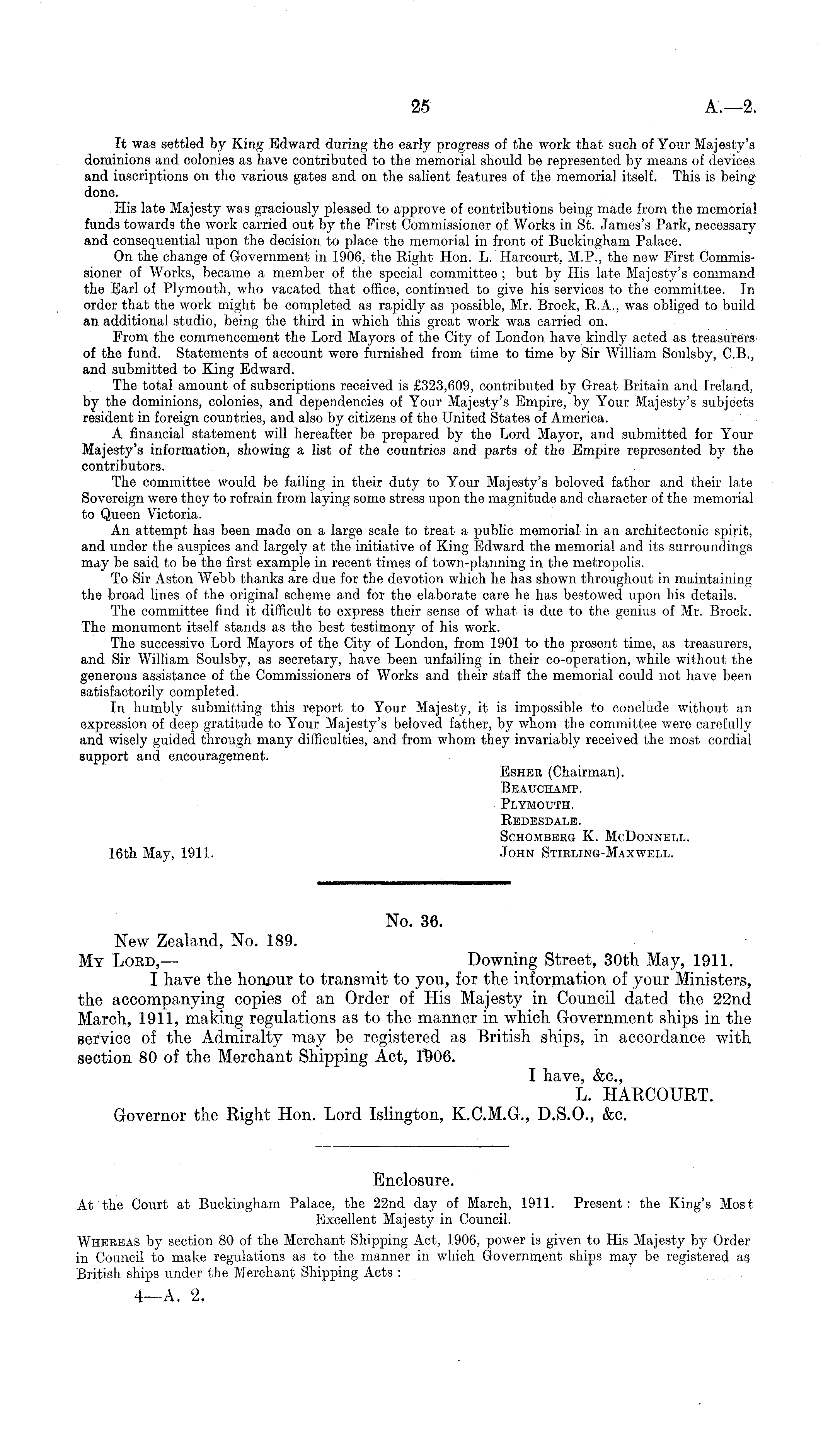 No. 36. New Zealand, No. 189. My Lord,— Downing Street, 30th May, 1911. I have the honour to transmit to you, for the information of your Ministers, the accompanying copies of an Order of His Majesty in Council dated the 22nd March, 1911, making regulations as to the manner in which Government ships in the service of the Admiralty may be registered as British ships, in accordance with section 80 of the Merchant Shipping Act, 1906. I have, &c, L. HARCOURT. Governor the Right Hon. Lord Islington, K.C.M.G., D.5.0., &c. Enclosure. At the Court at Buckingham Palace, the 22nd day of March, 1911. Present: the King's Most Excellent Majesty in Council. Whereas by section 80 of the Merchant Shipping Act, 1906, power is given to His Majesty by Order in Council to make regulations as to the manner in which Government ships may be registered as British ships under the Merchant Shipping Acts ; 4—A. %