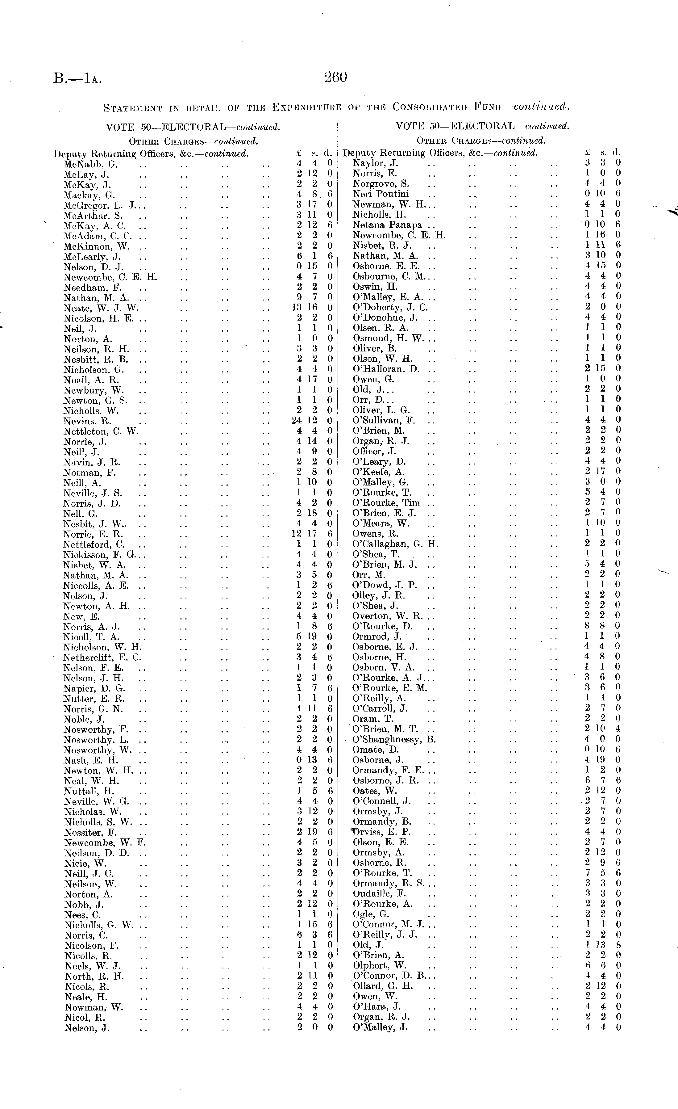 Statement in detail of the Expenditure of the Consolidated Fund — continued. VOTE 50—ELECTORAL— continued. VOTE 50— ELECTORAL— continued. Othek Charges— continued. Other Charges— continued. Deputy Returning Officers, &c.— continued. £ s. d. ; Deputy Returning Officers, &c. — continued. £ «. d. McNabb, G. .. .. .. .. 4401 Naylor, J. .. .. .. . . 3 3 0 McLay, J. . . .. .. .. 212 0 Norris, E. .. .. . . . . 10 0 McKay, J. .. . . . . .. 2 2 0 Norgrove, S. .. .. . . 4 4 0 Mackay, G. . . . . . . . . 4 8,6 Neri Poutini .. .. . . .. 0106 McGregor, L. J. .. .. .. .. 317 0 Newman, W. H... .. .. .. 4 4 0 McArthur, S 3 110 Nicholls, H. . . .. . . .. 110 McKay, A. C. .. .. . . . . 212 6 Netana Panapa .. .. .. . . 010 6 McAdam, C 0... .. . . . . 220 Newcombe, CE. H. . . . . .. 1 16 0 ' McKinnon, W. .. .. . . .. 2 2 0 Nisbet, R. J. .. . . .. .. 1116 McLearly, J. .. .. .. 6 16! Nathan, M. A. .. .. .. .. 310 0 Nelson, D. J. . . .. . . 015 0 Osborne, E. E. .. .. .. .. 415 0 Newcombe, C. E. H. . . . . .. 4 7 0 Osbourne, CM... .. .. . . 440 Needham, l< , . . . . . .. 2 2 0 Oswin, H. .. .. . . . . 4 4 0 Nathan, M. A. . . . . . . . . 9 7 0 O'Malley, E. A. .. . . .. . . 4 4 0 Neate, W. J. W. .. . . . . 13 16 0 O'Doherty, J. C. .. .. . . 2 0 0 Nicolson, H. E. .. .. .. .. 2 2 0 O'Donohue, J. . . .. .. .. 4 4 0 Neil, J. .. .. .. .. 110 Olsen, R. A. . . .. .. .. 110 Norton, A. .. .. .. .. 10 0 Osmond, H. W. .. .. .. .. 110 Neilson, R. H. .. .. .. .. 3 3 0! Oliver, B. . . .. .. .. 110 Nesbitt, R. B. .. .. . . . . 2 2 0 Olson, W. H. .. .. . . .. 110 Nicholson, G. . . . . . . . . 4 4 0 O'Halloran, D. . . .. . . . . 2 15 0 Noall, A. R. .. .. .. .. 417 0 Owen, G. .. . . . . . . 10 0 Newbury, W. .. . . . . . . 110 Old, J. .. .. .. . . . . 2 2 0 Newton, G. S. .. . . . . . . 110 Orr, D... .. .. 110 Nicholls, W. .. . . . . .. 2 2 0 Oliver, L. G. .. .. .. .. 110 Nevins, R. .. . . .. .. 24 12 0 i O'Sullivan, P. . . .. .. . . 4 4 0 Nettleton, CW. . . .. . . 4 4 0 O'Brien, M. .. .. .. . . 2 2 0 Norrie, J. .. .. .. .. 414 0 I Organ, R. J. .. .. .. . . 2 2 0 Neill, J. .. .. .. .. 4 9 0 j Officer, J. . . .. . . . . 2 2 0 Navin, J. R. .. .. .. .. 2 2 0 O'Leary, D. . . . . . . . . 4 4 0 Notman, P. . . .. . . . . 2 8 0 O'Keefo, A. .. . . . . . . 2 17 0 Neill, A. .. .. .. .. 110 0 O'Malley, G. .. .. .. .. 3 0 0 Neville, J. S. .. .. . . .. 110 O'Rourke, T. .. .. . . .. 5 4 0 Norris, J. D. ■ .. .. .. .. 4 2 0 O'Rourke, Tim .. .. .. .. 2 7 0 Nell, G. .. .. .. .. 218 0 O'Brion, E. J. .. .. .. .. 2 7 0 Nesbit, .). W. .. .. .. .. 4 4 0 O'Meara, W. .. .. .. .. I 10 0 Norrie, E. R. .. .. . . . . 12 17 6 Owens, R. .. .. . . . . 110 Nettleford, C. .. .. . . ; . 110 O'Callaghan, G. H. .. .. .. 2 2 0 Nickisson, P. G.. . .. .. . . 4 4 0 O'Shea, T. . . .. . . . . 110 Nisbet, W. A. .. .. .. . . 4 4 0 O'Brien, M. J. .. .. . . . . 5 4 0 Nathan, M. A. . . . . .. .. 3 5 0 Orr, M. .. .. . . . . 2 2 0 Niccolls, A. E. .. . . . . . . 12 6 O'Dowd, J. P. .. .. .. . . 110 Nelson, J. .. .. 2 2 0 Olley, J. R. .. .. .. . . 2 2 0 Newton, A. H. .. .. .. . . 2 2 0 O'Shea, J. .. .. . . .. 2 2 0 New, E. .. . . .. .. 4 4 0 Overton, W. R. .. . . .. .. 2 2 0 Norris, A. J. .. .. . . .. 18 6 O'Rourke, D. .. .. .. .. 8 8 0 Nicoll, T. A. . . .. .. 519 0 Ormrod, J. .. .. . . . . 110 Nicholson, W. H. .. .. .. 2 2 0 Osborne, E. J. .. .. .. .. 440 Netherclift, E. C .. .. -.. 3 4 6 Osborne, H. .. .. . . .. 4 8 0 Nelson, P. E. .. .. .. .. 110 Osborn, V. A. . . .. .. .. 110 Nelson, J. H. . . .. .. .. 2 3 0 O'Rourke, A. J. .. .. .. ..'360 Napier, D..G. .. . . . . .. 17 6 O'Rourke, E. M. . . . . .. 3 6 0 Nutter, E. R. . . .. .. .. 110 O'Reilly, A. .. . . . . .. 110 Norris, G. N. . . . . . . . . 1116 O'Carroll, J. .. . . .. 2 7 0 Noble, J. . . . . . . . . 2 2 0 Oram, T. . . . . . . ..220 Nosworthy, P. .. .. .. .. 2 2 0 O'Brien, M. T. . . .. .. .. 210 4 Nosworthy, L. .. .. .. .. 2 2 0 O'Shanghnessy, B. .. .. . . 4 0 0 Nosworthy, W. .. .. .. .. 4 4 0 Ornate, D. . . .. .. .. 010 6 Nash, E. H. .. .. .. .. 0 13 6 Osborne, J. .. .. .. .. 4 19 0 Newton, W. H. .. .. .. .. 2 2 0 Ormandy, F. E. . . .. .. .. 12 0 Neal, W. H. .. .. .. .. 2 2 0 Osborne, J. R. .. .. . . .. 6 7 6 Nuttall, H. .. .. .. .. 15 6 Oates, W. .. .. .. .. 2 12 0 Neville, W. G. .. . . .. .. 4 4 0 O'Connell, J. .. .. . . 2 7 0 Nicholas, W. .. . . .. .. 312 0 Ormsby, J. . . .. .. . . 2 7 0 Nicholls, S. W. .. . . . . .. 2 2 0 Ormandy, B. .. .. . . 2 2 0 Nossiter, P. . . .. .. .. 219 6 T)rviss, E. P. .. . . . . .. 4 4 0 Newcombe, W. P. . . .. .. 4 5 0 Olson, E. E. .. .. . . . . 2 7 0 Neilson, V. D. .. .. .. .. 2 2 0 Ormsby, A. .. .. .. .. 2 12 0 Nicie, W. .. .. .. .. 3 2 0 Osborne, R. .. . . .. .. 2 9 6 Neill, J. C. . . .. .. •. 2 2 0 O'Rourke, T. .. . . .. . . 7 5 6 Neilson, W. .. . . .. .. 4 4 0 Ormandy, R. S. .. .. . . . . 3 3 0 Norton, A. .. . . . . .. 2 2 0 Oudaille, P. . . . . .. . . 3 3 0 Nobb, J. . . . . .. .. 212 0 O'Rourke, A. .. . . .. 2 2 0 Nees, C . . . . . . . . 110 Ogle, G. . . .. . . .. 2 2 0 Nicholls, G. W. . . . . . . .. 1 15 6 O'Connor, M. J. . . .. . . .. 110 Norris, C. .. .. .. ■. 6 3 6 O'Reilly, J. J. . . .. .. .. 2 2 0 Nicolson, P. .. . . .. .. 110 Old, J. .. .. .. . . I 13 8 Nicolls, R. .. .. . . .. 212 0 O'Brien, A. . . .. .. . . 2 2 0 Neels, W. J. .. .. . . . . 110 Olphert, W. . . .. .. .. 6 6 0 North, R. H. . . .. . . . . 2 110 O'Connor, D. 8.. . .. . . . . 4 4 0 Nicols, R. . . . . .. . . 2 2 0 Ollard, G. H. .. .. .. . . 212 0 Neale, H. . . .. .. . . 2 2 0 Owon, W. .. .. . . . . 2 2 0 Newman, W. .. .. . . ■ . 4 4 0 O'Hara, J. .. .. . . . . 4 4 0 Nicol, R. . . .. .. . . 2 2 0 Organ, R. J. .. . . .. 2 2 0 Nelson, J. .. .. .. . . 2 0 0 O'Malley, J. .. .. .. .. 4 4 0