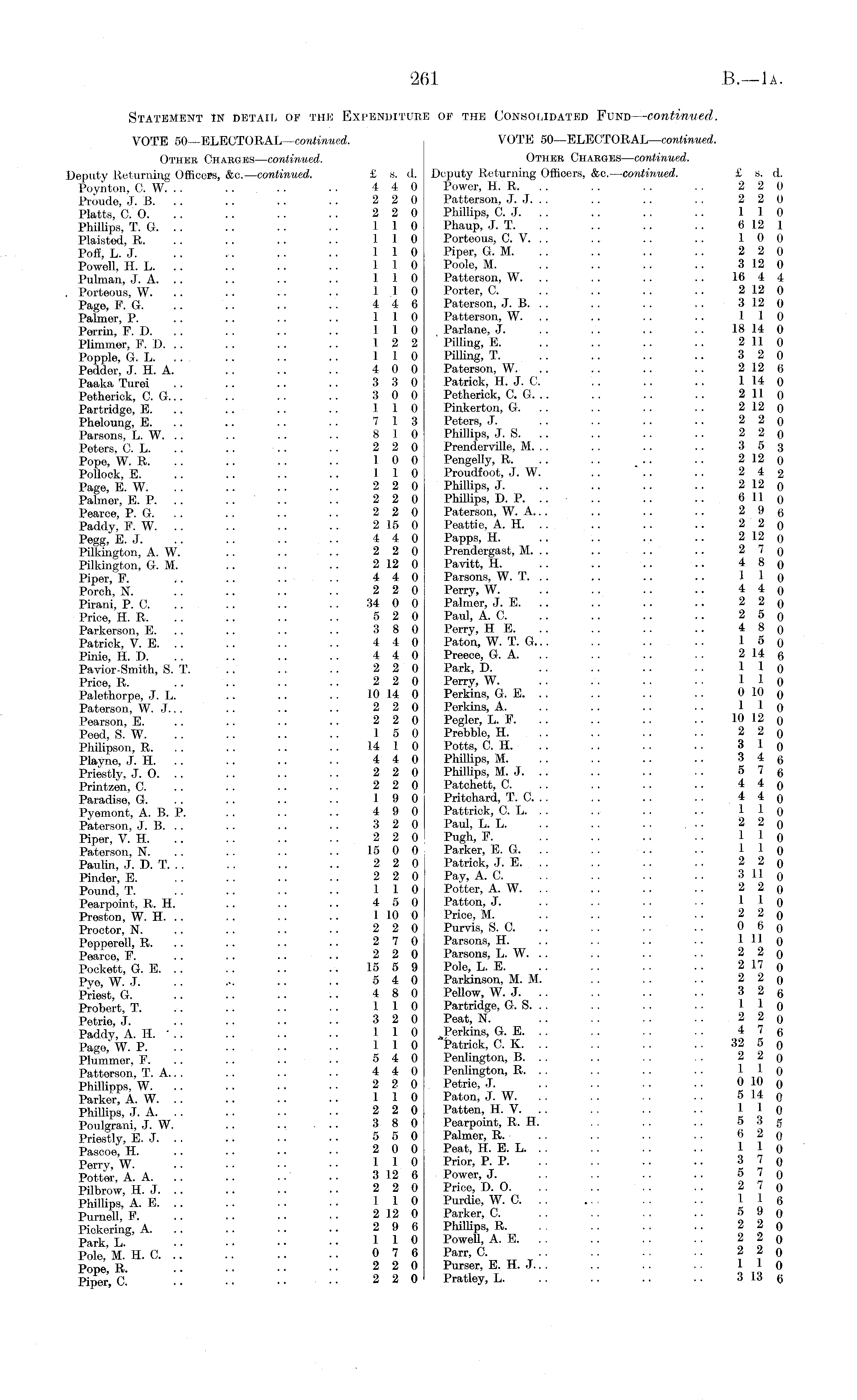 Statement in detail of thje Expenditure of the Consolidated Fund — continued. VOTE 50— ELECTORAL— continued. VOTE 50^ELECTORAL— continued. Other Charges— continued. Other Charges— continued. Deputy Returning Officers, &c.— continued. £ s. d. Deputy Returning Officers, &c.— continued. £ s. d. Poynton, C. W. .. .. . . . . 4 4 0 Power, H. R. . . . . .. . . 2 2 0 Proude J B . .. .. .. 2 2 0 Patterson, J. J. . . .. .. . . 2 2 0 Platts, C 0... .. .. .. 220 Phillips, C. J. .. .. .. .. 110 Phillips, T. G. . . .. .. .. 110 Phaup, J. T. . . .. .. .. 612 1 Plaisted, R. .. .. .. .. 110 Porteous, C. V. . . .. .. .. 10 0 Poff L J .. .. .. .. 110 Piper, G. M. .. .. .. .. 2 2 0 Powell, H. L. . . .. .. .. 110 Poole, M. .. .. .. .. 312 0 Pulman, J. A. .. . . .. .. 110 Patterson, W. .. .. .. .. 16 4 4 Porteous, W. .. . . .. . . 110 Porter, C. . . .. .. .. 212 0 Page, F. G. .. . . .. .. 4 4 6 Paterson, J. B. . . .. . . . . 312 0 Palmer, P. . . . . . . .. 110 Patterson, W. . . .. .. .. 110 Perrin F D. . . . . . . .. 110 Parlane, J. .. .. .. . . 18 14 0 Plimmer, F. D. .. . . . . .. 12 2' Pilling, E. .. .. .. .. 2110 Popple, G. L. .. .. .. .. 110 Pilling, T. .. .. .. .. 3 2 0 Pedder, J. H. A. . . .. .. 4 0 0 Paterson, W. .. .. .. .. 212 6 Paaka Turei .. .. .. .. 3 3 0 Patrick, H. J. C. .. .. .. 114 0 Petherick, C. G... .. .. .. 3 0 0 Petherick, C. G. .. .. .. .. 211 o Partridge, E. .. .. .. 110 Pinkerton, G. .. . . .. . . 212 o Pheloung, E. .. .. .. .. 7 13 Peters, J. .. . . .. .. 2 2 o Parsons, L. W. .. .. .. .. 8 10 Phillips, J. S. .. .. .. .. 2 2 o Peters, C. L. .. .. .. .. 2 2 0 Prenderville, M. . . .. .. .. 3 5 3 Pope, W. R. .. .. .. .. 10 0 Pengelly, R. . . . . .. .. 212 o Pollock E .. .. . . .. 110 Proudfoot, J. W. .. " .. .. 2 4 2 Page, E. W. . . .. . . .. 22 0 Phillips, J. .. .. .. .. 212 0 Palmer, E. P. . . . . ... .. 2 2 0 Phillips, D. P. .. .. .. .. 611 0 Pearce, P. G. .. .. .. . . 2 2 0 Paterson, W. A... .. .. .. 2 9 q Paddy, F. W. .. .. .. .. 215 0 Peattie, A. H. .. .. .. .. 2 2 o Pegg, E. J. .. .. .. .. 4 4 0 Papps, H. .. .. ... .. 212 0 Pilkington, A. W. .. .. .. 2 2 0 Prendergast, M. .. .. .. .. 2 7 q Pilkington, G. M. .. .. .. 212 0 Pavitt, H. .. .. .. .. 4 8 0 Piper, F. ~ .. .. - .. 4 4 0 Parsons, W. T. .. .. .. .. 1 1 0 Porch, N. .. .. .. .. 2 2 0 Perry, W. .. . . .. .. 4 4 0 Pirani, P. C. .. .. .. . . 34 0 0 Palmer, J. E. .. .. .. .. 2 2 0 Price, H. R. .. .. .. ... 5 2 0 Paul, A. C. .. .. .. .. 2 5 o Parkerson, E. .. .. .. .. 3 8 0 Perry, HE... .. .. .. 4 8 0 Patrick, V. E. .. .. .. .. 4 4 0 Paton, W. T. G... . . .. .. l^o Pinie, H. D. .. .. .. .. 4 4 0 Preece, G. A. .. .. .. .. 214 6 Pavior-Smith, S. T. .. .. .. 2 2 0 Park, D. . . .. .. . . 1 1 0 Price, R. .. .. .. .. 2 2 0 Perry, W. . . . . . . .. 1 1 0 Palethorpe, J. L. .. .. .. 10 14 0 Perkins, G. E. . . . . .. .. 010 0 Paterson, W. J. .. .. .. .. 2 2 0 Perkins, A. .. .. .. .. 1 1 0 Pearson, E 2 2 0 Pegler, L. F .. .. 10 12 0 Peed, S. W. .. .. .. .. 15 0 Prebble, H. . . . . . . .. 22 0 Philipson, R. .. . . .. .. 14 1 0 Potts, C. H. . ... . . .. 3 1 0 Playne, J. H. .. .. .. .. 4 4 0 PhiUips, M. .. .. .. .. 3 4 6 Priestly, J. O. .. .. .. .. 22 0 Phillips, M. J. .. .. .. . • 57 6 Printzen, C. .. . . .. .. 2 2 0 Patchett, C. .. . . .. .. 4*o Paradise, G. .. . . .. .. 19 0 Pritchard, T. C. .. . . . . .. 4 4 q Pyemont, A. B. P. .. . . .. 49 0 Pattrick, C. L. . . .. .. .. 1 1 0 Paterson, J. B. .. .. .. .. 3 2 0 Paul, L. L. .. . . . . ... 2 2 0 Piper, V. H .. .. 2 2 0 Pugh, F. .. 1 1 0 Paterson, N. . . .. .. •. 15 0 0 Parker, E. G. .. . . .. .. 1 1 0 Paulin, J. D. T. .. .. .. .. 2 2 0 Patrick, J. E. , .. . . .. .. 2 2 0 Pinder, E. .. . . .. .. 2 2 0 Pay, A. C. .. . . .. . . 311 0 Pound, T. . . .. .. .. 110 Potter, A. W. . . .. .. .. 2 2 0 Pearpoint, R. H. .. .. .. 4 5 0 Patton, J. . . .. .. ■ • 1 1 0 Preston, W. H. .. . . . . .. 110 0 Price, M. . . .. .. .. 2 2 0 Proctor, K. .. .. .. • • 2 2 0 Purvis, S. C. .. . . . . .. 0 6 0 Pepperell, R. .. .. .. .. 27 0 Parsons, H. .. .. .. .. 111 0 Pearce, F. .. .. .. .. 22 0 Parsons, L. W. .. . . .. .. 22 0 Pockett, G. E 15 5 9 Pole, L. E 217 0 Pye WJ. • • ••• •• • ■ 5 4 0 Parkinson, M. M. . . . . . . 2 I o Priest G .. .. .. •• 480 Pellow, W. J. . . .. .. .. 3 2 6 Probert, T. .. .. .. .. 110 Partridge, G. S. . . .. .. .. 1 1 0 Petrie, J. .. .. .. • • 3 2 0 Peat, N. .. .. .. .. 2 2 0 Paddy AH.'.. .. . . •. 110 G. E. . . . . . . . . 4 7 6 Page, W. P. .. •• •• •• 110 Patrick, C. K. .. .. .. .. 32 5 0 Hummer, F. .. . • • • 54 0 Penlington, B. . . .. . . .. 2 2 0 Patterson, T. A.. . .. .. .. 4 4 0 Penlington, R. . . .. .. .. 1 1 0 Phillipps, W 2 2 0 Petrie, J °"? ° Parker AW. . .. .. •• 110 Paton, J. W. .. .. .. .. 514 0 Phillips, J. A 22 0 Patten, H. V. .. . . . . .. 1 1 0 Poulgrani, J. W. .. 3 8 0 Pearpoint, R. H. . . . . .. 5 6 5 Priestly, E. J. .. .. .. • • 55 0 Palmer, R. .. . . .. .. 62 0 Pascoe, H 2 0 0 Peat, H. E. L 1 1 0 Perry W .. • • • ■ 110 Prior, P. P. . . . . .. .. 37 0 Potter, A. A. .. .. .. .. 312 6 Power, J. . . .. .. .. 5 7 0 Pilbrow, H. J 2 2 0 Price, D. 0 2 7 0 Phillips, A. E 110 Purdie, W. C 1 1 6 Pumell F .. 212 0 Parker, C. . . . . . . .. 5 9 0 Pickering, A 2 9 6 Phillips, R 2 2 0 Park L .. ..110 Powell, A. E. .. .. .. .. 2 2 0 Pole,'lt.'H. C 0 7 6 Parr, C. 22 0 Pope R . . .. .. 22 0 Purser, E. H. J. . . .. .. . . 1 1 0 Piper, C 2 2 0 Pratley, L 313 6