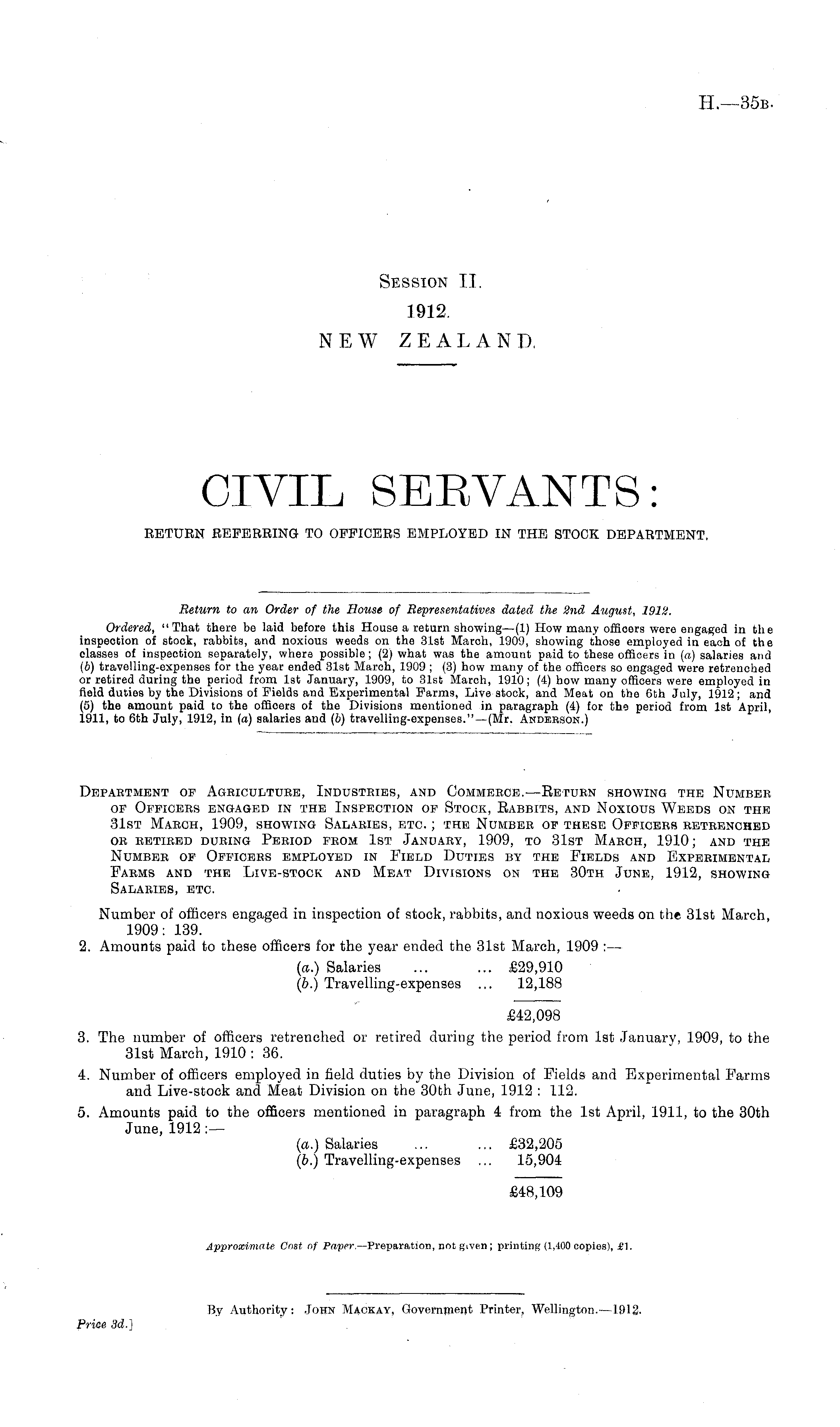 Department op Agriculture, Industries, and Commerce.—Return showing the Number of Officers engaged in the Inspection of Stock, Rabbits, and Noxious Weeds on the 31st March, 1909, showing Salaries, etc. ; the Number of these Officers retrenched or retired during Period feom Ist Januaby, 1909, to 31st March, 1910; and the Number of Officers employed in Field Duties by the Fields and Experimental Farms and the Live-stock and Meat Divisions on the 30th June, 1912, showing Salaries, etc. Number of officers engaged in inspection of stock, rabbits, and noxious weeds on the 31st March, 1909: 139. 2. Amounts paid to these officers for the year ended the 31st March, 1909: — (a.) Salaries ... ... £29,910 (b.) Travelling-expenses ... 12,188 £42,098 3. The number of officers retrenched or retired during the period from Ist January, 1909, to the 31st March, 1910 : 36. 4. Number of officers employed in field duties by the Division of Fields and Experimental Farms and Live-stock and Meat Division on the 30th June, 1912 : 112. 5. Amounts paid to the officers mentioned in paragraph 4 from the Ist April, 1911, to the 30th June, 1912 :— (a.) Salaries ... ... £32,205 (b.) Travelling-expenses ... 15,904 £48,109 Approximate Cost of Paper. —Preparation, not given; printing (1,400 copies), ,£l.