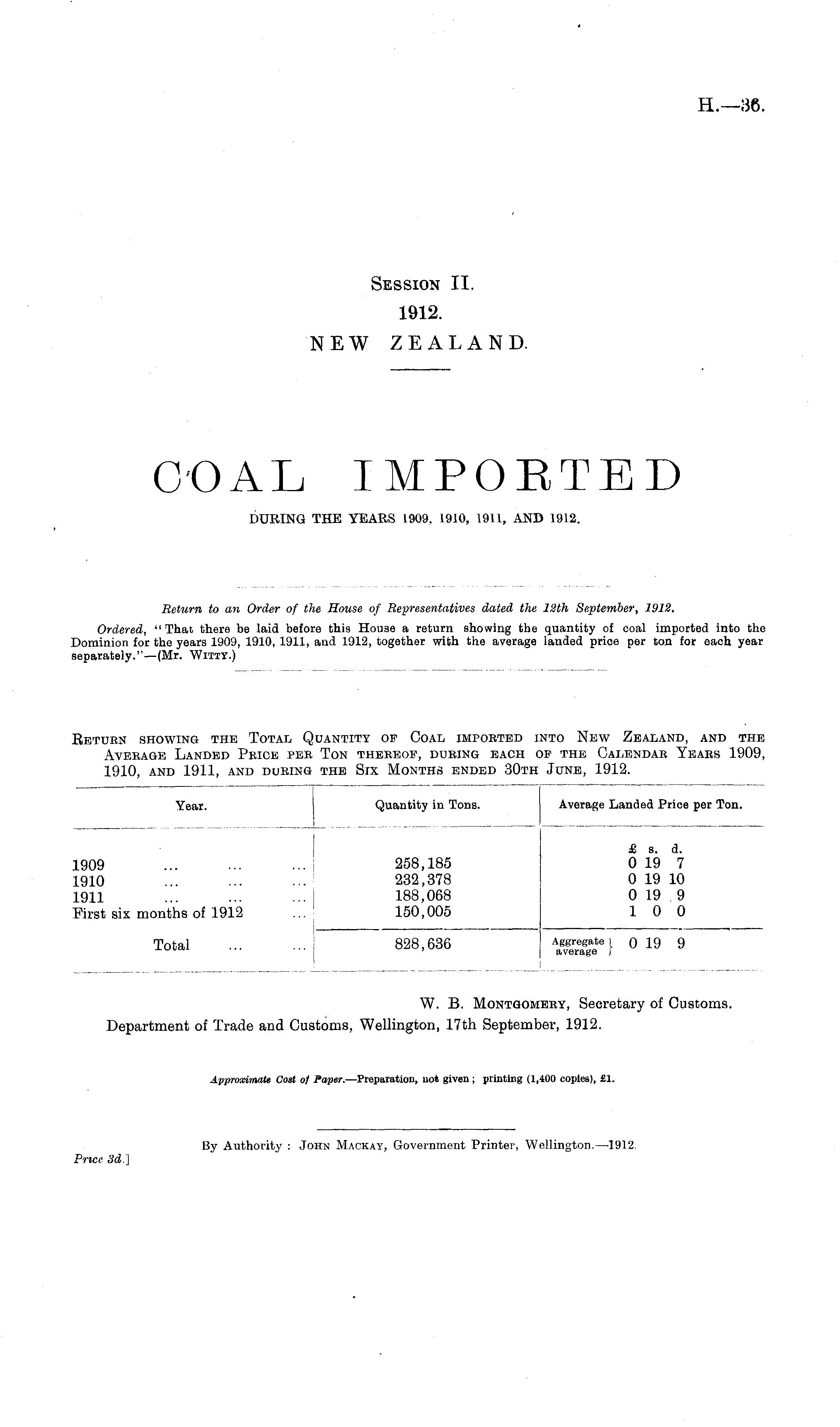 W. B. Montgomery, Secretary of Customs. Department of Trade and Customs, Wellington, 17th September, 1912. Approximate Cost o) Paper. —Preparation, not given; printing (1,400 copies), £1.