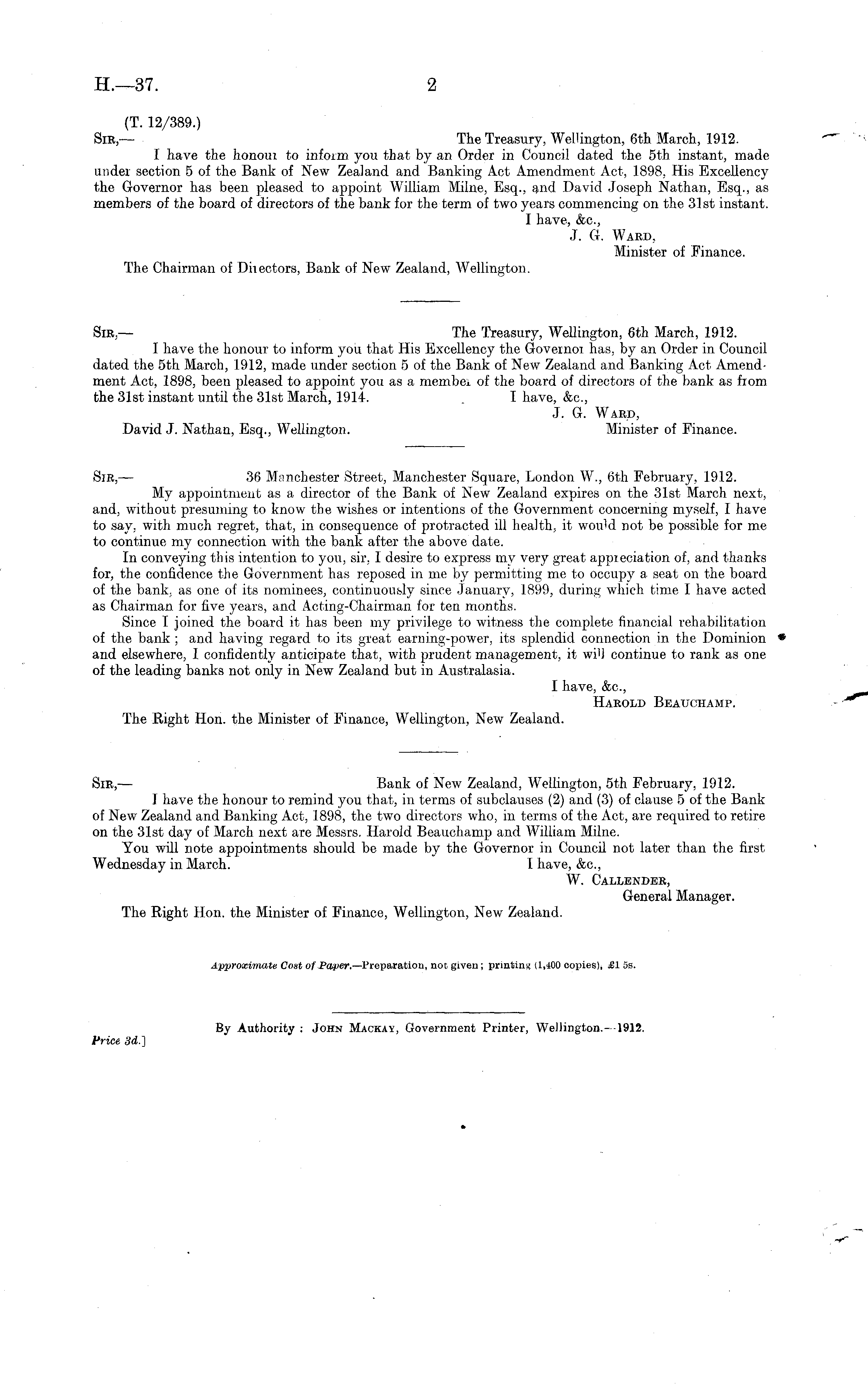 (T. 12/389.) Sir,— The Treasury, Wellington, 6th March, 1912. I have the honoui to inform you that by an Order in Council dated the sth instant, made under section 5 of the Bank of New Zealand and Banking Act Amendment Act, 1898, His Excellency the Governor has been pleased to appoint William Milne, Esq., and David Joseph Nathan, Esq., as members of the board of directors of the bank for the term of two years commencing on the 31st instant. I have, &c, J. G. Ward, Minister of Finance. The Chairman of Diiectors, Bank of New Zealand, Wellington.