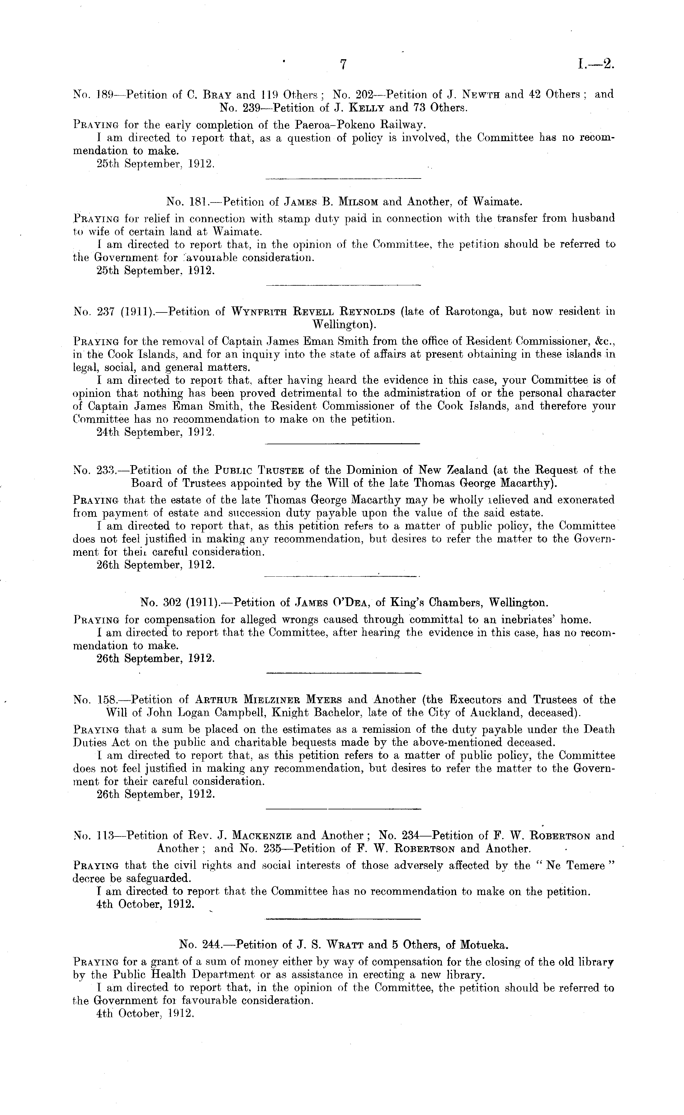 No. 237 (1911). —Petition of Wynfrith Revell Reynolds (late of Rarotonga, but now resident in Wellington). Praying for the removal of Captain James Eman Smith from the office of Resident Commissioner, Ac, in the Cook Islands, and for an inquiiy into the state of affairs at present obtaining in these islands in legal, social, and general matters. I am directed to report that, after having heard the evidence in this case, your Committee is of opinion that nothing has been proved detrimental to the administration of or the personal character of Captain James Eman Smith, the Resident Commissioner of the Cook Islands, and therefore your Committee has no recommendation to make on the petition. 24th September, 1912.