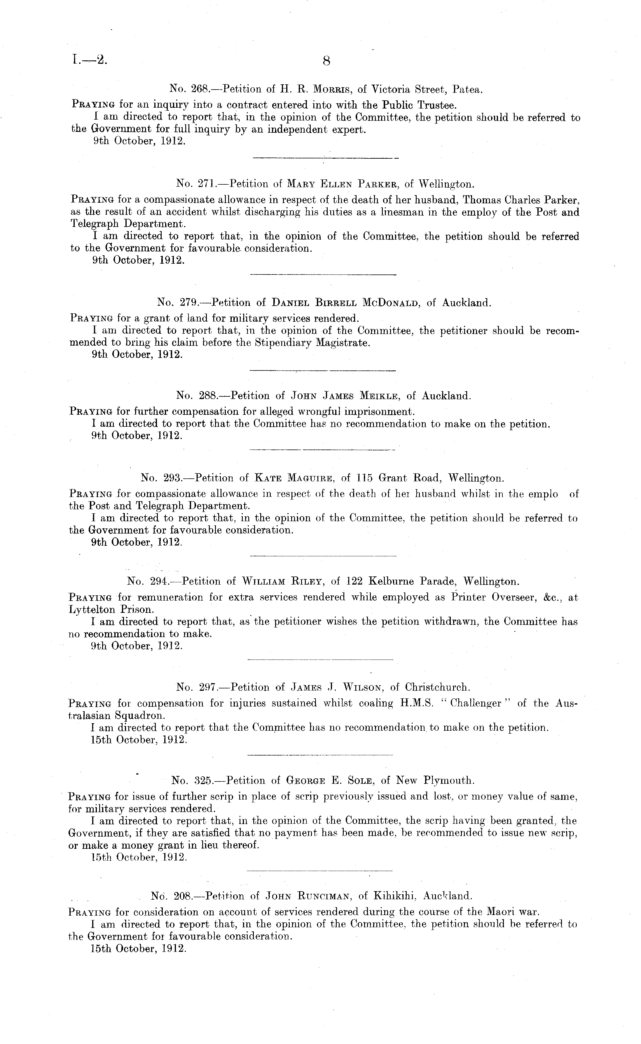 No. 294.—Petition of William Riley, of 122 Kelburne Parade, Wellington. Praying for remuneration for extra services rendered while employed, as Printer Overseer, &c, at Lyttelton Prison. I am directed to report that, as the petitioner wishes the petition withdrawn, the Committee has no recommendation to make. 9th October, 1912. No. 297.—Petition of James J. Wilson, of Christchurch. Praying for compensation for injuries sustained whilst coaling H.M.S. " Challenger " of the Australasian Squadron. I am directed to report that the Committee has no recommendation to make on the petition. 15th October, 1912.