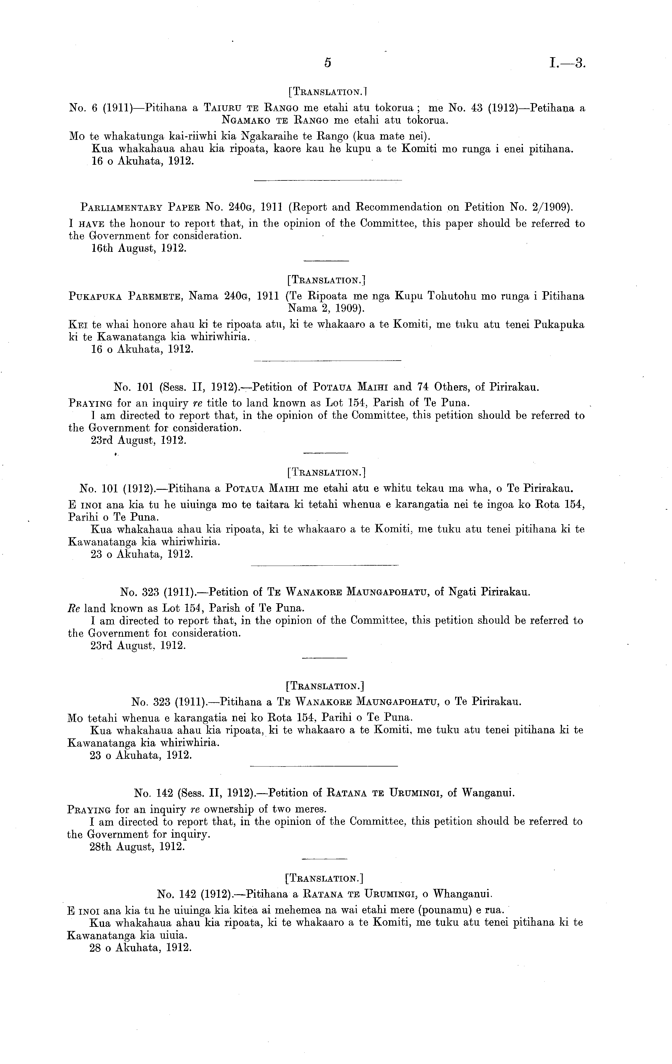 [Translation.] No. 101 (1912). —Pitihana a Potaua Maihi me etahi atu c whitu tekau ma wha, o Te Pirirakau. E INOI ana kia tv he uiuinga mo te taitara ki tetahi whenua c karangatia nei te ingoa ko Rota 154, Parihi o Te Puna. Kua whakahaua ahau kia ripoata, kite whakaaro a te Komiti, me tuku atu tenei pitihana kite Kawanatanga kia whiriwhiria. 23 o Akuhata, 1912.
