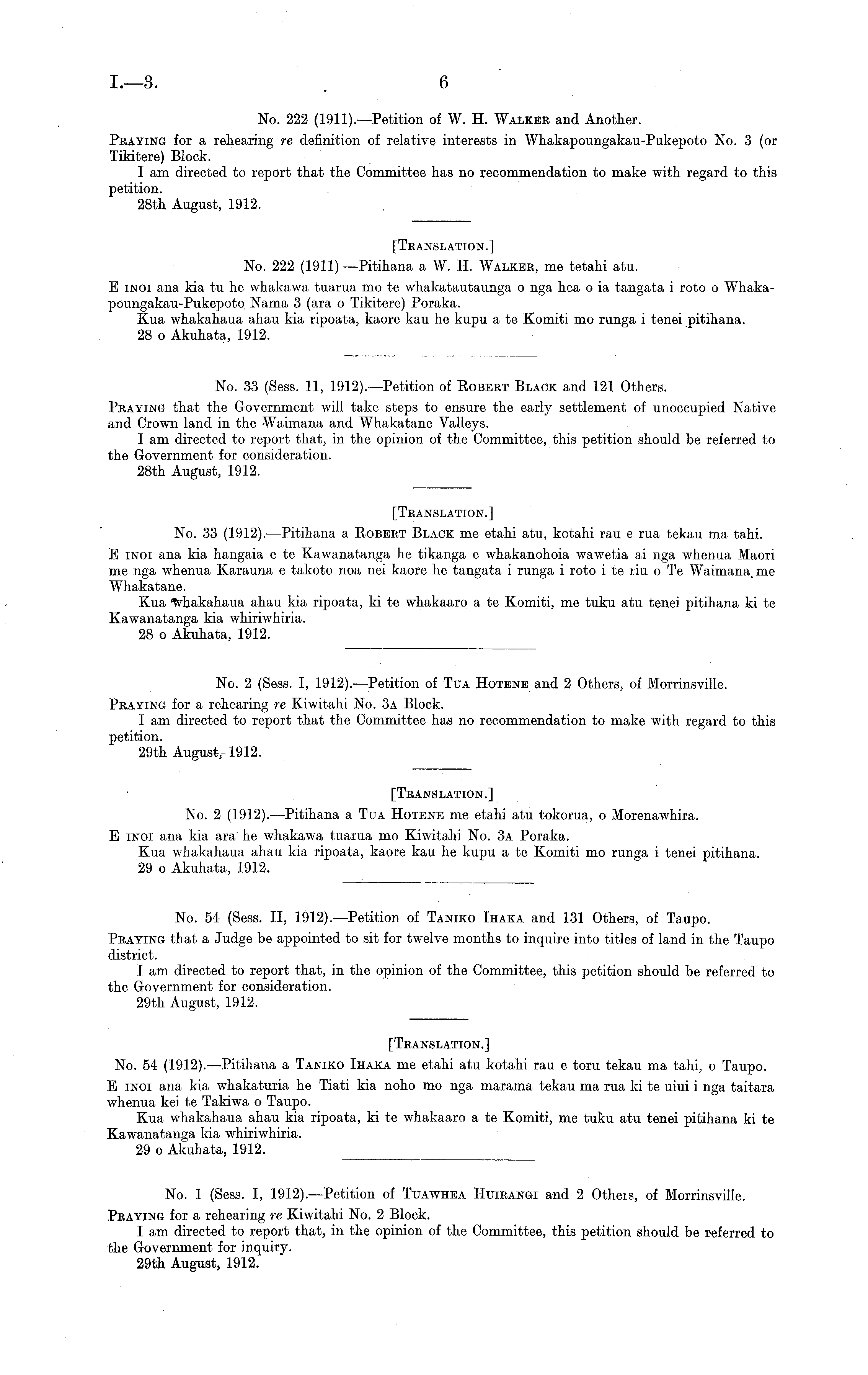 [Translation.] No. 222 (1911)—Pitihana a W. H. Walker, me tetahi atu. E iNOi ana kia tv he whakawa tuarua mo te whakatautaunga o nga hea o ia tangata i roto o Whaka-poungakau-Pukepoto Nama 3 (ara o Tikitere) Poraka. Kua whakahaua ahau kia ripoata, kaore kau he kupu a te Komiti mo runga i tenei pitihana. 28 o Akuhata, 1912.
