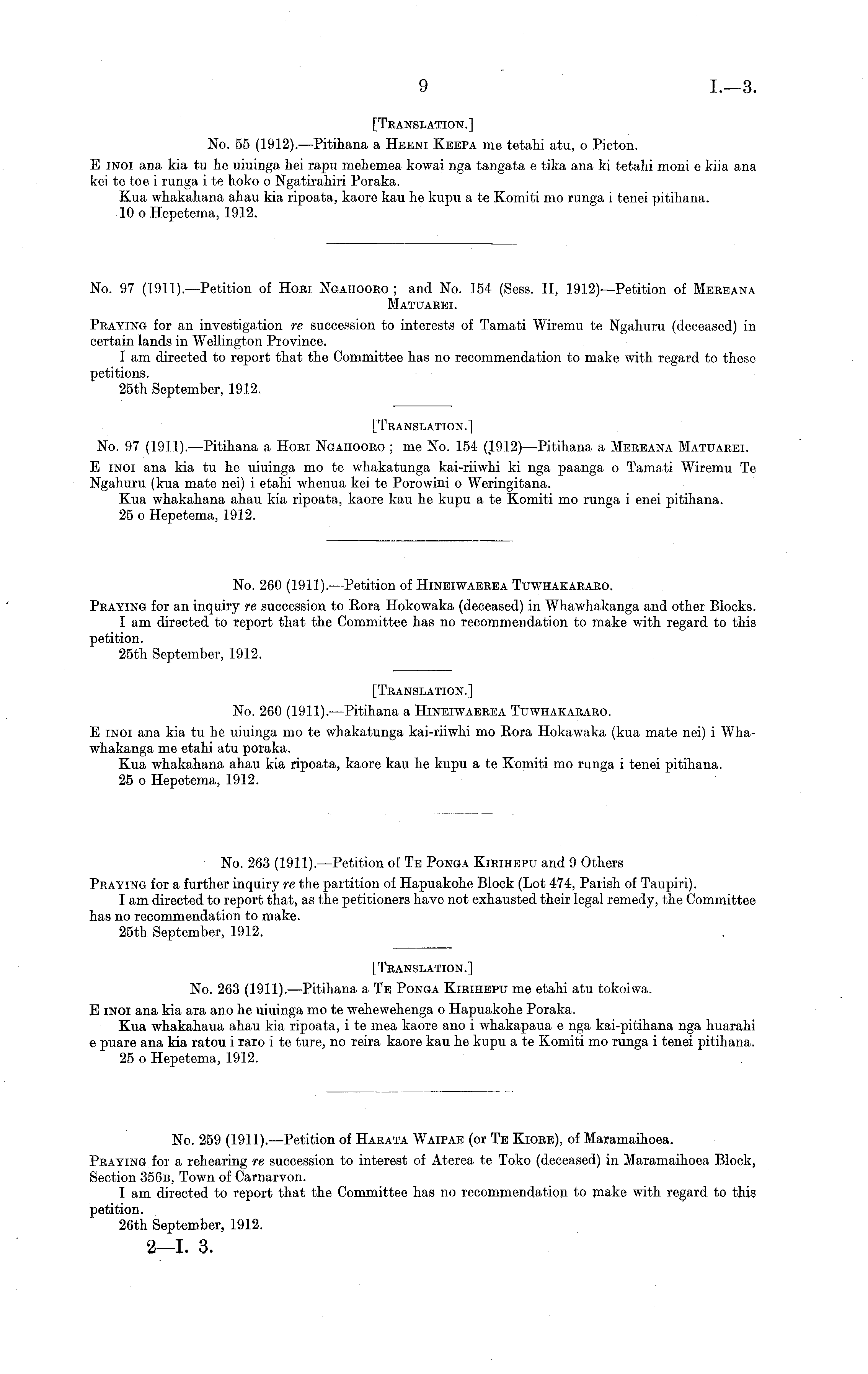 [Translation.] No. 260 (1911). —Pitihana a Hineiwaerea Tuwhakararo. E INOI ana kia tv he uiuinga mo te whakatunga kai-riiwhi mo Eora Hokawaka (kua mate nei) i Whawhakanga me etahi atu poraka. Kua whakahana ahau kia ripoata, kaore kau he kupu a te Komiti mo runga i tenei pitihana. 25 o Hepetema, 1912,