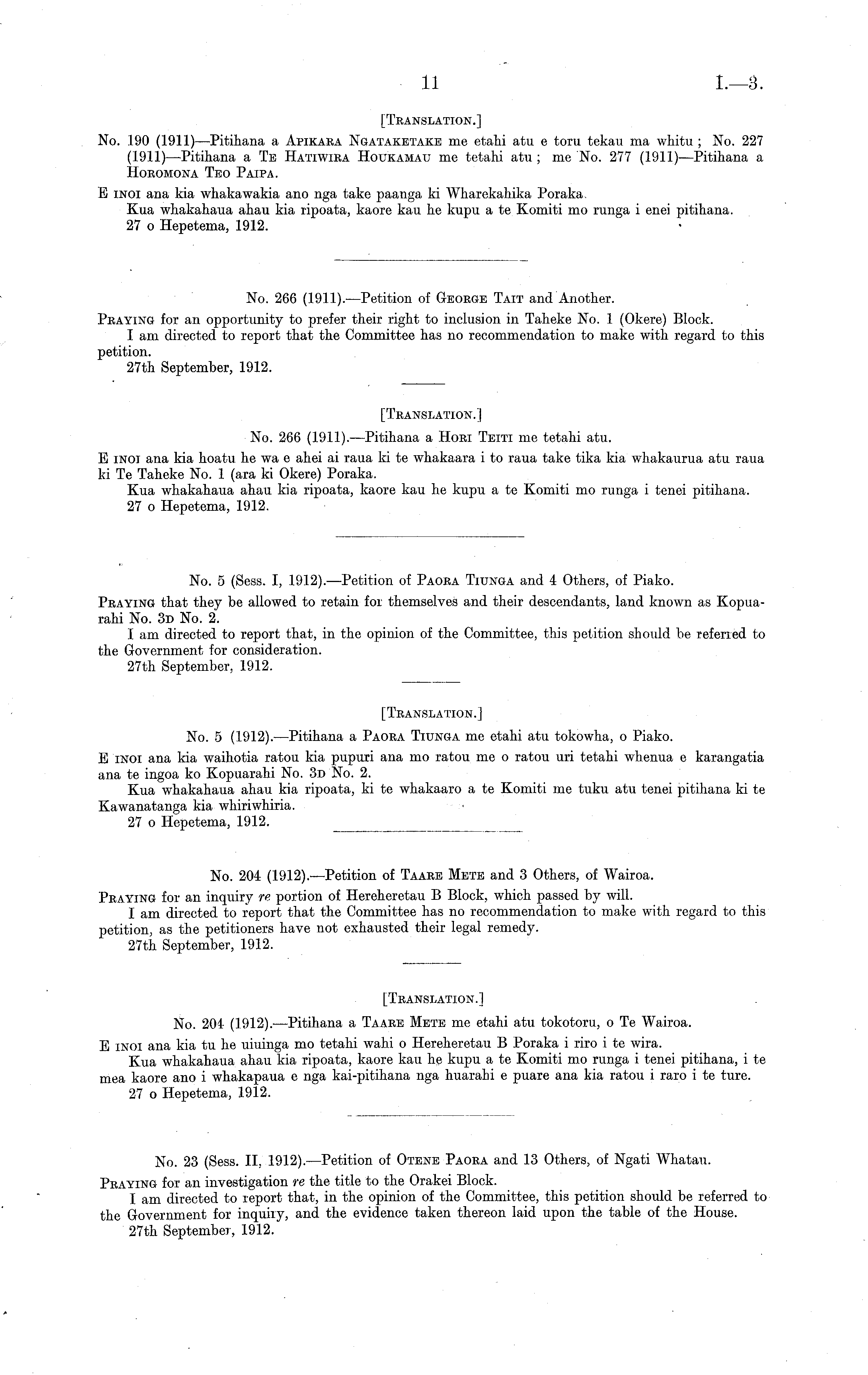 [Translation.] No. 190 (1911) —Pitihana a Apikaea Ngataketake me etahi atu c toru tekau ma whitu ; No. 227 (1911) —Pitihana a Te Hatiwiba Houkamau me tetahi atu ; me No. 277 (1911) —Pitihana a HOBOMONA TEO PaiPA. E INOI ana kia whakawakia ano nga take paanga ki Wharekahika Poraka. Kua whakahaua ahau kia ripoata, kaore kau he kupu a te Komiti mo runga i enei pitihana. 27 o Hepetema, 1912.