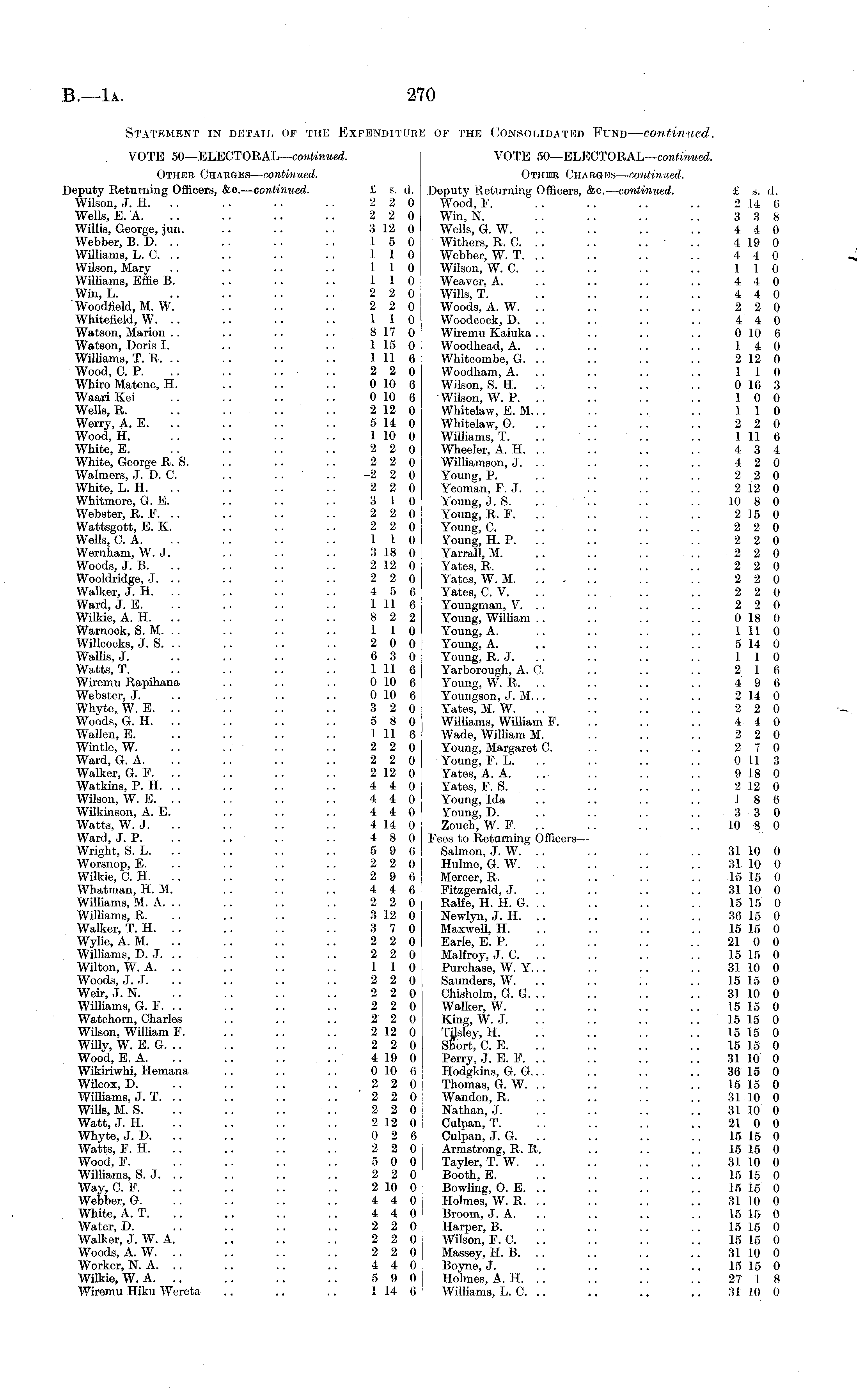 Statement in detail of the 'Expenditure of the Consolidated Fund— continued. VOTE 50—ELECTORAL— continued. VOTE 50—ELECTORAL— continued. Otheb Charges— continued. Othek Charges— continued. Deputy Returning Officers, &c.— continued. £ s. d. Deputy Returning Officers, &c.— continued. £ s. d. Wilson, J. H. .. .. .. .. 2 2 0 Wood, F. . . .. .. .. 2 14 0 Wells, E. A. .. .. .. .. 2 2 0 Win, N. .. .. .. .. 3 8 8 Willis, George, jun. .. .. .. 312 0 Wells, G. W. .. .. .. .. 4 4 0 Webber, B. D. .. .. .. .. 15 0 Withers, R. C. . . .. .. .. 419 0 Williams, L. C. .. .. . . .. 110 Webber, W. T. . . .. .. .. 4 4 0 Wilson, Mary .. .. .. .. 110 Wilson, W. C. .. .. .. .. 110 Williams, Effie B. .. .. .. 110 Weaver, A. .. .. .. .. 4 4 0 Win, L. .. .. .. .. 2 2 0 Wills, T. .. .. .. .. 4 4 0 'Woodfield, M. W. .. .. .. 2 2 0 Woods, A. W. .. .. .. .. 2 2 0 Whitefield, W. .. .. .. .. 110 Woodcock, D. .. .. .. .. 4 4 0 Watson, Marion .. .. .. .. 8 17 0 Wiremu Kaiuka .. . . . . .. 0 10 6 Watson, Doris I. .. .. .. IIS 0 Woodhead, A. .. .. . . .. 14 0 Williams, T. R. .. .. .. .. 1 11 6 Whitcombe, G. .. .. .. .. 2 12 0 Wood, C. P. .. .. .. .. 2 2 0 Woodham, A. .. .. .. .. 110 Whiro Matene, H. .. .. .. 010 6 Wilson, S. H. . . .. .. . . 016 3 Waari Kei .. .. .. .. 010 6 Wilson, W. P. .. .. .. .. 10 0 Wells, R. .. .. .. .. 212 0 Whitelaw, E. M... .. .. .. 110 Werry, A. E. .. .. .. .. 514 0 Whitelaw, G. .. .. .. .. 2 2 0 Wood, H. .. .. .. .. 110 0 Williams, T. .. .. .. .. 1116 White, E. .. .. .. .. 2 2 0 Wheeler, A. H. .. .. .. .. 4 3 4 White, George R. S. .. .. .. 2 2 0 Williamson, J. .. .. .. .. 4 2 0 Walmers, J. D. C. .. . . .. -2 2 0 Young, P. . . .. .. .. 2 2 0 White, L. H. .. .. .. .. 2 2 0 Yeoman, F. J. . . .. .. .. 212 0 Whitmore, G. E. .. .. .. 3 10 Young, J. S. .. '.. .. .. 10 8 0 Webster, R. P. .. .. .. .. 2 2 0 Young, R. F. .. .. .. 215 0 Wattsgott, E. K. .. . . .. 2 2 0 Young, C. .. .. .. .. 2 2 0 Wells, 0. A. .. .. .. .. 110 Young, H. P. .. .. .. . . 2 2 0 Wernham, W. J. . . .. .. 318 0 Yarrall, M. .. .. .. .. 2 2 0 Woods, J. B. . . . . .. .. 212 0 Yates, R. .. .. .. .. 2 2 0 Wooldridge, J. .. .. .. .. 2 2 0 Yates, W. M. ..... .. .. 220 Walker, J. H. .. .. .. .. 4 5 6 Yates, C. V. .. .. .. . . 2 2 0 Ward, J. E. .. .... .. 1116 Youngman, V. . . .. .. .. 220 Wilkie, A. H. .. .. .. .. 8 2 2 Young, William . . .. .. .. 018 0 Wamook, S. M. .. .. .. .. 110 Young, A. .. .. .. .. 1 11 0 Willcocks, J. S. .. .. .. .. 2 0 0 Young, A. .. .. .. .. 514 0 Wallis, J. .. .. .. .. 6 3 0 Young, R. J. .. .. .. .. 110 Watts, T. .. .. ... .. 1 11 6 Yarborough, A. C. .. .. .. 2 16 Wiremu Rapihana .. .. .. 010 6 Young, W. R. .. .. .. .. 4 9 6 Webster, J. .. .. .. . . 010 6 Youngson, J. M... .. .. .. 214 0 Whyte, W. E. .. .. .. .. 3 2 0 Yates, M. W. .. . . .. .. 2 2 0 Woods, G. H. .. .. .. .. 5 8 0 Williams, William F. .. .. .. 4 4 0 Wallen, E. .. .. .. .. 1116 Wade, William M. .. .. .. 2 2 0 Wintle, W. .. .. . . .. 2 2 0 Young, Margaret C. .. .. .. 2 7 0 Ward, G. A. .. .. .. .. 2 2 0 Young, F. L. .. .. .. .. 011 3 Walker, G. F. .. . . .. .. 212 0 Yates, A. A. . . .. .. . . 918 0 Watkins, P. H. .. .. .. .. 4 4 0 Yates, F. S. .. .. .. .. 212 0 Wilson, W. E. .. . . . . .. 4 4 0 Young, Ida .. .. .. .. 18 6 Wilkinson, A. E. .. .. .. 4 4 0! Young, D. .. .. .. .. 330 Watts, W. J. .. .. .. .. 414 0 Zouch, W. F. .. .. .. .. 10 8 0 Ward, J. P. . . .. .. .. 4 8 0 Fees to Returning OfficersWright, S. L. .. .. .. .. 596! Salmon, J. W. .. .. ... .. 31 10 0 Worsnop, E. .. .. .. .. 2 2 0 | Hulme, G. W. .. .. .. .. 31 10 0 Wilkie, C. H. .. .. .. .. 2 9 6 i Mercer, R. .. .. .. .. 15 15 0 Whatman, H. M. .. .. .. 44 6 ! Fitzgerald, J. .. .. .. .. 31 10 0 Williams, M. A. . . .. .. .. 2 2 0; Ralfe, H. H. G. .. .. .. .. 15 15 0 Williams, R. .. .. . . .. 312 0 Newlyn, J. H. .. .. .. .. 36 15 0 Walker, T. H. .. .. .. . . 3 7 0 Maxwell, H. .. .. .. . . 15 15 0 Wylie, A. M. .. .. .. .. 2 2 0! Earle, E. P. .. .. .. .. 21 0 0 Williams, D. J. .. .. .. .. 2 2 0 Malfroy, J. C. .. .. .. .. 15 15 0 Wilton, W. A. .. .. .. .. 110 Purchase, W. V.. . .. .. .. 3110 0 Woods, J. J. .. .. .. 2 2 0 Saunders, W. .. . . .. .. 15 15 0 Weir, J. N. .. .. .. .. 2 2 0 j Chisholm, G. G. .. .. .. .. 31 10 0 Williams, G. F. . . .. .. .. 2 2 0 Walker, W. .. . . .. .. 15 15 0 Watchorn, Charles .. .. .. 2 2 0 King, W. J. . . .. .. .. 15 15 0 Wilson, William F. .. .. .. 212 0 Tilsley, H. .. .. .. .. 15 15 0 Willy, W. E. G. .. .. .. .. 2 2 0: Short, C. E. .. .. .. .. 15 15 0 Wood, E. A. .. .. .. .. 419 0 Perry, J. E. F. .. .. .. .. 31 10 0 Wikiriwhi, Hemana .. .. . . 010 6 Hodgkins, G. G... .. .. .. 36 15 0 Wilcox, D. .. .. .. .. 2 2 0 Thomas, G. W. .. .. .. .. 15 15 0 Williams, J. T. .. .. .. . . '220 Wanden, R. .. .. .. .. 31 10 0 Wills, M. S. .. .. .. .. 2 2 0: Nathan, J. . . .. .. .. 31 10 0 Watt, J. H. .. .. .. .. 212 0 I Culpan, T. .. .. .. .. 21 0 0 Whyte, J. D. .. .. .. .. 0 2 6 j Culpan, J. G. .. .. .. .. 15 15 0 Watts, F. H. .. .. .. .. 2 2 0 i Armstrong, R. R. .. .. .. 15 15 0 Wood, F. .. .. .. .. 5 0 0' Tayler, T. W. .. .. .. .. 31 10 0 Williams, S. J. .. .. .. .. 2 2 0; Booth, E. .. .. .. .. 15 15 0 Way, C. F. .. .. .. .. 210 0 j Bowling, O. E. .. .. .. .. 15 15 0 Webber, G. .. .. .. .. 4 4 0: Holmes, W. R. .. .. .. .. 31 10 0 White, A. T. .. .. .. .. 4 4 0! Broom, J. A. .. .. .. 15150 Water, D. .. .. .. .. 2 2 0 Harper, B. .. .. .. . . 15 15 0 Walker, J. W. A. .. .. .. 2 2 0 Wilson, F. C. .. .. .. .. 15 15 0 Woods, A. W. .. .. .. .. 2 2 0 ; Massey, H. B. .. .. .. .. 31 10 0 Worker, N. A. .. .. .. .. 4 4 0 I Boyne, J. .. .. .. .. 15 15 0 Wilkie, W. A. .. .. .. .. 5 9 0 Holmes, A. H. . . .. .. .. 27 1 8 Wiremu Hiku Wereta .. .. .. 1 14 6 Williams, L. C. .. .. .. .. 31 JO 0