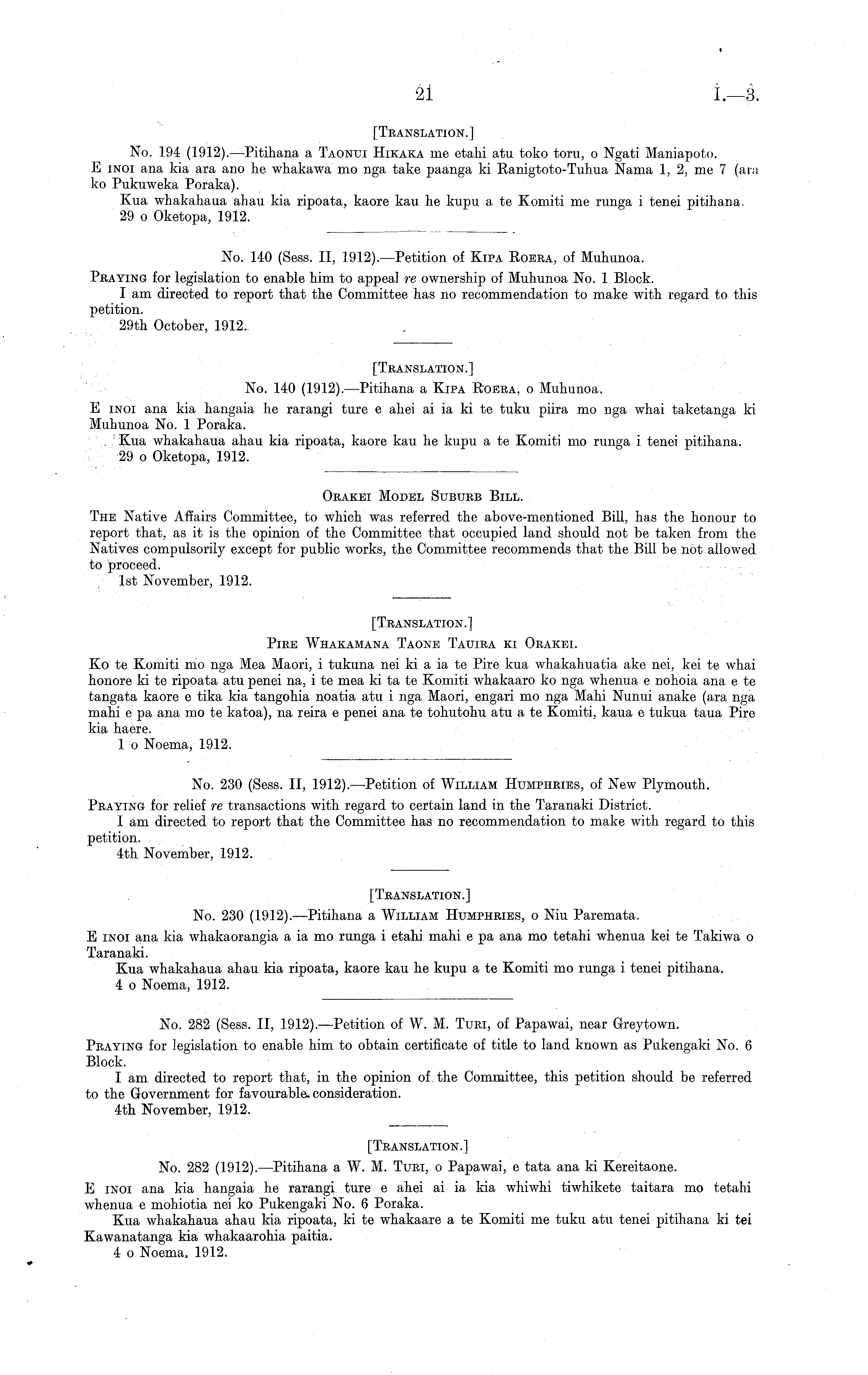 [Translation.] No. 230 (1912). —Pitihana a William Humphries, o Niu Paremata. E INOI ana kia whakaorangia a ia mo runga i etahi mahi c pa ana mo tetahi whenua kei te Takiwa o Taranaki. Kua whakahaua ahau kia ripoata, kaore kau he kupu a te Komiti mo runga i tenei pitihana. 4 o Noema, 1912.