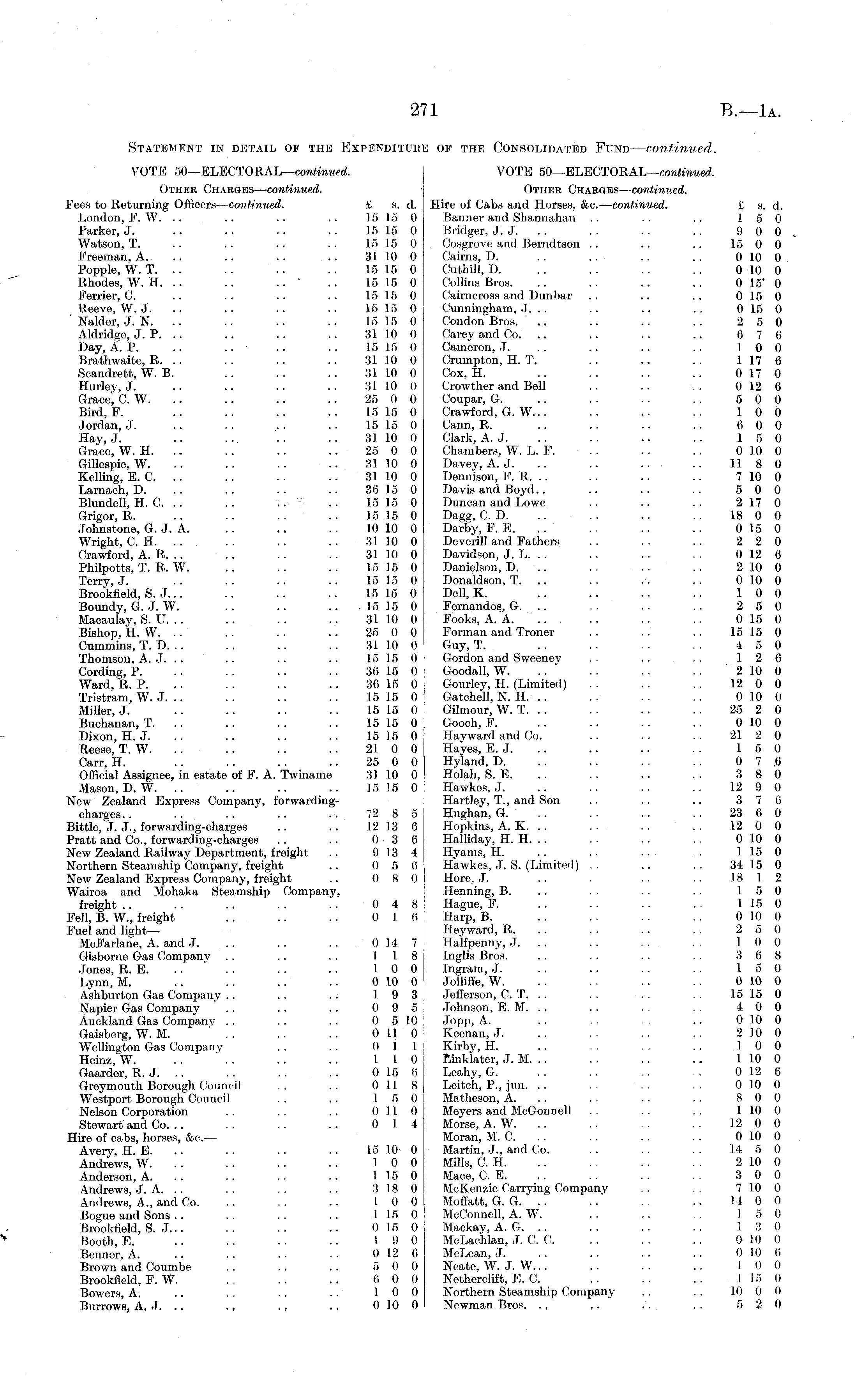 Statement in detail of the Expkndituhe of the Consolidated Fund— continued. VOTE 50—ELECTORAL— continued. VOTE 50—ELECTORAL— continued. Other Charges— continued. Other Charges— continued. Fees to Returning Officers— continued. £ s. d. Hire of Cabs and Horses, &c.— continued. £ s. d. London, F. W. .. .. .. .. 15 15 0 Banner and Shannahan .. . . . . 15 0 Parker, J. .. .. .. .. 15 13 0 Bridger, J. J. .. .. .. .. 9 0 0 Watson, T. .. .. .. .. 15 15 0 Cosgrove and Berndtson .. .. . . 15 0 0 Freeman, A. .. .. .. .. 31 10 0 Cairns, I). .. .. .. .. 0 10 0 Popple, W. T. .. .. .. .. 15 15 0 Cuthill, D. .. .. .. .. 0 10 0 Rhodes, W. H. .. .. .. ' .. 15 15 0 Collins Bros. .. .. .. .. 0 15' 0 Ferrier, C. .. .. .. .. 15 15 0 Cairneross and Dunbar .. .. .. 0 15 0 Reeve, W. J. .. .. .. .. 15 15 0 Cunningham, J. .. .. .. .. 015 0 ' Nalder, J. N. .. .. .. .. 15 15 0 Condon Bros. .. .. .. .. 2 5 0 Aldridge, J. P. .. .. .. . . 31 10 0 Carey and Co. .. .. .. .. 6 7 6 Day, A. P. .. .. ■ .. .. 15 15 0 Cameron, J. . . .. . . .. 10 0 Brathwaite, R. .. .. .. .. 31 10 0 Crumpton, H. T. .. .. .. 117 6 Scandrett, W. B. .. . . . . 31 10 0 Cox, H. .. .. .. .. 017 0 Hurley, J. .. .. .. .. 31 10 0 Crowther and Bell .. .. ... 0 12 0 Grace, C. W. .. .. .. .. 25 0 0 Coupar, G. .. .. .. .. 5 0 0 Bird, F. .. .. .. .. 15 15 0 Crawford, G. W... .. .. .. 10 0 Jordan, J. .. .. .. .. 15 15 0 Cann,R. .. .. .. .. 6 0 0 Hay, J. .. .. .. .. 31 10 0 Clark, A. J. .. .. .. .. 15 0 Grace, W. H. .. .. . . .. 25 0 0 Chambers, W. L. F. . . .. .. 010 0 Gillespie, W. .. .. .. .. 31 10 0 Davey, A. J. .. .. .. .. 11 8 0 Kelling, E. C. .. .. .. .. 31 10 0 Dennison, F. R. .. .. .. .. 710 0 Larnach, D. .. .. .. .. 36 15 0 Davis and Boyd.. .. .. .. 5 0 0 Blundell, H. C. .. .. .. ; .. 15 15 0 Duncan and Lowe . . .. .. 217 0 Grigor, R. .. .. .. .. 15 15 0 Dagg, (', D. .. .. .. .. 18 0 0 Johnstone, G. J. A. .. .. .. 10 10 0 Darby, F. E. .. .. .. .. 015 0 Wright, C. H. .. .. .. . . 31 10 0 Doverill and Fathers .. .. .. 2 2 0 Crawford, A. R. .. .. .. .. 31 10 0 Davidson, J. L. . . .. .. . . 012 6 Philpotts, T. R. W. .. .. . . 1.5 15 0 Danielson, D. .. .. .. .. 210 0 Terry, J. .. .. .. .. 15 15 0 Donaldson, T. .. .. .. .. 010 0 Brookfield, 8. J... .. .. .. 15 15 0 Dell, K. .. .. .. .. 10 0 Boundy, G. J. W. .. .. .. 15 15 0 Fernandos, G. . . . . . . . . 2 5 0 Macaulay, S. U. .. .. .. .. 31 10 0 Fooks, A. A. .. .. . . .. 015 0 Bishop, H. W. .. .. .. .. 25 0 0 Forman and Troner .. .. .. 15 15 0 Cummins, T. D. .. .. .. .. 31 10 0 Guy, T. .. .. . . .. 4 5 0 Thomson, A. J. .. .. .. .. 15 15 0 Gordon and Sweenev . . .. . . 12 6 Cording, P. .. .. .. .. 36 15 0 Goodall, W. .. .. . . .. 210 0 Ward, R. P. .. .. .. .. 36 15 0 Gourley, H. (Limited) .. .. .. 12 0 0 Tristram, W. J. .. . . .. . . 15 15 0 Gatchell, N. H. . . .. . . . . 0 10 0 Miller, J. .. .. .. .. 15 15 0 Gilmour, W. T. .. .. .. .. 25 2 0 Buchanan, T. .. .. .. . . 15 15 0 Gooch, F. .. .. . . .. 010 0 Dixon, H. J. .. .. .. . . 15 15 0 Hayward and Co. .. .. . . 21 2 0 Reese, T. W. .. .. .. .. 21 0 0 Hayes, E. J. .. .. .. .. 15 0 Carr, H. .. .. .. .. 25 0 0 Hyland, D. .. .. . . . . 0 7 .6 Official Assignee, in estate of F. A. Twiname 31 10 0 Holah, S. E. .. .. .. .. 3 8 0 Mason, D. W. .. .. .. .. 15 15 0 Hawkcs, J. .. .. .. .. 1290 New Zealand Express Company, forwarding- Hartley, T., and Son .. . . .. 3 7 6 charges.. .. .. .. .. 72 8 5 Hughan, G. .. .. .. .. 23 6 0 Bittle, J. J., forwarding-charges .. .. 12 13 6 Hopkins, A. K. .. .. .. .. 1200 Pratt and Co., forwarding-charges . . .. 0 3 6 Halliday, H. H. .. . . .. . . 0 10 0 New Zealand Railway Department, freight .. 913 4 Hyams, H. .. .. .. .. 115 0 Northern Steamship Company, freight .. 0 5 6 Hawkes, J. S. (Limited) .. .. .. 34 15 0 New Zealand Express Company, freight .. 0 8 0 ! Hore, J. . . . . . .. 18 12 Wairoa and Mohaka Steamship Company, Henning, B. .. . . . . . . 15 0 freight .. .. .. . . .. 0 4 8; Hague, F. .. .. .. . . 115 0 Fell, B. W., freight .. .. .. 0 16 Harp, B. .. .. .. .. 0 10 0 Fuel and light— Heyward, R. .. .. . . . . 2 5 0 McFarlane, A. and J. .. .. .. 014 7 Halfpenny, J. .. .. .. .. 10 0 Gisborne Gas Company . . .. • . 118! Inglis Bros. .. . . . . . . 368 Jones, R. E. .. .. .. .. 10 0 Ingram, J. .. .. . . . . 15 0 Lynn, M. .. .. .. .. 010 0 Jolliffe, W. .. .. .. .. 010 0 Ashburton Gas Company .. .. •. 19 3 Jefferson, C. T. .. .. .. . . 15 15 0 Napier Gas Company .. .. . . 0 9 5 Johnson, E. M. .. . . . . .. 4 0 0 Auckland Gas Company .. . . .. 0 510 J°PP. A. .. . . . . .. 010 0 Gaisberg, W. M. . . .. .. 011 0 I Keenan, J. .. . . . . . . 210 0 Wellington Gas Company .. • • 0 11 Kirby, H. .. . . .. . . 10 0 Heinz, W. .. .. .. .. i I 0 fctnklater, J. M. .. . . .. .. 110 0 Gaarder, R. J. .. .. .. .. 015 6 Leahy, G. .. .. .. .. 012 6 Greymouth Borough Council .. .. 0 11 8 Leitch, P., jun. .. .. .. .. 0 10 0 Westport Borough Council .. .. 15 0 Matheson, A. .. .. .. 8 0 0 Nelson Corporation .. . . .. 0 110 Meyers and McGonnell . . . . .. 1 10 0 Stewart and Co. .. .. .. .. 01 4 1 Morse, A. W. .. .. .. .. 12 0 0 Hire of cabs, horses, &c.— Moran, M. C. .. . . • ■ . • 0 10 0 Avery, H. E. .. .. .. .. 15 10 0 Martin, J., and Co. .. .. .. 14 5 0 Andrews, W 10 0 Mills, C. H .. . . 2 10 0 Anderson, A. .. .. .. I 15 0 Mace, C. E. .. . . .. . . 3 0 0 Andrews, J. A. .. .. .. .. 318 0 McKenzie Carrying Company . . .. 710 0 Andrews, A., and Co. .. .. . . 10 0 Moffatt, G. G. . . .. . . .. 14 0 0 Bogue and Sons .. .. . . .. 115 0 McConnell, A. W. .. .. . . 15 0 Brookfield, S. J .. 0 15 0 Mackay, A. G 13 0 Booth, E. .. . . . . .. 10 0; McLachlan, J. C. C. .. . . .. 0 10 0 Benner, A. .. .. .. .. 0 12 6 McLean, J. .. .. .. .. 0 10 (i Brown and Coumbe .. .. .. 5 0 0 Neate, W. J. W.. . . . .. .. 10 0 Brookfield, F. W. . . .. . . 6 0 0 | Netherclift, E.G. .. .. . . 115 0 Bowers, A. .. .. .. .. 10 0 Northern Steamship Company .. .. 10 0 0 Burrows, A, J. .. ~ ~ ~ 010 0 Newman Bros. .. ~ ' .. ~ 52 0