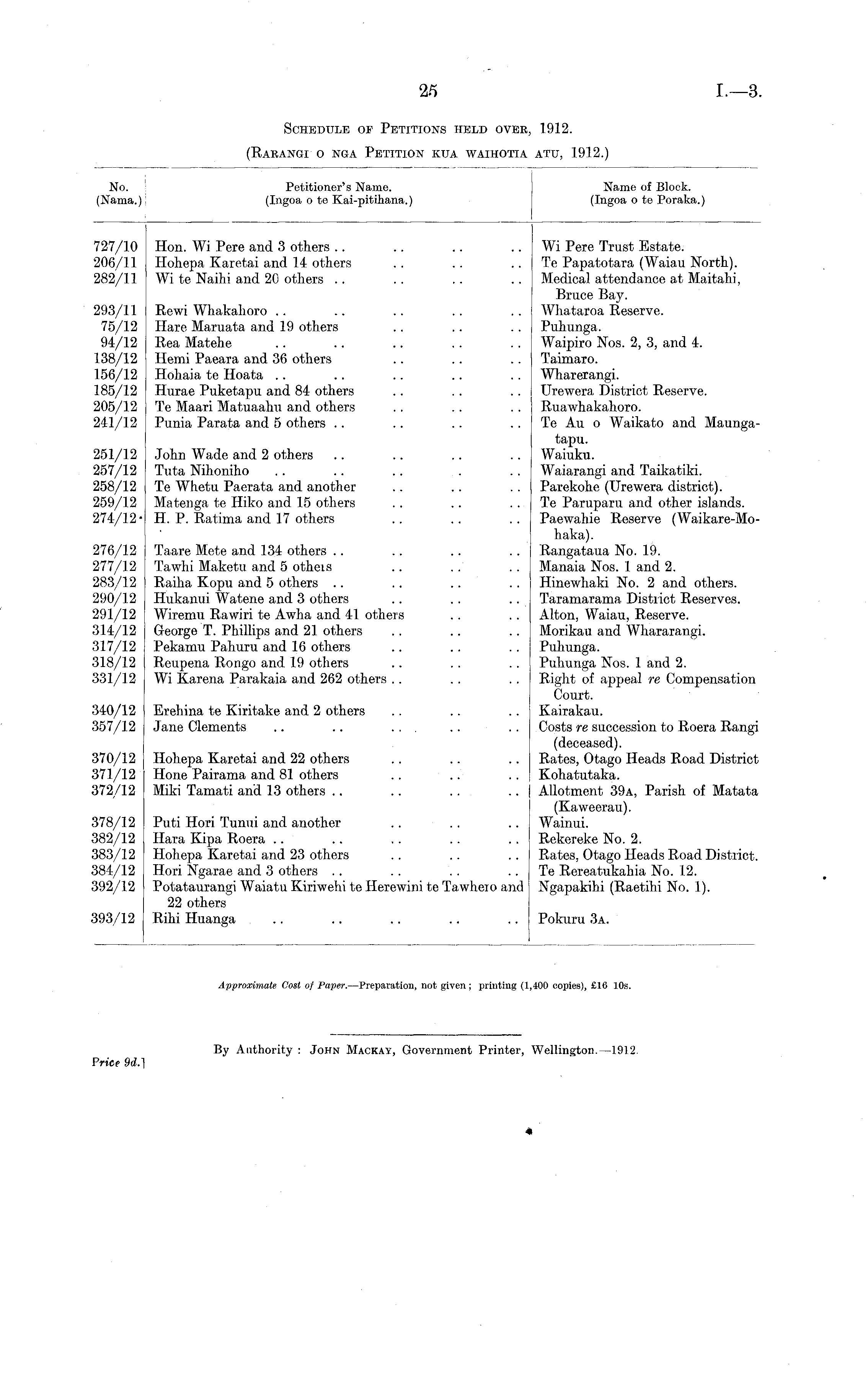Schedule of Petitions held over, 1912. (Rarangi o nga Petition kua waihotia atu, 1912.)