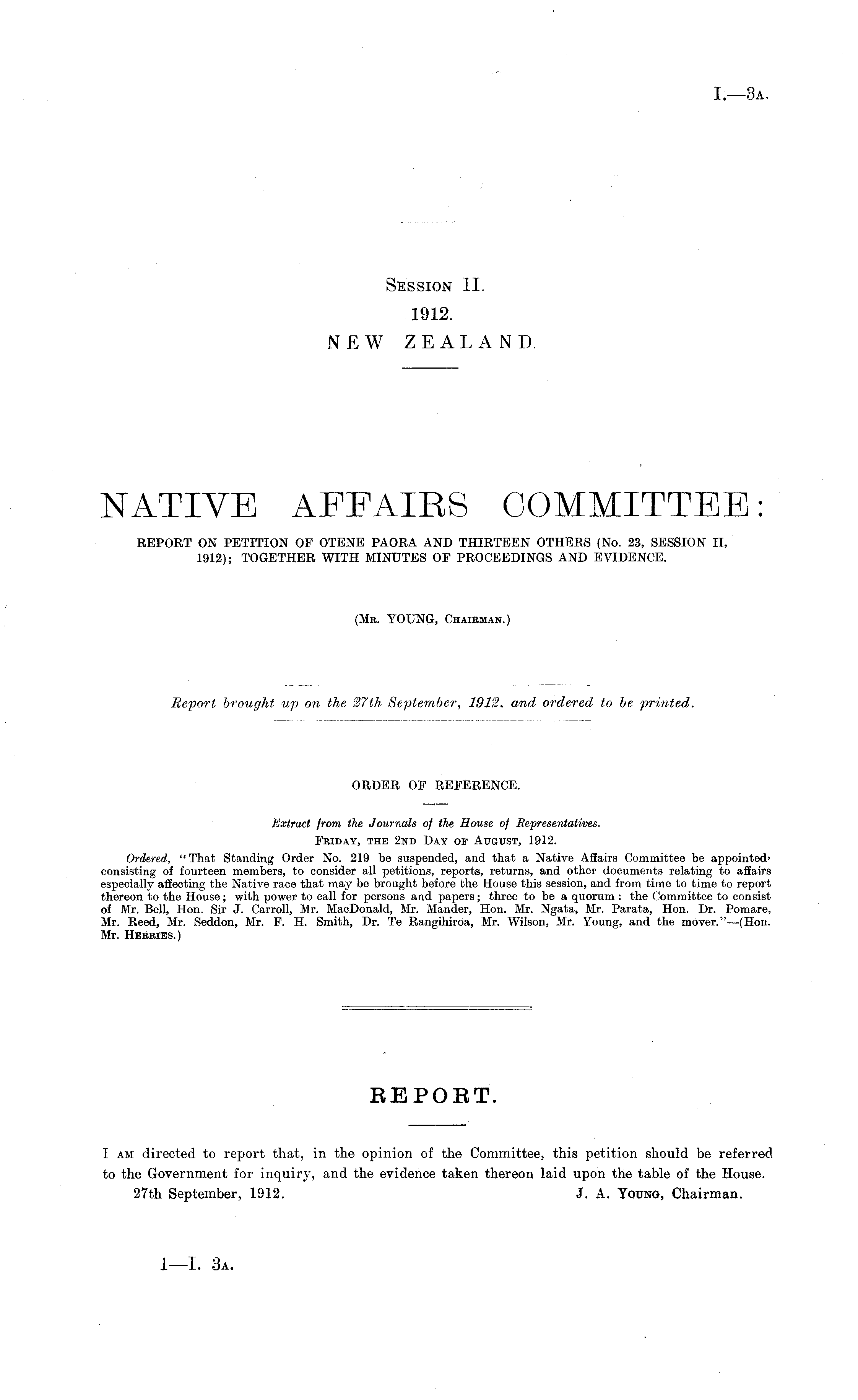NATIVE AFFAIRS COMMITTEE: REPORT ON PETITION OF OTENE PAORA AND THIRTEEN OTHERS (No. 23, SESSION II, 1912); TOGETHER WITH MINUTES OF PROCEEDINGS AND EVIDENCE. (Mr. YOUNG, Chairman.)