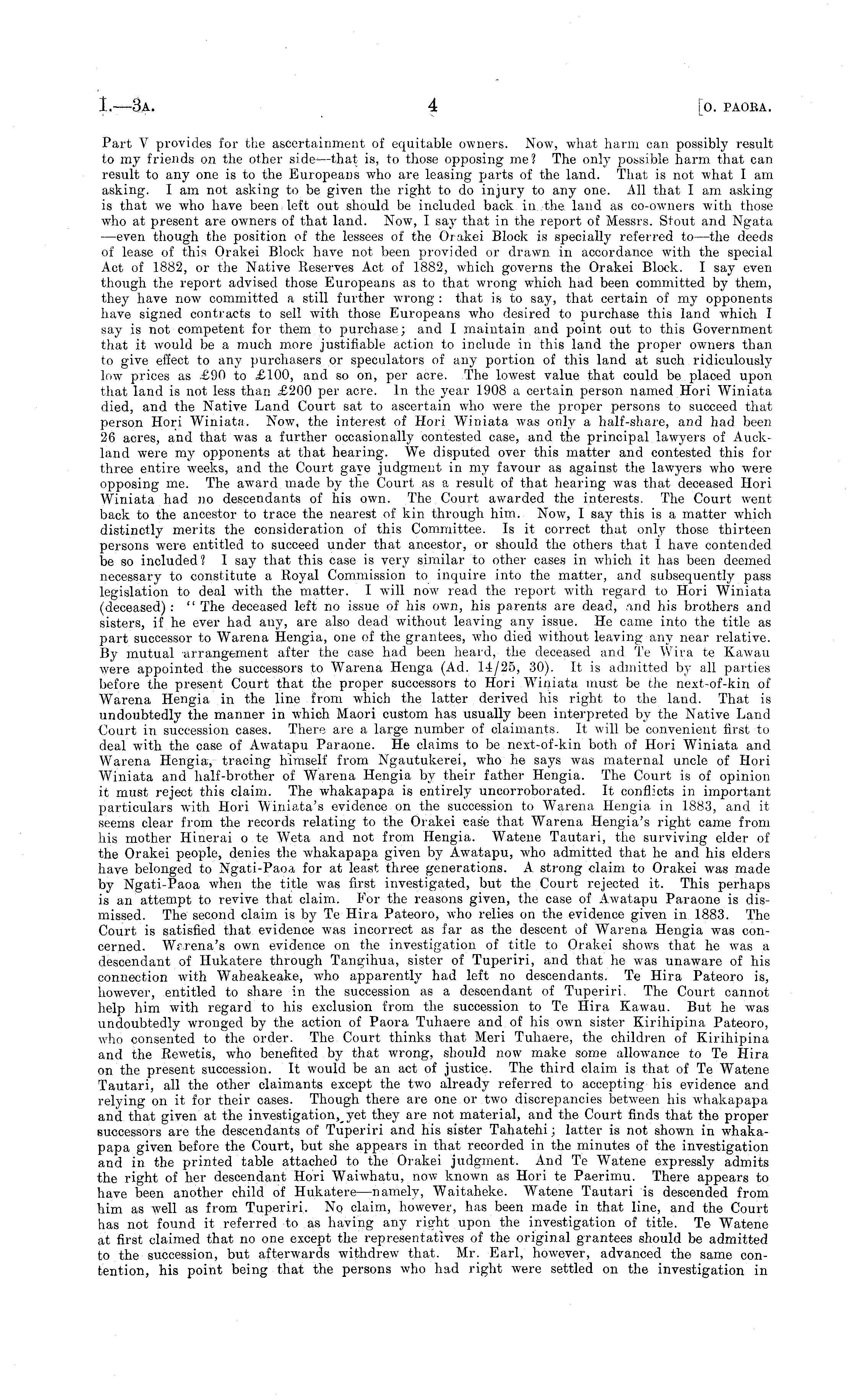 Part V provides for the ascertainment of equitable owners. Now, what harm can possibly result to my friends on the other side —that is, to those opposing me? The only possible harm that can result to any one is to the Europeans who are leasing parts of the land. That is not what I am asking. lam not asking to be given the right to do injury to any one. All that I am asking is that we who have been left out should be included back in the laud as co-owners with those who at present are owners of that land. Now, I say that in the report of Messrs. Stout and Ngata —even though the position of the lessees of the Orakei Block is specially referred to —the deeds of lease of this Orakei Block have not been provided or drawn in accordance with the special Act of 1882, or the Native Reserves Act of 1882, which governs the Orakei Block. I say even though the report advised those Europeans as to that wrong which had been committed by them, they have now committed a still further w 7 rong : that is to say, that certain of my opponents have signed contracts to sell with those Europeans who desired to purchase this land which 1 say is not competent for them to purchase; and I maintain and point out to this Government that it would be a much more justifiable action to include in this land the proper owners than to give effect to any purchasers or speculators of any portion of this land at such ridiculously low prices as £90 to £100, and so on, per acre. The lowest value that could be placed upon that land is not less than £200 per acre. In the year 1908 a certain person named Hori Winiata died, and the Native Land Court sat to ascertain who were the proper persons to succeed that person Hori Winiata. Now, the interest of Hori Winiata was only a half-share, and had been 26 acres, and that was a further occasionally contested case, and the principal lawyers of Auckland were my opponents at that hearing. We disputed over this matter and contested this for three entire weeks, and the Court gave judgment in my favour as against the lawyers who were opposing me. The award made by the Court as a result of that hearing was that deceased Hori Winiata had no descendants of his own. The Court awarded the interests. The Court went back to the ancestor to trace the nearest of kin through him. Now, I say this is a matter which distinctly merits the consideration of this Committee. Is it correct that only those thirteen persons were entitled to succeed under that ancestor, or should the others that I have contended be so included? I say that this case is very similar to other eases in which it has been deemed necessary to constitute a Royal Commission to inquire into the matter, and subsequently pass legislation to deal with the matter. I will now read the report with regard to Hori Winiata (deceased) : " The deceased left no issue of his own, his parents are dead, and his brothers and sisters, if he ever had any, are also dead without leaving any issue. He came into the title as part successor to Warena Hengia, one of the grantees, who died without leaving any near relative. By mutual arrangement after the case had been heard, the deceased and Te Wira te Kawau were appointed the successors to Warena Henga (Ad. 14/25, 30). It is admitted by all parties before the present Court that the proper successors to Hori Winiata must be the next-of-kin of Warena Hengia in the line from which the latter derived his right to the land. That is undoubtedly the manner in which Maori custom has usually been interpreted by the Native Land Court in succession cases. There are a large number of claimants. It will be convenient first to deal with the case of Awatapu Paraone. He claims to be next-of-kin both of Hori Winiata and Warena Hengia, tracing himself from Ngautukerei, who he says was maternal uncle of Hori Winiata and half-brother of Warena Hengia by their father Hengia. The Court is of opinion it must reject this claim. The whakapapa is entirely uncorroborated. It conflicts in important particulars with Hori Winiata's evidence on the succession to Warena Hengia in 1883, and it seems clear from the records relating to the Orakei case that Warena Hengia's right came from his mother Hinerai o te Weta and not from Hengia. Watene Tautari, the surviving elder of the Orakei people, denies the whakapapa given by Awatapu, who admitted that he and his elders have belonged to Ngati-Paoa for at least three generations. A strong claim to Orakei was made by Ngati-Paoa when the title was first investigated, but the Court rejected it. This perhaps is an attempt to revive that claim. For the reasons given, the case of Awatapu Paraone is dismissed. The second claim is by Te Hira Pateoro, who relies on the evidence given in 1883. The Court is satisfied that evidence was incorrect as far as the descent of Warena Hengia was concerned. Wrrena's own evidence on the investigation of title to Orakei shows that he was a descendant of Hukatere through Tangihua, sister of Tuperiri, and that he w 7 as unaware of his connection with Waheakeake, who apparently had left no descendants. Te Hira Pateoro is, however, entitled to share in the succession as a descendant of Tuperiri. The Court cannot help him with regard to his exclusion from the succession to Te Hira Kawau. But he was undoubtedly wronged by the action of Paora Tuhaere and of his own sister Kirihipina Pateoro, who consented to the order. The Court thinks that Meri Tuhaere, the children of Kirihipina and the Rewetis, who benefited by that wrong, should now make some allowance to Te Hira on the present succession. It would be an act of justice. The third claim is that of Te Watene Tautari, all the other claimants except the two already referred to accepting his evidence and relying on it for their cases. Though there are one or two discrepancies between his whakapapa and that given at the investigation^yet they are not material, and the Court finds that the proper successors are the descendant
