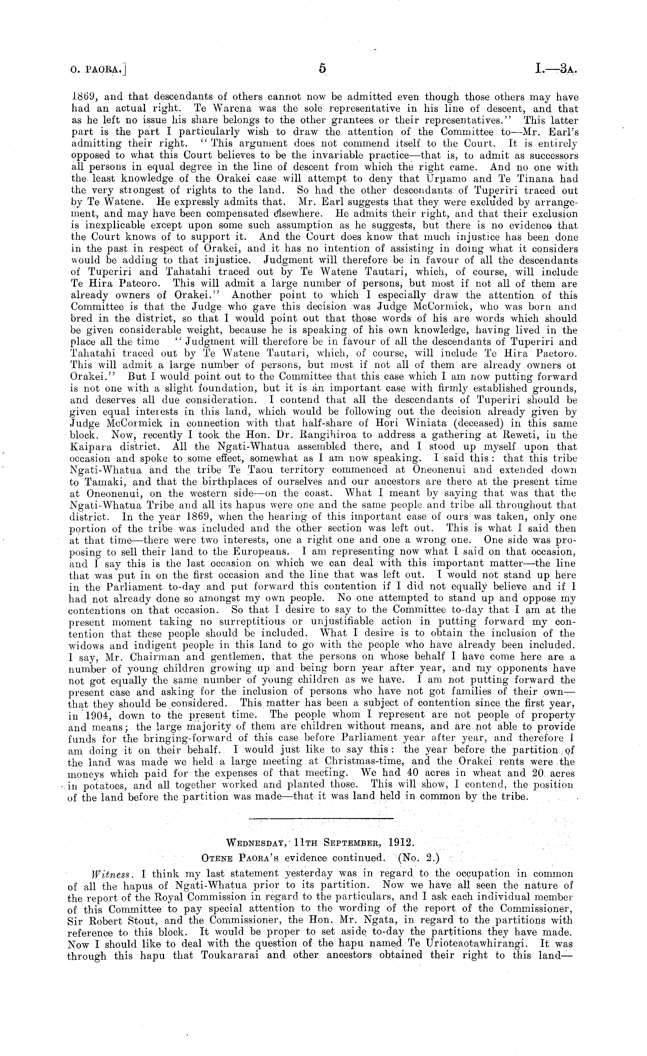 Wednesday, 11th September, 1912. Otene Paora's evidence continued. (No. 2.) Witness. I think my last statement yesterday was in regard to the occupation in common of all the hapus of Ngati-Whatua prior to its partition. Now we have all seen the nature of the report of the Royal Commission in regard to the particulars, and I ask each individual member of this Committee to pay special attention to the wording of the report of the Commissioner, Sir Robert Stout, and the Commissioner, the Hon. Mr. Ngata, in regard to the partitions with reference to this block. It would be proper to set aside to-day the partitions they have made. Now I should like to deal with the question of the hapu named Te Urioteaotawhirangi. It was through this hapu that Toukararai and other ancestors obtained their right to this land —