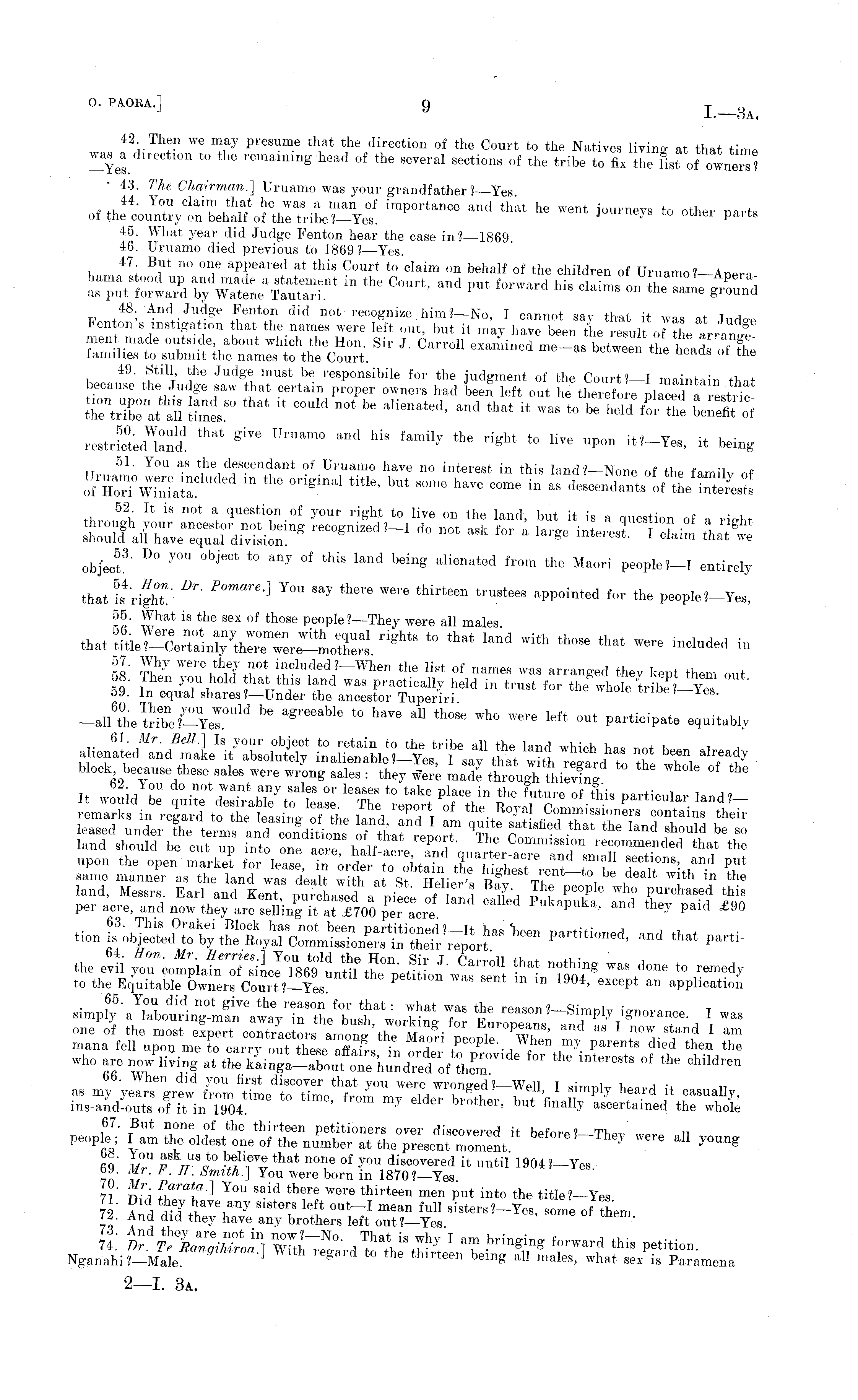 42 Then we may presume that the direction of the Court to the Natives living at that time direction to the remaining head of the several sections of the tribe to fix the lit of owne"l 43. The Chairman.] Uruamo was your grandfather ?—Yes 44. You claim that he was a man of importance and that he went journeys to other parts ot the on behalf of the tribe?—Yes. } " mei P arts 45. What year did Judge Fenton hear the case in? —1869 46. Uruamo died previous to 1869? —Yes. 47 But no one appeared at this Court to claim on behalf of the children of Uruamo?—Anera "wa?d "*" "* ** ***"* * **" «*« &S -n^tti^o^ ment made outside about which the Hon. Sir J. Carroll examined in"a s ttween the £ I families to submit the names to the Court. & 01 tlle 49. Still the Judge must be responsible for the judgment of the Court?—l maintain that because the Judge saw that certain proper owners had been left out he therefore placed aresSc at tli limes" " "* * » d ** ""« * * heM £the benS^ restrmLuand 1 *** UrUam ° fa " nl} " the ri * ht to lh ' e u P on **«-*», it being 51. You as the descendant of Uruamo have no interest in this land?—None of the familv of of U(kd m ° nglnal bUt S ° lne haVe C ° me in aS d — d -ts oi'the Lter'est! rtJi Jt ' S not » nation of your right to live on the land, but it is a question of a rmht through your ancestor not being recognized ?-I do not ask for a large interest I daim that wl should all have equal division. h UL 1 cldlm tnat e object"' D ° y ° U ° bJeCt t0 anJ ° f tMs land beiDg alienated from the people?-I entirely that SrifhT' 7> ' Y ° U Say We, ' e thil " teen trUBteeS a PP° inted fw the people ?-Yes, 55. What is the sex of those people ?—They were all males t0 land Wlth th ° Se *»* ™ d - 57. Why were they not included?—When the list of names was arranged thev kent then, „„♦ 58. Then yon hold that this land was practically held in trust for the" who /tribe J Ye, 09. In equal shares ?—Under the ancestor Tuperiri tribe f—Yes. ~JVtZr Y :r W b<J agreeaWe t0 haV6 all th ° Se Wh ° e l6ft -t participate equitablv alien^td^L' V aLS? 5&S&S*?* * the £^£ block because these sales were wrong sales : they were made through thieving upon the open marke? JVaZ Z'l 5* same manner as the land was dealt with at St Helier's Bu Twl . i, I !? , he pa —- d '- ** p^--the evti tV '' Boihin * ™ done to remedy to the Equitable Owners Court J-Z * **"" *" *** m*" 19 ° 4 ' "*** « application worfing Z I was one of the most expert cont/actors MaTri my p'rentT ' T mana fell upon me to carrv nut th P «o pffo/tc, : j pcojjie vvnen my parents died then the *< ». no/,,;,., A'Sr"*' '"'' "" """<*'" " "" *"<"» ms-and-outs of it in 1904. ' brother, but finally ascertained the whole 67. But none of the thirteen petitioners over discovered it before? TW ™ n people; lam the oldest one of the number at the present moment b6f ° re? - The 3 were all young 69 £ U f V B e° Xl TZ that n ° ne 0f you it until 1904?-Yes b9. Mr. F. H. Smith.] You were born in 1870?—Yes 70. Mr ftiroto.] You said there were thirteen men put into the title?—Yes 79 ? A SlSterS left ""t- 1 mean Ml sisters?-Yes, some of them <2. And did they have any brothers left out?—Yes 74.' iS t T hj l T T bHnging f ° nVard thlS N g anahi?-Male. ] ' egaid t0 the thlrteen all '"« les - what sex is Paramena