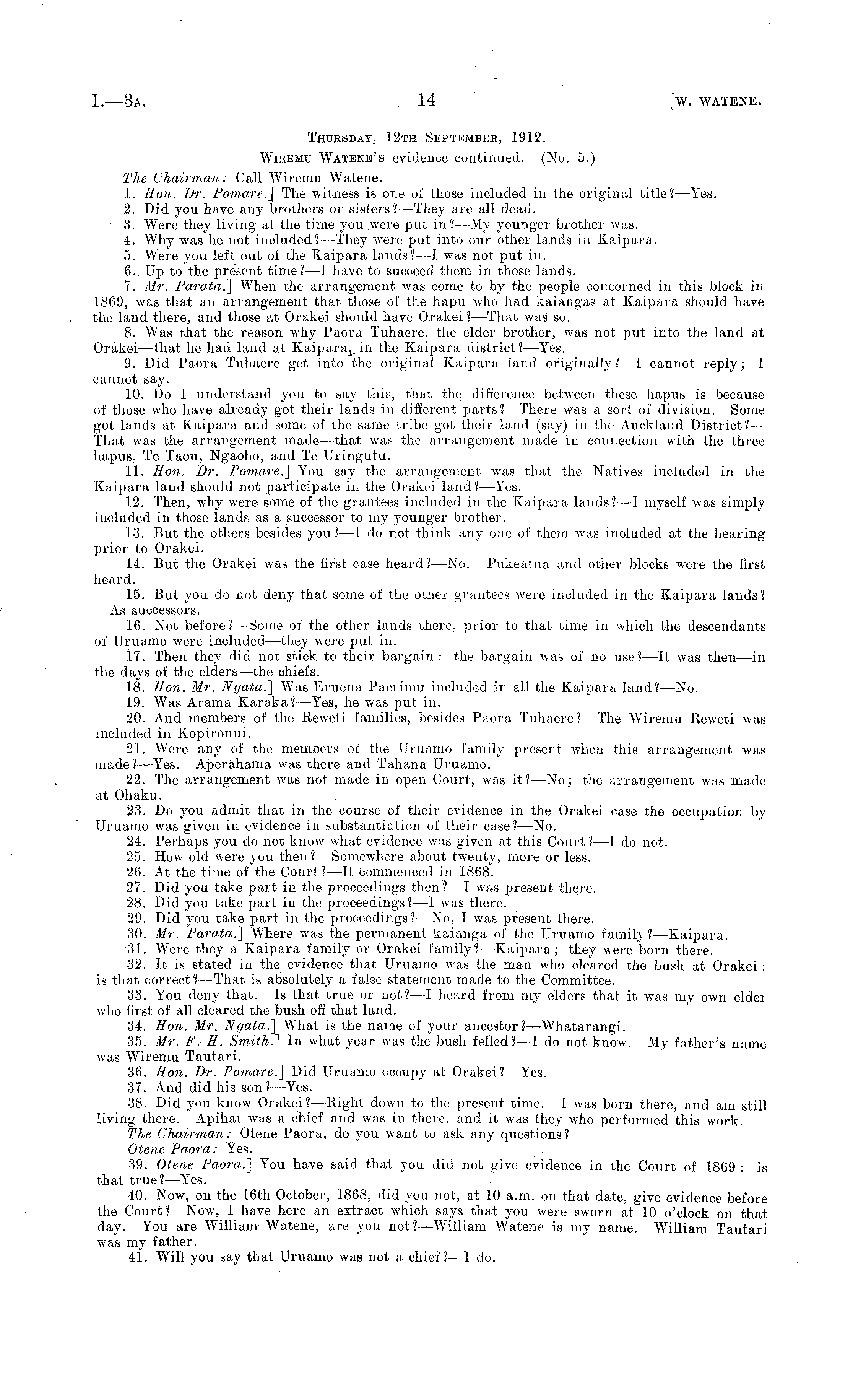 Thursday, 12th September, 1912. Wiremu Watenh's evidence continued. (No. 5.) The Chairman: Call Wiremu Watene. 1. Hon. Dr. The witness is one of those included in the original title? —Yes. 2. Did you have any brothers or sisters? —They are all dead. 3. Were they living at the time you were put in? —My younger brother was. 4. Why was he not included? —They were put into our other lands in Kaipara. 5. Were you left out of the Kaipara lands?—l was not put in. 6. Up to the present time? —I have to succeed them in those lands. 7. Mr. Parata.] When the arrangement was come to by the people concerned in this block in 1869, was that an arrangement that those of the hapu who had kaiangas at Kaipara should have the land there, and those at Orakei should have Orakei ? —That was so. 8. Was that the reason why Paora Tuhaere, the elder brother, was not put into the land at Orakei —that he had land at in the Kaipara district? —Yes. 9. Did Paora Tuhaere get into the original Kaipara land originally? —I cannot reply; I cannot say. 10. Do 1 understand you to say this, that the difference between these hapus is because of those who have already got their lands in different parts? There was a sort of division. Some got lands at Kaipara and some of the same tribe got their laud (say) in the Auckland District?— That was the arrangement made —that was the arrangement made in connection with the three hapus, Te Taou, Ngaoho, and Te Uringutu. 11. Hon. Dr. Pomare.] You say the arrangement was that the Natives included in the Kaipara land should not participate in the Orakei land?—Yes. 12. Then, why were some of the grantees included in the Kaipara lands?—l myself was simply included in those lands as a successor to my younger brother. 13. But the others besides you? —I do not think any one of them was included at the hearing prior to Orakei. 14. But the Orakei was the first case heard? —No. Pukeatua and other blocks were the first heard. 15. But you do not deny that some of the other grantees were included in the Kaipara lauds? —As successors. 16. Not before? —Some of the other lands there, prior to that time in which the descendants of Uruamo were included —they were put in. 17. Then they did not stick to their bargain : the bargain was of no use?—lt was then —in the days of the elders —the chiefs. 18. Hon. Mr. Ngata.] Was Eruena Paerimu included in all the Kaipara land? —No. 19. Was Arama Karaka? —Yes, he was put in. 20. And members of the Reweti families, besides Paora Tuhaere? —The Wiremu Reweti was included in Kopironui. 21. Were any of the members of the Uruamo family present when this arrangement was made? —Yes. Aperahama was there and Tahana Uruamo. 22. The arrangement was not made in open Court, was it? —No; the arrangement was made at Ohaku. 23. Do you admit that in the course of their evidence in the Orakei case the occupation by Uruamo was given in evidence in substantiation of their case?—No. 24. Perhaps you do not know what evidence was given at this Court? —I do not. 25. How old were you then? Somewhere about twenty, more or less. 26. At the time of the Court? —It commenced in 1868. 27. Did you take part in the proceedings then?—l was present there. 28. Did you take part in the proceedings?—l was there. 29. Did you take part in the proceedings?—No, I was present there. 30. Mr. Parata.] Where was the permanent kaianga of the Uruamo family?—Kaipara. 31. Were they a Kaipara family or Orakei family? —Kaipara; they were born there. 32. It is stated in the evidence that Uruamo was the man who cleared the bush at Orakei : is that correct? —That is absolutely a false statement made to the Committee. 33. You deny that. Is that true or not? —I heard from my elders that it was my own elder who first of all cleared the bush off that land. 34. Hon. Mr. Ngata.] What is the name of your ancestor?—Whatarangi. 35. Mr. F. H. Smith.] In what year was the bush felled? —I do not know. My father's name was Wiremu Tautari. 36. Hon. Dr. Pomare] Did Uruamo occupy at Orakei? —Yes. 37. And did his son? —Yes. 38. Did you know Orakei?—Right down to the present time. I was born there, and am still living there. Apihai was a chief and was in there, and it was they who performed this work. The Chairman: Otene Paora, do you want to ask any questions? Otene Paora: Yes. 39. Otene Paora.] You have said that you did not give evidence in the Court of 1869 : is that true? —Yes. 40. Now, on the 16th October, 1868, did you not, at 10 a.m. on that date, give evidence before the Court? Now, I have here an extract which says that you were sworn at 10 o'clock on that day. You are William Watene, are you not?—William Watene is my name. William Tautari was my father. 41. Will you say that Uruamo was not a chief? —I do.