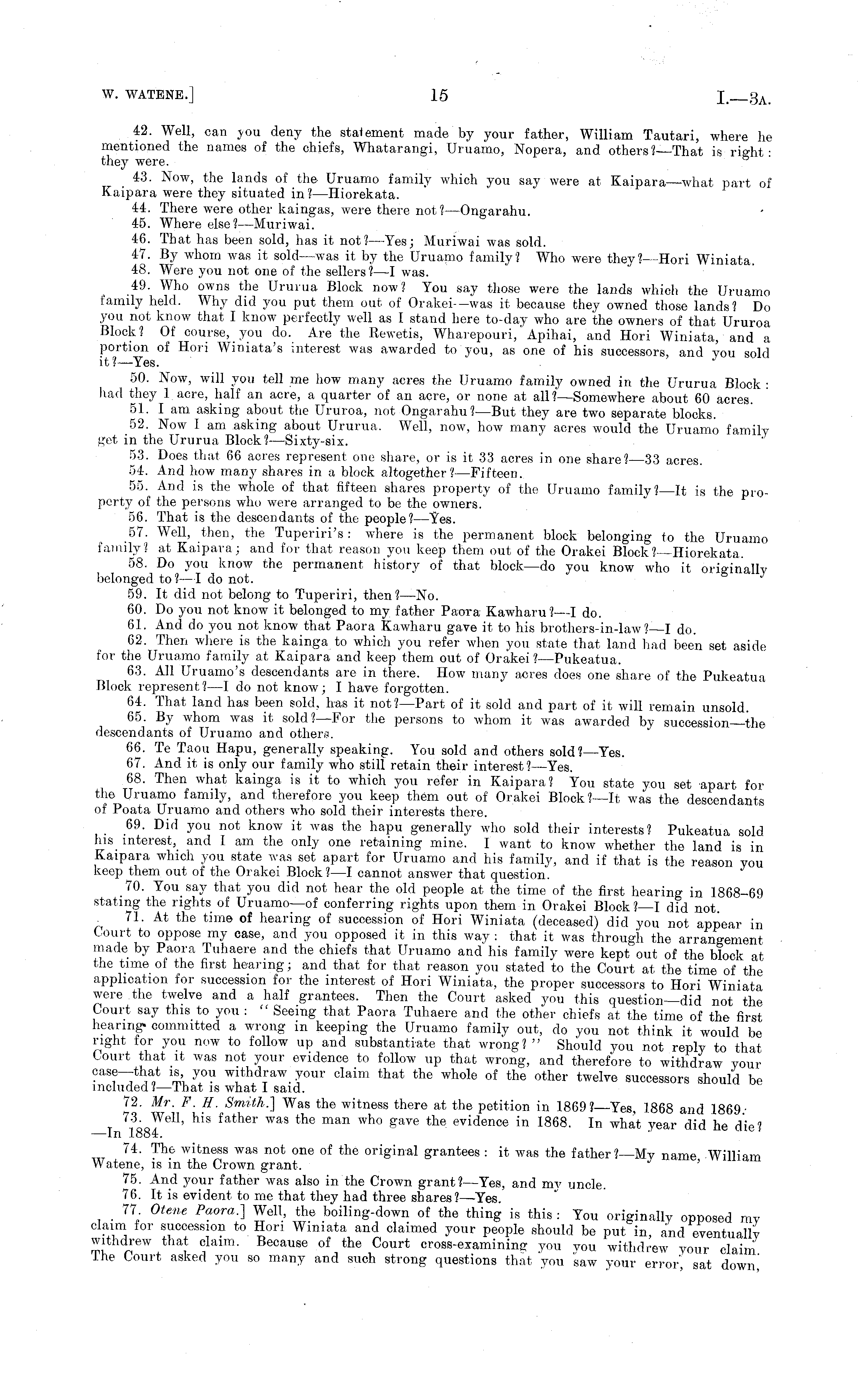 42. Well, can you deny the stalement made by your father, William Tautari, where he mentioned the names of the chiefs, Whatarangi, Uruamo, Nopera, and. others?—That is right: they were. 43. Now, the lands of the Uruamo family which you say were at Kaipara—what part of Kaipara were they situated in ? —Hiorekata. 44. There were other kaingas, were there not? —Ongarahu. 45. Where else?—Muriwai. 46. That has been sold, has it not?—Yes; Muriwai was sold. 47. By whom was it sold—was it by the Uruamo family? Who were they?—Hori Winiata. 48. AYere you not one of the sellers? —I was. 49. Who owns the Ururua Block now? You say those were the lands which the Uruamo family held. Why did you put them out of Orakei—was it because they owned those lands? Do you not know that I know perfectly well as I stand here to-day who are the owners of that Ururoa Block? Of course, you do. Are the Rewetis, Wharepouri, Apihai, and Hori Winiata, and a portion of Hori Winiata's interest was awarded to you, as one of his successors, and you sold it?—Yes. 50. Now, will you tell me how many acres the Uruamo family owned in the Ururua Block : had they 1 acre, half an acre, a quarter of an acre, or none at all?—Somewhere about 60 acres. 51. I am asking about the Ururoa, not Ongarahu?—But they are two separate blocks. 52. Now lam asking about Ururua. Well, now, how many acres would the Uruamo family get in the Ururua Block?—Sixty-six. 53. Does that 66 acres represent, one share, or is it 33 acres in one share? —33 acres. 54. And how many shares in a block altogether?—Fifteen. 55. And is the whole of that fifteen shares property of the Uruamo family?—lt is the property of the persons who were arranged to be the owners. 56. That is the descendants of the people?—Yes. 57. Well, then, the Tuperiri's : where is the permanent block belonging to the Uruamo family? at Kaipara; and for that reason you keep them out of the Orakei Block?—Hiorekata. 58. Do you know the permanent history of that block —do you know who it originally belonged to ?—I do not. •' 59. It did not belong to Tuperiri, then?—No. 60. Do you not know it belonged to my father Paora Kawharu?—l do. 61. And do you not know that Paora Kawharu gave it to his brothers-in-law ?—I do. 62. Then where is the kainga to which you refer when you state that land had been set aside for the Uruamo family at Kaipara and keep them out of Orakei ? —Pukeatua. 63. All Uruamo's descendants are in there. How many acres does one share of the Pukeatua Block represent?—l do not know; I have forgotten. 64. That land has been sold, has it not? —Part of it sold and part of it will remain unsold. 65. By whom was it sold?—For the persons to whom it was awarded by succession—the descendants of Uruamo and others. 66. Te Taou Hapu, generally speaking. You sold and others sold?—Yes. 67. And it is only our family who still retain their interest?—Yes. 68. Then what kainga is it to which you refer in Kaipara? You state you set apart for the Uruamo family, and therefore you keep them out of Orakei Block?—It was the descendants of Poata Uruamo and others who sold their interests there. 69. Did you not know it was the hapu generally who sold their interests? Pukeatua sold his mterest,_ and I am the only one retaining mine. I want to know whether the land is in Kaipara which you state was set apart for Uruamo and his family, and if that is the reason you keep them out of the Orakei Block ? —I cannot answer that question". 70. You say that you did not hear the old people at the time of the first hearing in 1868-69 stating the rights of Uruamo—of conferring rights upon them in Orakei Block?—I did not 71. At the time of hearing of succession of Hori Winiata (deceased) did you not appear in Court to oppose my case, and you opposed it in this way : that it was through the arrangement made by Paora Tuhaere and the chiefs that Uruamo and his family were kepfout of the block at the time of the first hearing; and that for that reason you stated to the Court at the time of the application for succession for the interest of Hori Winiata, the proper successors to Hori Winiata were the twelve and a half grantees. Then the Court asked vou this question—did not the Court say this to you : " Seeing that Paora Tuhaere and the other chiefs at the time of the first hearing* committed a wrong in keeping the Uruamo family out, do vou not think it would be right for you now to follow up and substantiate that wrong?" Should vou not reply to that Court that it was not your evidence to follow up that wrong, and therefore to withdraw your case—that is you withdraw your claim that the whole of the other twelve successors should be included?—That is what I said. 72. Mr. F. H. Smith.] Was the witness there at the petition in 1869?—Yes 1868 and 1869---r ™IWI'1 Wl ' hIS father was the man who gave the evidence in 1868. In what year did he die? —in 1884:. 74. The witness was not one of the original grantees :it was the father?—My name William Watene, is in the Crown grant. ' 75. And your father was also in the Crown grant?—Yes, and my uncle. 76. It is evident to me that they had three shares?—Yes. 77 Otene Paora.] Well, the boiling-down of the thing is this : You originally opposed mv claim for succession to Hon Winiata and claimed your people should be put in, and eventually withdrew that claim. Because of the Court cross-examining you vou withdrew your claim Ihe Court asked you so many and such strong questions that vou saw your error sat down'