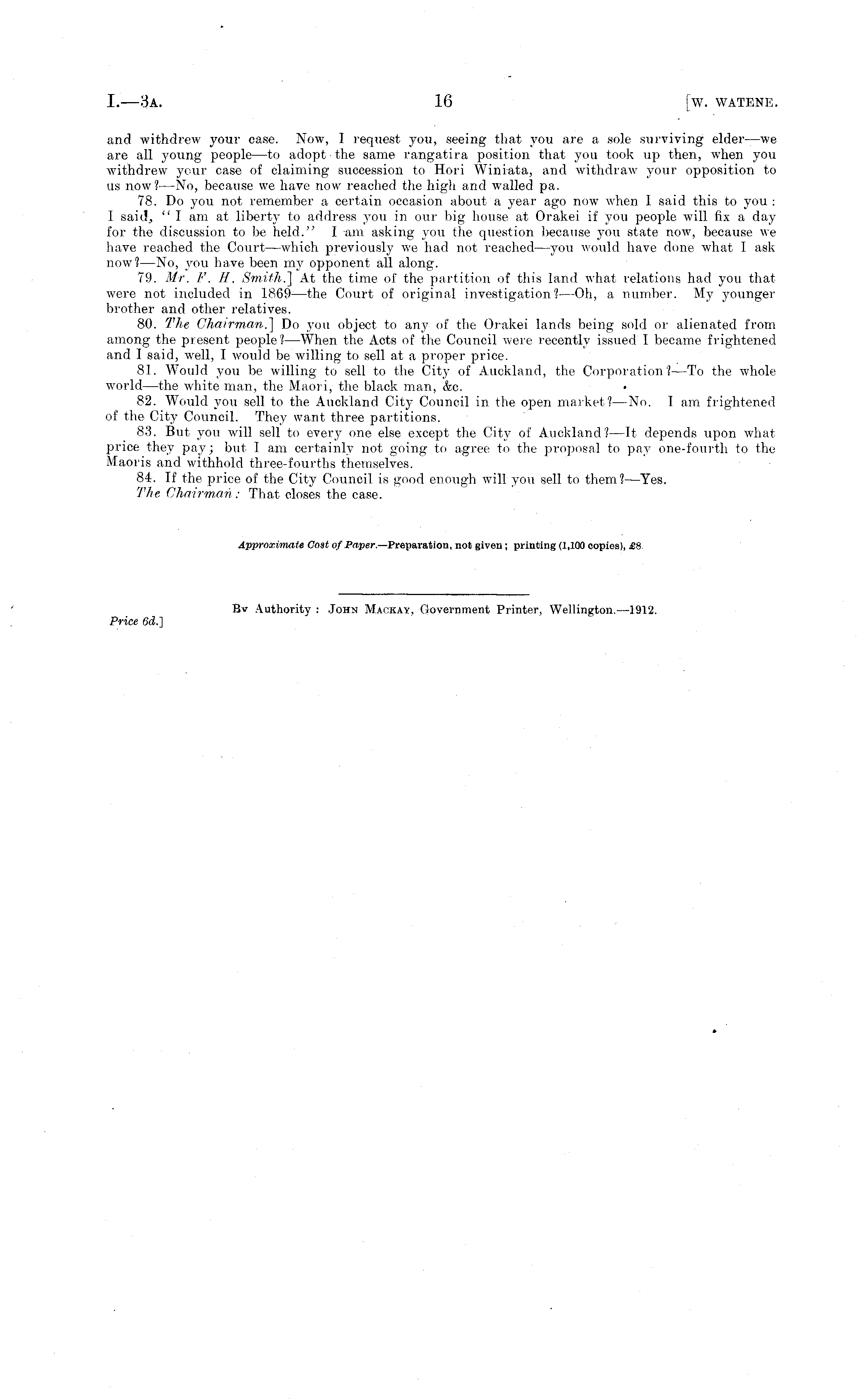 and withdrew your case. Now, I request you, seeing that you are a sole surviving elder—we are all young people—to adopt the same rangatira position that you took up then, when you withdrew your case of claiming succession to Hori Winiata, and withdraw your opposition to us now? —No, because we have now reached the high and walled pa. 78. Do you not remember a certain occasion about a year ago now when I said this to you : I saic!, " I am at liberty to address you in our big house at Orakei if you people will fix a day for the discussion to be held." I am asking you the question because you state now, because we have reached the Court —which previously we had not reached —you would have done what I ask now?—No, you have been my opponent all along. 79. Mr. F. H. Smith.] At the time of the partition of this land what relations had you that were not included in 1869—the Court of original investigation?—Oh, a number. My younger brother and other relatives. 80. The Chairman.] Do you object to any of the Orakei lands being sold or alienated from among the pi esent people ? —When the Acts of the Council were recently issued I became frightened and I said, well, I would be willing to sell at a proper price. 81. Would you be willing to sell to the City of Auckland, the Corporation?—To the whole world —the white man, the Maori, the black man, kc. 82. Would you sell to the Auckland City Council in the open market? —No. I am frightened of the City Council. They want three partitions. 83. But you will sell to every one else except the City of Auckland?—lt depends upon what price they pay; but I am certainly not going to agree to the proposal to pay one-fourth to the Maoris and withhold three-fourths themselves. 84. If the price of the City Council is good enough will you sell to them? —Yes. The Chairman : That closes the case.