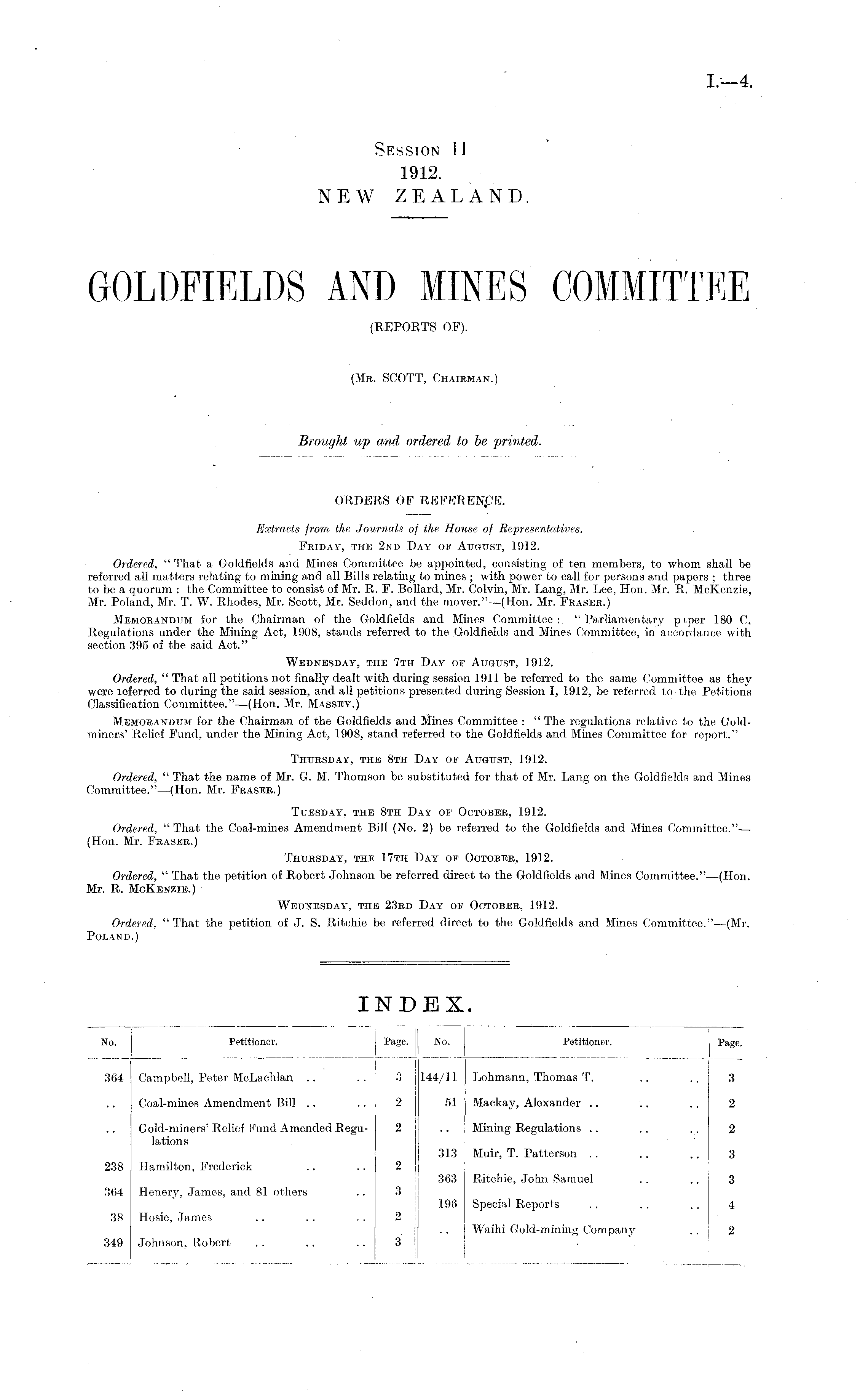 Brought up and ordered to be printed. ORDERS OF REFERENCE. Extracts from the. Journals of the House of Representatives. Friday, the 2nd Day of August, 1912. Ordered, " That a Goldfields and Mines Committee be appointed, consisting of ten members, to whom shall be referred all matters relating to mining and all Bills relating to mines ; with power to call for persons and papers ; three to be a quorum : the Committee to consist of Mr. R. F. Bollard, Mr. Colvin, Mr. Lang, Mr. Lee, Hon. Mr. R. McKenzie, Mr. Poland, Mr. T. W. Rhodes, Mr. Scott, Mr. Seddon, and the mover."—(Hon. Mr. Fraser.) Memorandum for the Chairman of the Goldfields and Mines Committee : " Parliamentary piper 180 C, Regulations under the Mining Act, 1.908, stands referred to the Goldfields and Mines Committee, in accordance with section 395 of the said Act." Wednesday, the 7th Day of August, 1912. Ordered, " That all potitions not finally dealt with during session 1911 be referred to the same Committee as they were leferred to during the said session, and all petitions presented during Session I, 1912, be referred to the Petitions Classification Committee."—(Hon. Mr. Massey.) Memorandum for the Chairman of the Goldfields and Mines Committee : " The regulations relative to the Goldminers' Relief Fund, under the Mining Act, 1908, stand referred to the Goldfields and Mines Committee for report." Thursday, the Bth Day or August, 1912. Ordered, " That the name of Mr. G. M. Thomson be substituted for that of Mr. Lang on the Goldfields and Mines Committee."—(Hon. Mr. Eraser.) Tuesday, the Bth Day oe October, 1912. Ordered, " That the Coal-mines Amendment Bill (No. 2) be referred to the Goldfields and Mines Committee."— (Hon. Mr. Fraser.) Thursday, the 17th Day of October, 1912. Ordered, " That the petition of Robert Johnson be referred direct to the Goldfields and Mines Committee."—(Hon. Mr. R. McKenzie.) Wednesday, the 23rd Day oe October, 1912. Ordered, "That the petition of J. S. Ritchie be referred direct to the Goldfields and Mines Committee."—(Mr. Poland.)