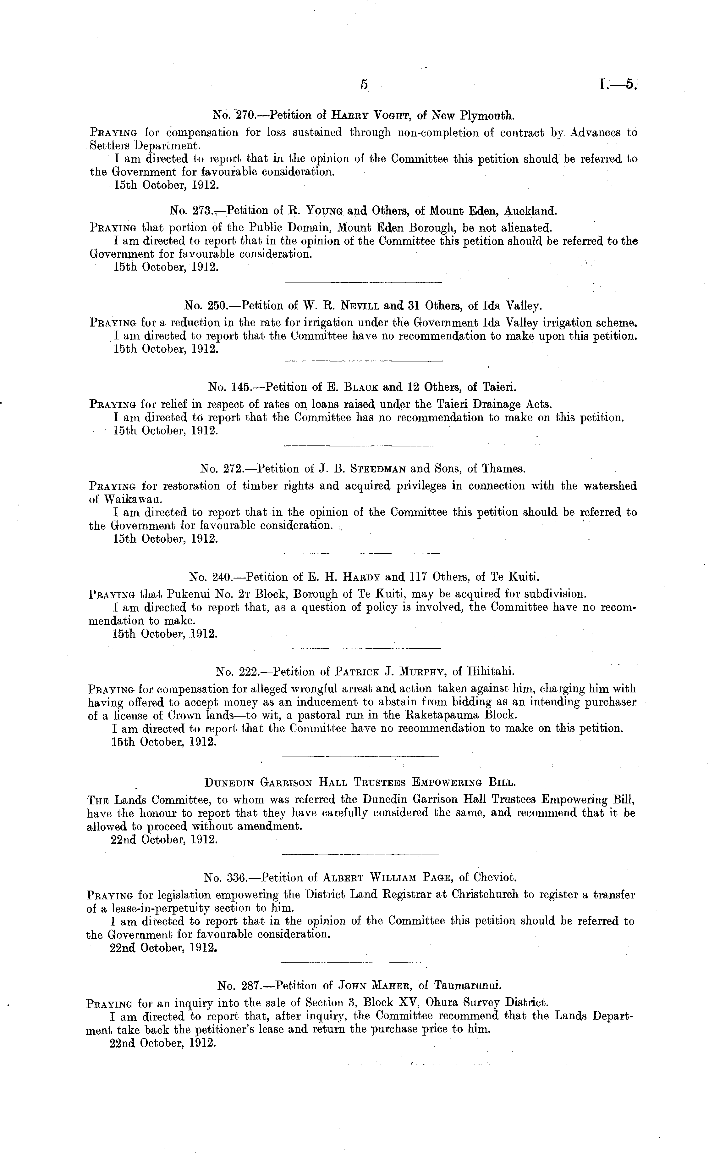 No. 270. —Petition of Haeey Voght, of New Plymouth. Pbaying for compensation for loss sustained through non-completion of contract by Advances to Settlers Department. I am directed to report that in the opinion of the Committee this petition should be referred to the Government for favourable consideration. 15th October, 1912. No. of E. Young and Others, of Mount Eden, Auckland. Praying that portion of the Public Domain, Mount Eden Borough, be not alienated. I am directed to report that in the opinion of the Committee this petition should be referred to the Government for favourable consideration. 15th October, 1912.