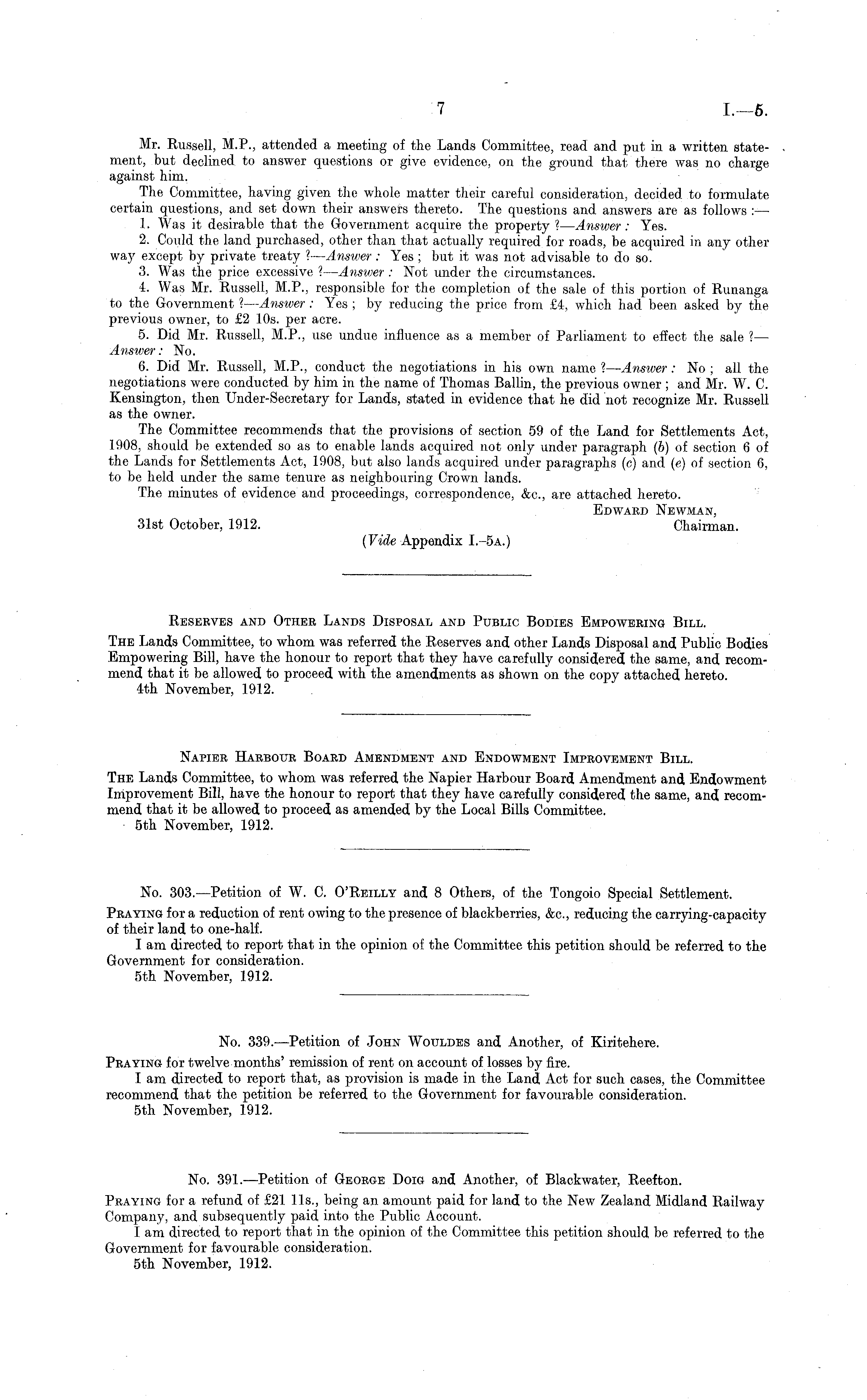 Mr. Russell, M.P., attended a meeting of the Lands Committee, read and put in a written statement, but declined to answer questions or give evidence, on the ground that there was no charge against him. The Committee, having given the whole matter their careful consideration, decided, to formulate certain questions, and set down their answers thereto. The questions and answers are as follows :— 1. Was it desirable that the Government acquire the property ?— Answer : Yes. 2. Could the land purchased, other than that actually required for roads, be acquired in any other way except by private treaty ? — Answer: Yes ; but it was not advisable to do so. 3. Was the price excessive ?— Answer : Not under the circumstances. 4. Was Mr. Russell, M.P., responsible for the completion of the sale of this portion of Runanga to the Government ?— Answer : Yes ; by reducing the price from £4, which had been asked by the previous owner, to £2 10s. per acre. 5. Did Mr. Russell, M.P., use undue influence as a member of Parliament to effect the sale ?— Answer: No. 6. Did Mr. Russell, M.P., conduct the negotiations in his own name ? — Answer: No ; all the negotiations were conducted by him in the name of Thomas Ballin, the previous owner ; and Mr. W. C. Kensington, then Under-Secretary for Lands, stated in evidence that he did not recognize Mr. Russell as the owner. The Committee recommends that the provisions of section 59 of the Land for Settlements Act, 1908, should be extended so as to enable lands acquired not only under paragraph (b) of section 6 of the Lands for Settlements Act, 1908, but also lands acquired under paragraphs (c) and (e) of section 6, to be held under the same tenure as neighbouring Crown lands. The minutes of evidence and proceedings, correspondence, &c, are attached hereto. Edward Newman, 31st October, 1912. Chairman. (Vide Appendix 1.-5a.)