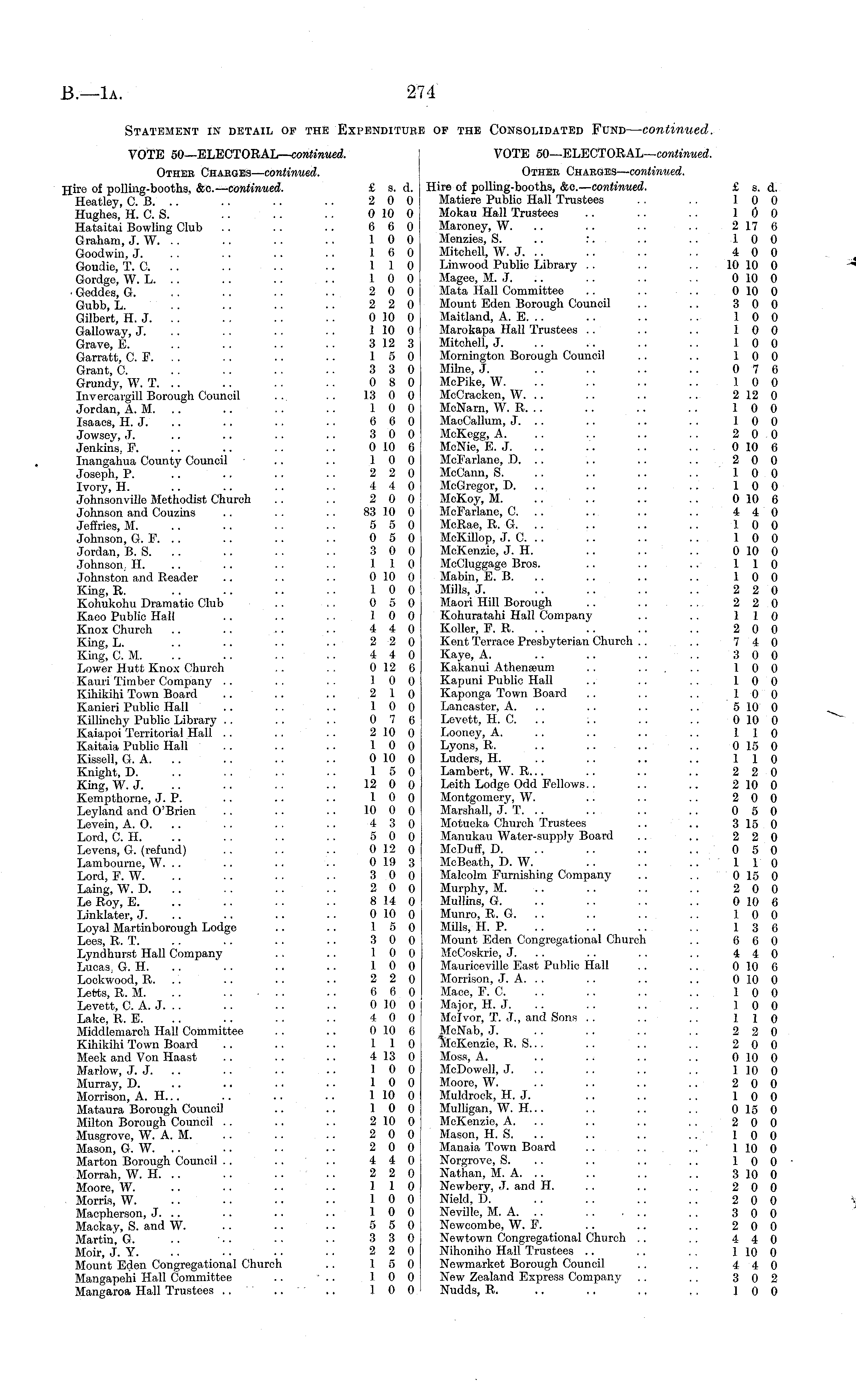Statement in detail of the Expenditure of the Consolidated Fund — continued. VOTE 50—ELECTORAL— continued. VOTE 50—ELECTORAL— continued. Otheb Charges— continued. Other Charges— continued. Hire of polling-booths, &o. — continued. £ s. d. Hire of polling-booths, &c— continued. £ a. d. Heatley, C. B. .. .. .. .. 2 0 0 Matiere Public Hall Trustees .. .. 10 0 Hughes, H. C. S. .. .. .. 010 0 Mokau Hall Trustees .. .. . . 1 0 0 Hataitai Bowling Club .. .. . . 6 6 0 Maroney, W. .. .. .. .. 217 6 Graham, J. W. .. .. .. . . 10 0 Menzies, S. .. :. .. .. 10 0 Goodwin, J. . . . . .. .. 1 (i 0 Mitchell, W. J. .. .. .. . . 4 0 0 Goudie, T. C. .. .. .. •. 110 Linwood Public Library .. .. .. 10 10 0 Gordge, W. L. .. .. .. .. 10 0 Magee, M. J. .. . . .. .. 010 0 ■ Geddes, G. . . .. .. .. 2 0 0 Mata Hall Committee .. .. .. 010 0 Gubb, L. .. . . .. .. 2 2 0 Mount Eden Borough Council .. .. 3 0 0 Gilbert, H. J. . . . . .. .. 010 0 Maitland, A. E. .. .. .. .. 10 0 Galloway, J. .. .. . . .. 110 0 Marokapa Hall Trustees .. .. .. 10 0 Grave, E. . . .. .. .. 312 3 Mitchell, J. .. .. .. . . 10 0 Garratt, C. F. .. .. .. .. 15 0 Mornington Borough Council .. . . 10 0 Grant, C. .. .. .. •. 3 3 0 Milne, J. .. .. .. .. 0 7 6 Grundy, W. T. .. .. . . .. 0 8 0 McPike, W. .. .. .. .. 10 0 Invercargill Borough Council . . .. 13 0 0 McCracken, W. .. .. .. .. 212 0 Jordan, A. M. .. .. .. .. 10 0 McNarn, W. R. .. .. .. .. 10 0 Isaacs, H. J. .. .. .. .. 6 6 0 MacCallum, J. .. .. .. .. 10 0 Jowsey, J. .. .. . . .. 3 0 0 McKegg, A. .. .. .. .. 2 0 0 Jenkins, F. .. .. .. .. 010 6 McNie, E.J... .. .. .. 010 6 Inangahua County Council .. .. 10 0 McFarlane, D. .. .. .. .. 2 0 0 Joseph, P. .. .. .. .. 2 2 0 McCann, S. .. .. .. . . 10 0 Ivory, H. .. .. .. .. 4 4 0 McGregor, D. .. .. .. .. 10 0 Johnsonville Methodist Church .. .. 2 0 0 McKoy, M. .. .. .. .. 0 10 6 Johnson and Couzins .. .. . . 83 10 0 McFarlane, C. .. .. .. .. 4 4 0 Jeffries, M. .. .. . . .. 5 5 0 Mcßae, R. G. .. .. .. .. 10 0 Johnson, G. F. .. .. .. .. 0 5 0 McKillop, J. C. .. .. .. .. 10 0 Jordan, B. S. .. . . .. 3 0 0 McKenzie, J. H. .. .. .. 010 0 Johnson. H. .. .. .. .. 110 McCluggage Bros. .. .. .. 110 Johnston and Reader .. . . .. 010 0 Mabin, E. B. .. .. .. .. 10 0 King, R. .. .. .. .. 10 0 Mills, J. .. .. .. ..220 Kohukohu Dramatic Club .. . . 0 5 0 Maori Hill Borough .. .. .. 2 2 0 Kaeo Public Hall .. .. . . 10 0 Kohuratahi Hall Company .. .. 110 Knox Church .. .. . . .. 4 4 0 Koller, F. R. .. .. . . .. 2 0 0 King, L. .. .. .. • • 2 2 0 Kent Terrace Presbyterian Church .. .. 7 4 0 King, CM. .. .. . . . . 4 4 0 Kaye, A. .. .. .. . . 3 0 0 Lower Hutt Knox Church .. .. 012 6 Kakanui Athenaeum .. .. .. 10 0 Kauri Timber Company .. . . .. 10 0 Kapuni Public Hall .. .. .. 10 0 Kihikihi Town Board .. .. .. 2 10 Kaponga Town Board .. .. . . 10 0 Kanieri Public Hall .. .. .. 10 0 Lancaster, A. .. .. .. .. 510 0 Killinchy Public Library .. .. .. 0 7 6 Levett, H. C. .. :. .. .. 010 0 Kaiapoi Territorial Hall .. .. .. 210 0 Looney, A. .. .. .. .. 110 Kaitaia Public Hall .. .. .. 10 0 Lyons, R. .. .. .. .. 015 0 Kissell, G. A. .. .. .. .. 010 0 Luders, H. .. .. .. .. 110 Knight, D. .. . . .. .. 15 0 Lambert, W. R... .. .. .. 2 2 0 King, W. J. .. .. .. .. 12 0 0 Leith Lodge Odd Fellows.. .. .. 2 10 0 Kempthorne, J. P. .. .. .. 10 0 Montgomery, W. .. .. .. 2 0 0 Leyland and O'Brien .. .. .. 10 0 0 Marshall, J. T. .. .. .. .. 0 5 0 Levein, A. O. .. .. . . .. 4 3 0 Motueka Church Trustees .. .. 315 0 Lord, C. H. .. .. .. .. 5 0 0 Manukau Water-supply Board .. .. 2 2 0 Levens, G. (refund) .. .. .. 012 0 McDuff, D. .. .. .. .. 0 5 0 Lambourne, W. .. .. .. .. 019 3 Mcßeath, D. W. .. .. .. 110 Lord, F. W. .. .. . . .. 3 0 0 Malcolm Furnishing Company .. .. 015 0 Laing, W. D. .. .. .. .. 2 0 0 Murphy, M. .. .. .. .. 2 0 0 Le Roy, E. .. .. .. .. 814 0 Mullins, G. .. .. .. .. 010 6 Linklater, J. .. .. .. 010 0 Munro, R. G. .. .. .. .. 10 0 Loyal Martinborough Lodge .. .. 15 0 Mills, H. P. .. .. .. . . 13 6 Lees, R. T. .. .. .. .. 3 0 0 Mount Eden Congregational Church .. 6 6 0 Lyndhurst Hall Company .. .. 10 0 McCoskrie, J. .. .. .. 4 4 0 Lucas. G. H. .. .. .. .. 10 0 Mauriceville East Public Hall .. .. 010 6 Lockwood, R. .. .. .. .. 2 2 0 Morrison, J. A. . . .. .. .. 010 0 Letts, R. M. .. .. 6 6 0 Mace, F. C. . . .. .. . . 10 0 Levett, C. A. J. .. .. .. .. 010 0 Major, H. J. .. .. .. .. 10 0 Lake, R. E. .. .. .. . ■ 4 0 0 Mclvor, T. J., and Sons .. .. .. 110 Middlemarch Hall Committee . . .. 0 10 6 McNab, J. .. .. . . . . 2 2 0 Kihikihi Town Board .. .. .. 110 McKenzie, R. 5... .. .. .. 2 0 0 Meek and Yon Haast .. .. .. 413 0 Moss, A. .. .. .. . . 010 0 Marlow, J. J. .. .. .. .. 10 0 McDowell, J. .. .. .. 1 10 0 Murray, D. .. .. .. .. 10 0 Moore, W. .. .. .. .. 2 0 0 Morrison, A. H... .. .. .. 1 10 0 Muldrock, H. J. .. .. .. 10 0 Mataura Borough Council .. .. 10 0 Mulligan, W. H... .. .. .. 015 0 Milton Borough Council .. .. .. 2 10 0 McKenzie, A. .. .. .. 2 0 0 Musgrove, W. A. M. .. .. .. 2 0 0 Mason, H. S. .. .. .. .. 10 0 Mason, G. W. .. • • • • • • 2 0 0 Manaia Town Board .. .. . . 110 0 Marton Borough Council .. .. .. 4 4 0 Norgrove, S. .. .. .. .. 10 0 Morrah, W. H. .. .. .. .. 2 2 0 Nathan, M. A. .. .. .. .. 310 0 Moore, W. .. .. .. •. 110 Newbery, J. and H. .. .. .. 2 0 0 Morris, W. .. .. • • • • 10 0 Nield, D. .. .. .. .. 2 0 0 Macpherson, J. .. .. .. .. 10 0 Neville, M. A. .. . . 3 0 0 Mackay, S. and W. .. .. .. 5 5 0 Newcombe, W. F. .. .. .. 2 0 0 Martin, G. .. ■ • • • • • • 3 3 0 Newtown Congregational Church .. . . 4 4 0 Moir, J. Y. .. • • • • • • 2 2 0 Nihoniho Hall Trustees .. .. .. 1 10 0 Mount Eden Congregational Church .. 15 0 Newmarket Borough Council .. . . 4 4 0 Mangapehi Hall Committee .. ■.. 10 0 Now Zealand Express Company .. . . 30 2 Mangaroa Hall Trustees .. .. .. 10 0 Nudds, R. .. ~ ~ ~ 10 0