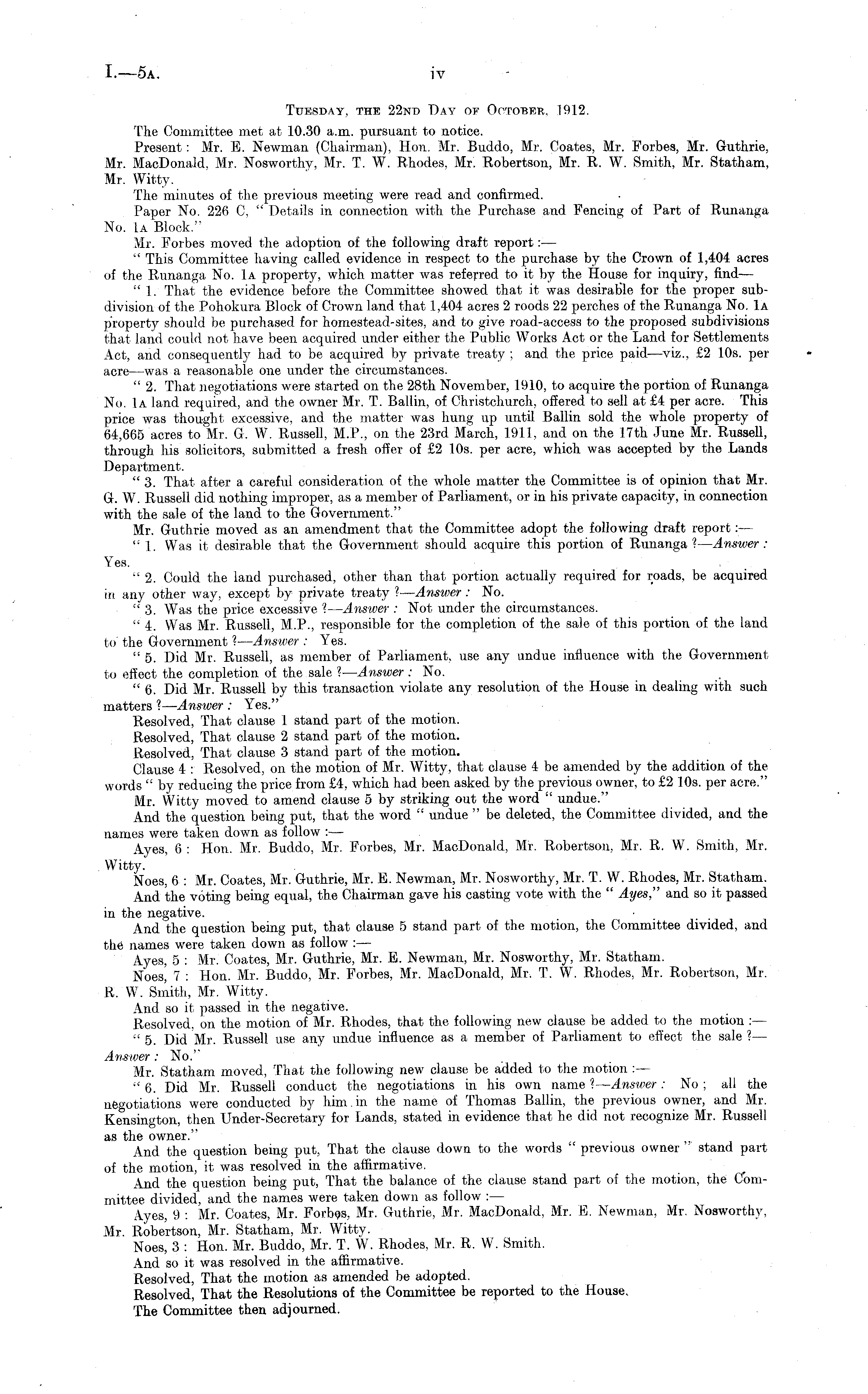 Tuesday, the 22nd Day op October, 1912. The Committee met at 10.30 a.m. pursuant to notice. Present: Mr. E. Newman (Chairman), Hon. Mr. Buddo, Mr. Coates, Mr. Forbes, Mr. Guthrie, Mr. MacDonald, Mr. Nosworthy, Mr. T. W. Rhodes, Mr. Robertson, Mr. R. W. Smith, Mr. Statham, Mr. Witty. The minutes of the previous meeting were read and confirmed. Paper No. 226 C, " Details in connection with the Purchase and Fencing of Part of Runanga No. I a Block." Mr. Forbes moved the adoption of the following draft report: — " This Committee having called evidence in respect to the purchase by the Crown of 1,404 acres of the Runanga No. 1a property, which matter was referred to it by the House for inquiry, find — " 1. That the evidence before the Committee showed that it was desirable for the proper subdivision of the Pohokura Block of Crown land that 1,404 acres 2 roods 22 perches of the Runanga No. 1a property should be purchased for homestead-sites, and to give road-access to the proposed subdivisions that land could not have been acquired under either the Public Works Act or the Land for Settlements Act, and consequently had to be acquired by private treaty ; and the price paid—viz., £2 10s. per acre —was a reasonable one under the circumstances. " 2. That negotiations were started on the 28th November, 1910, to acquire the portion of Runanga No. 1a land required, and the owner Mr. T. Ballin, of Christchurch, offered to sell at £4 per acre. This price was thought excessive, and the matter was hung up until Ballin sold the whole property of 64,665 acres to Mr. G. W. Russell, M.P., on the 23rd March, 1911, and on the 17th June Mr. Russell, through his solicitors, submitted a fresh offer of £2 10s. per acre, which was accepted by the Lands Department. "3. That after a careful consideration of the whole matter the Committee is of opinion that Mr. G. W. Russell did nothing improper, as a member of Parliament, or in his private capacity, in connection with the sale of the land to the Government." Mr. Guthrie moved as an amendment that the Committee adopt the following draft report: — " 1. Was it desirable that the Government should acquire this portion of Runanga? — Answer : Yes. "2. Could the land purchased, other than that portion actually required for roads, be acquired in any other way, except by private treaty ?— Answer : No. " 3. Was the price excessive ?— Answer : Not under the circumstances. " 4. Was Mr. Russell, M.P., responsible for the completion of the sale of this portion of the land to' the Government ?— Answer : Yes. " 5. Did Mr. Russell, as member of Parliament, use any undue influence with the Government to effect the completion of the sale ?— Answer : No. " 6. Did Mr. Russell by this transaction violate any resolution of the House in dealing with such matters ? — Answer : Yes." Resolved, That clause 1 stand part of the motion. Resolved, That clause 2 stand part of the motion. Resolved, That clause 3 stand part of the motion. Clause 4 : Resolved, on the motion of Mr. Witty, that clause 4 be amended by the addition of the words " by reducing the price from £4, which had been asked by the previous owner, to £2 10s. per acre." Mr. Witty moved to amend clause 5 by striking out the word " undue." And the question being put, that the word " undue " be deleted, the Committee divided, and the names were taken down as follow :— Ayes, 6 : Hon. Mr. Buddo, Mr. Forbes, Mr. MacDonald, Mr. Robertson, Mr. R. W. Smith, Mr. Witty. Noes, 6 : Mr. Coates, Mr. Guthrie, Mr. E. Newman, Mr. Nosworthy, Mr. T. W. Rhodes, Mr. Statham. And the voting being equal, the Chairman gave his casting vote with the " Ayes," and so it passed in the negative. ■ And the question being put, that clause 5 stand part of the motion, the Committee divided, and the names were taken down as follow : — Ayes, 5 : Mr. Coates, Mr. Guthrie, Mr. E. Newman, Mr. Nosworthy, Mr. Statham. Noes, 7 : Hon. Mr. Buddo, Mr. Forbes, Mr. MacDonald, Mr. T. W. Rhodes, Mr. Robertson, Mr. R. W. Smith, Mr. Witty. And so it passed in the negative. Resolved, on the motion of Mr. Rhodes, that the following new clause be added to the motion : — "'5. Did Mr. Russell use any undue influence as a member of Parliament to effect the sale ?— Answer : No." Mr. Statham moved, That the following new clause be added to the motion : — "6. Did Mr. Russell conduct the negotiations in his own name ? — Answer : No ; all the negotiations were conducted by him. in the name of Thomas Ballin, the previous owner, and Mr. Kensington, then Under-Secretary for Lands, stated in evidence that be did not recognize Mr. Russell as the owner." And the question being put, That the clause down to the words " previous owner " stand part of the motion, it was resolved in the affirmative. And the question being put, That the balance of the clause stand part of the motion, the Committee divided, and the names were taken down as follow : — Ayes, 9 : Mr. Coates, Mr. Forbes, Mr. Guthrie, Mr. MacDonald, Mr. E. Newman, Mr. Nosworthy, Mr. Robertson, Mr. Statham, Mr. Witty. Noes, 3 : Hon. Mr. Buddo, Mr. T. W. Rhodes, Mr. R. W. Smith. And so it was resolved in the affirmative. Resolved, That the motion as amended be adopted. Resolved, That the Resolutions of the Committee be reported to the House, The Committee then adjourned.